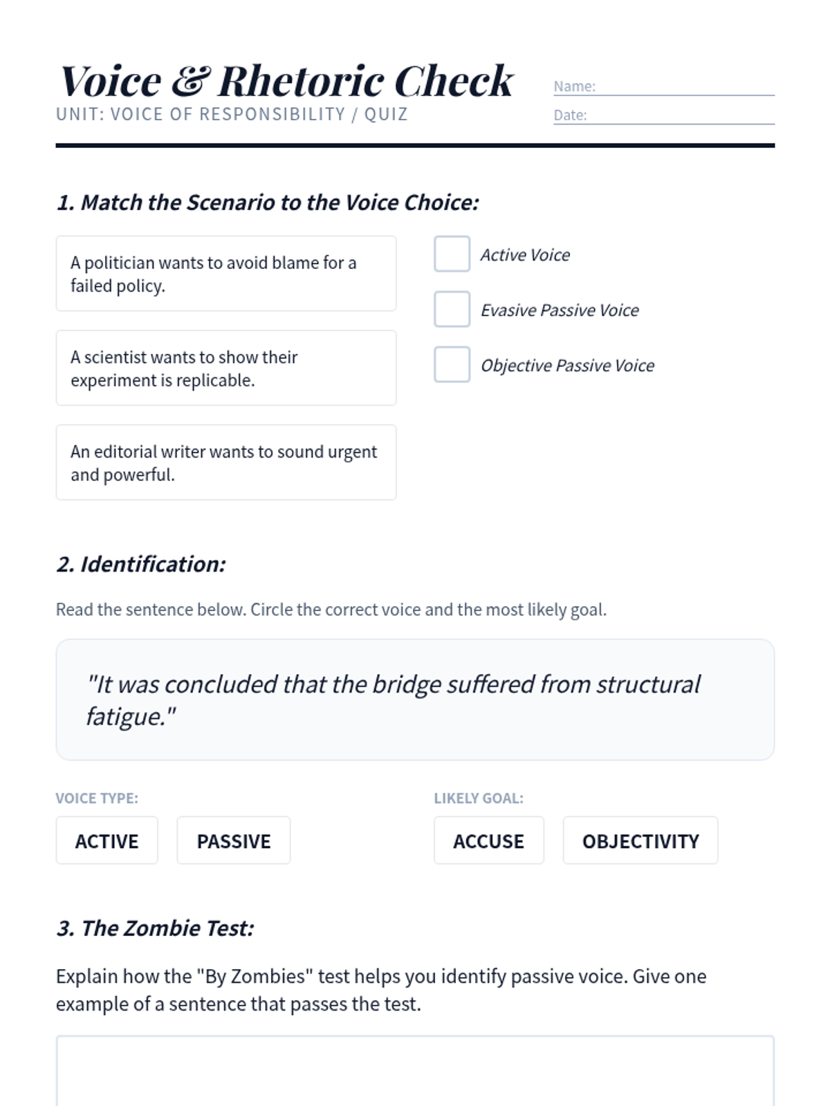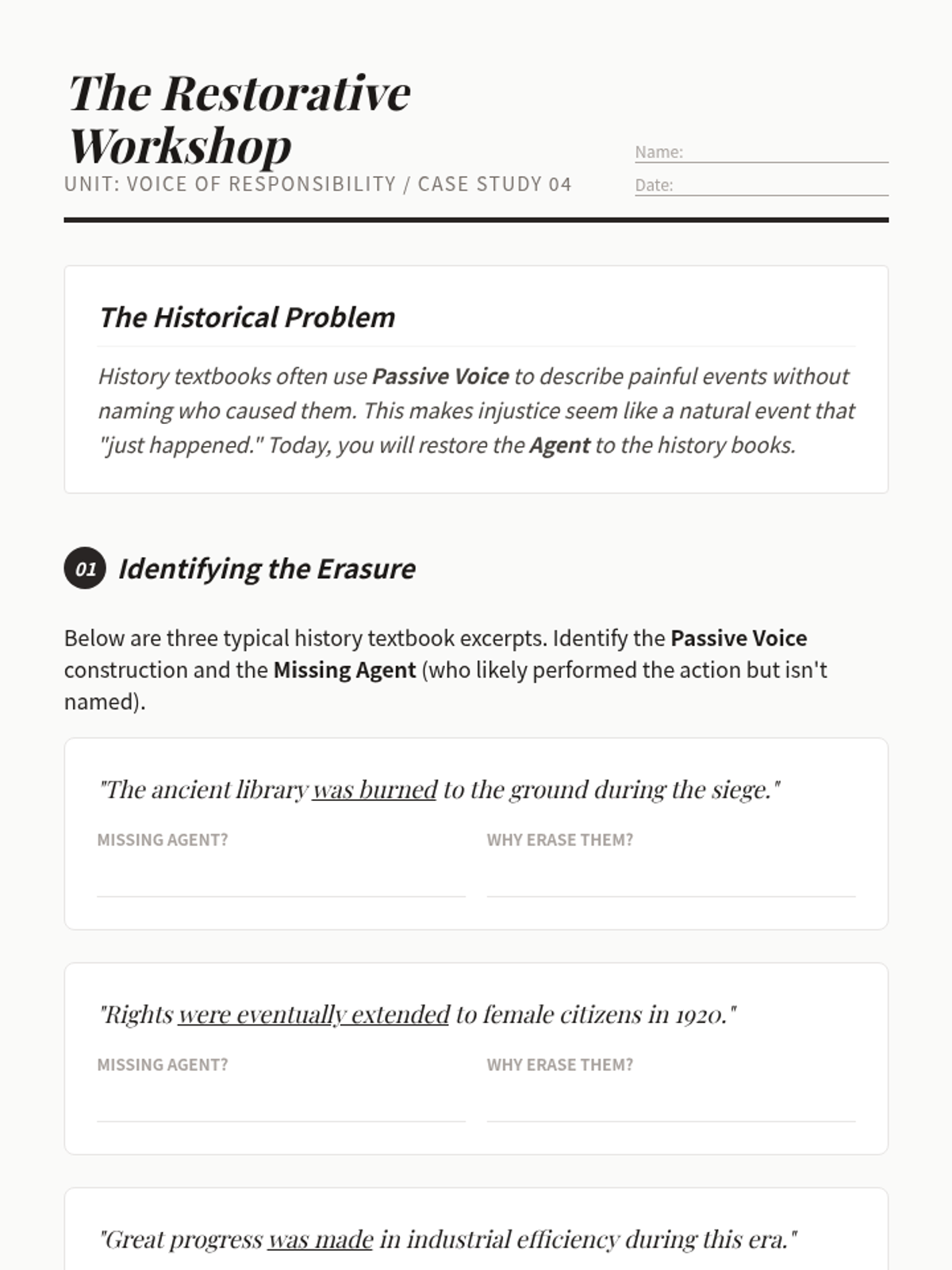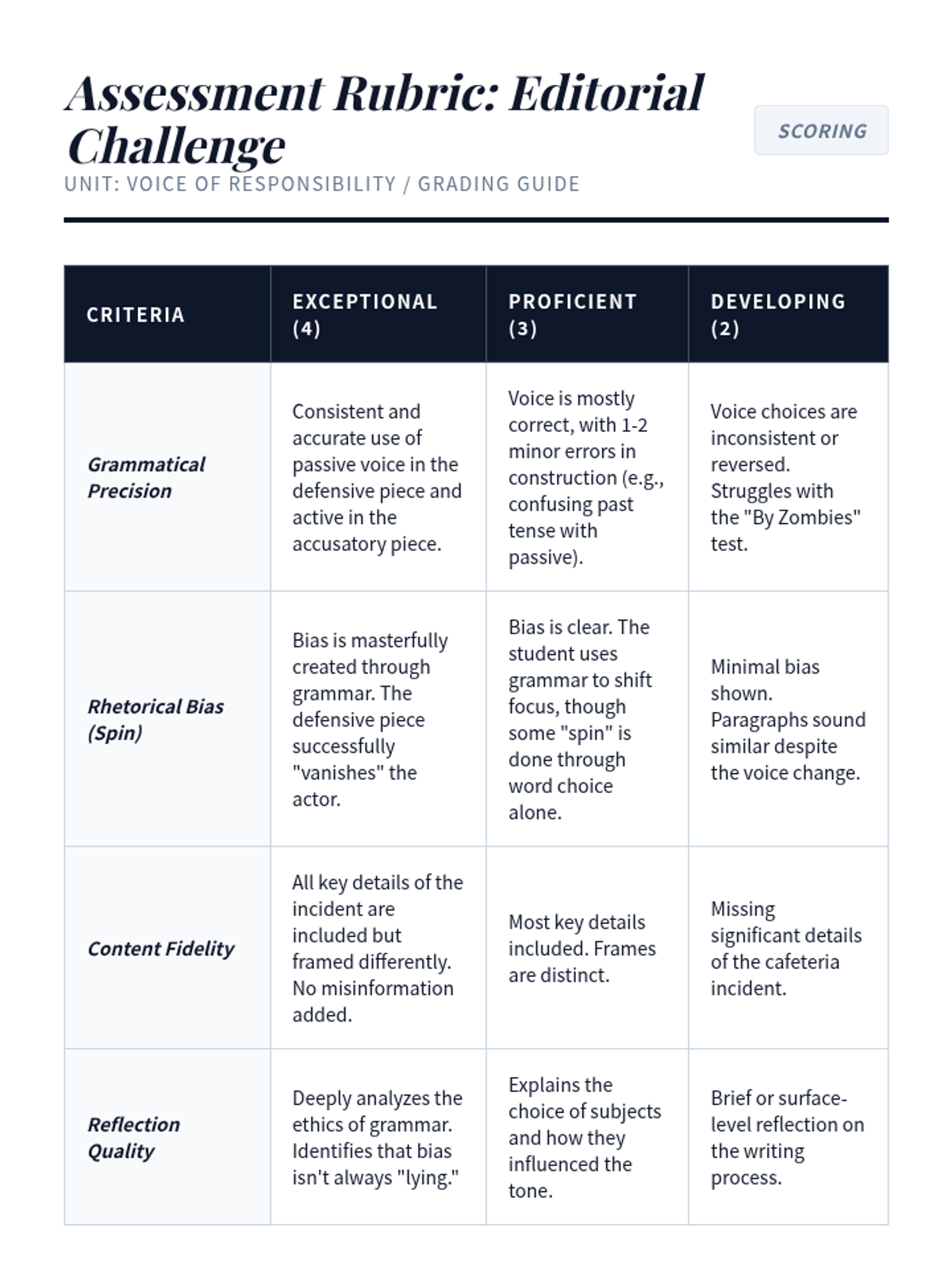 A 9th-grade ELA sequence exploring the rhetorical power of active and passive voice in journalism, politics, and science. Students investigate how sentence structure can be used to deflect blame, establish objectivity, or frame historical narratives.