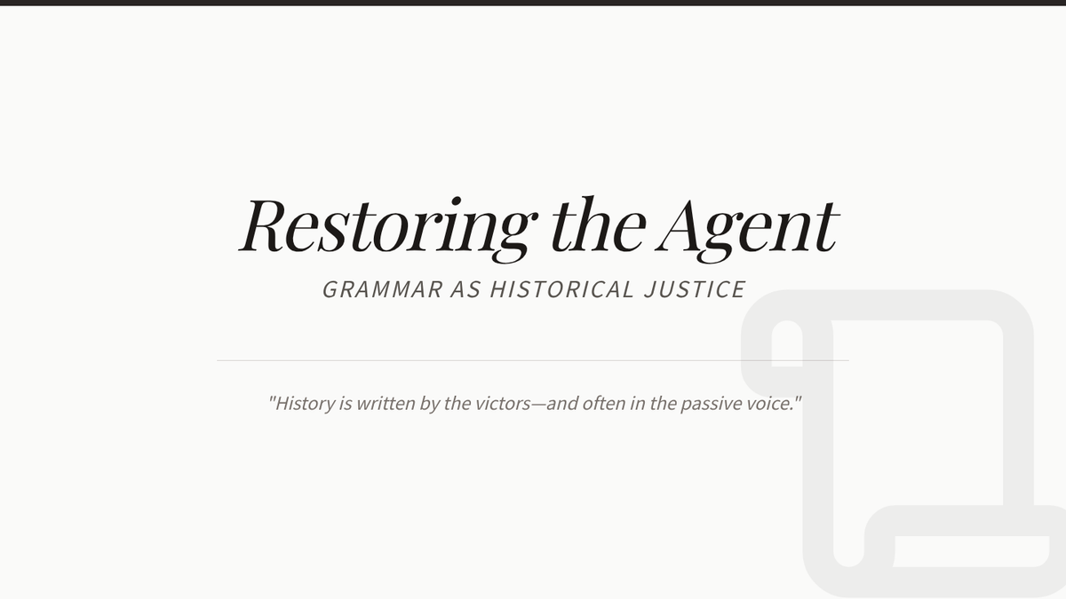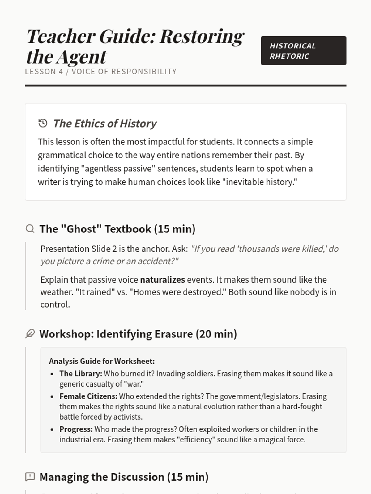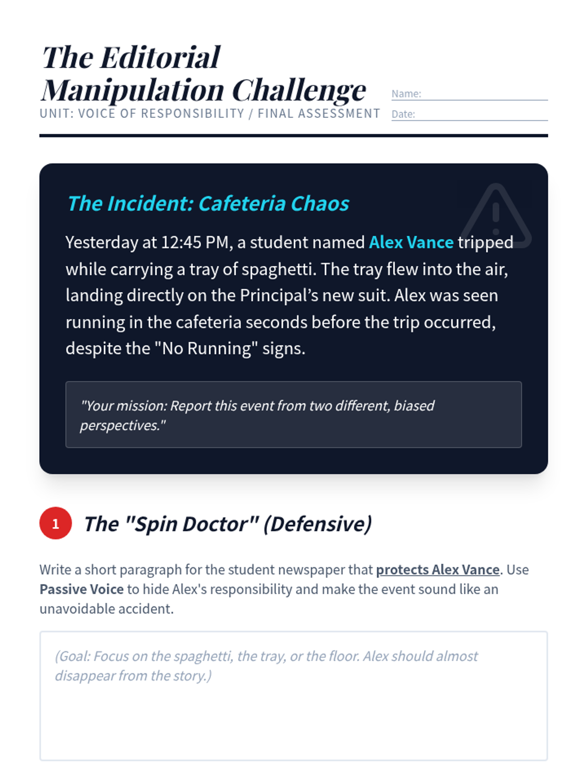 A 9th-grade ELA sequence exploring the rhetorical power of active and passive voice in journalism, politics, and science. Students investigate how sentence structure can be used to deflect blame, establish objectivity, or frame historical narratives.
