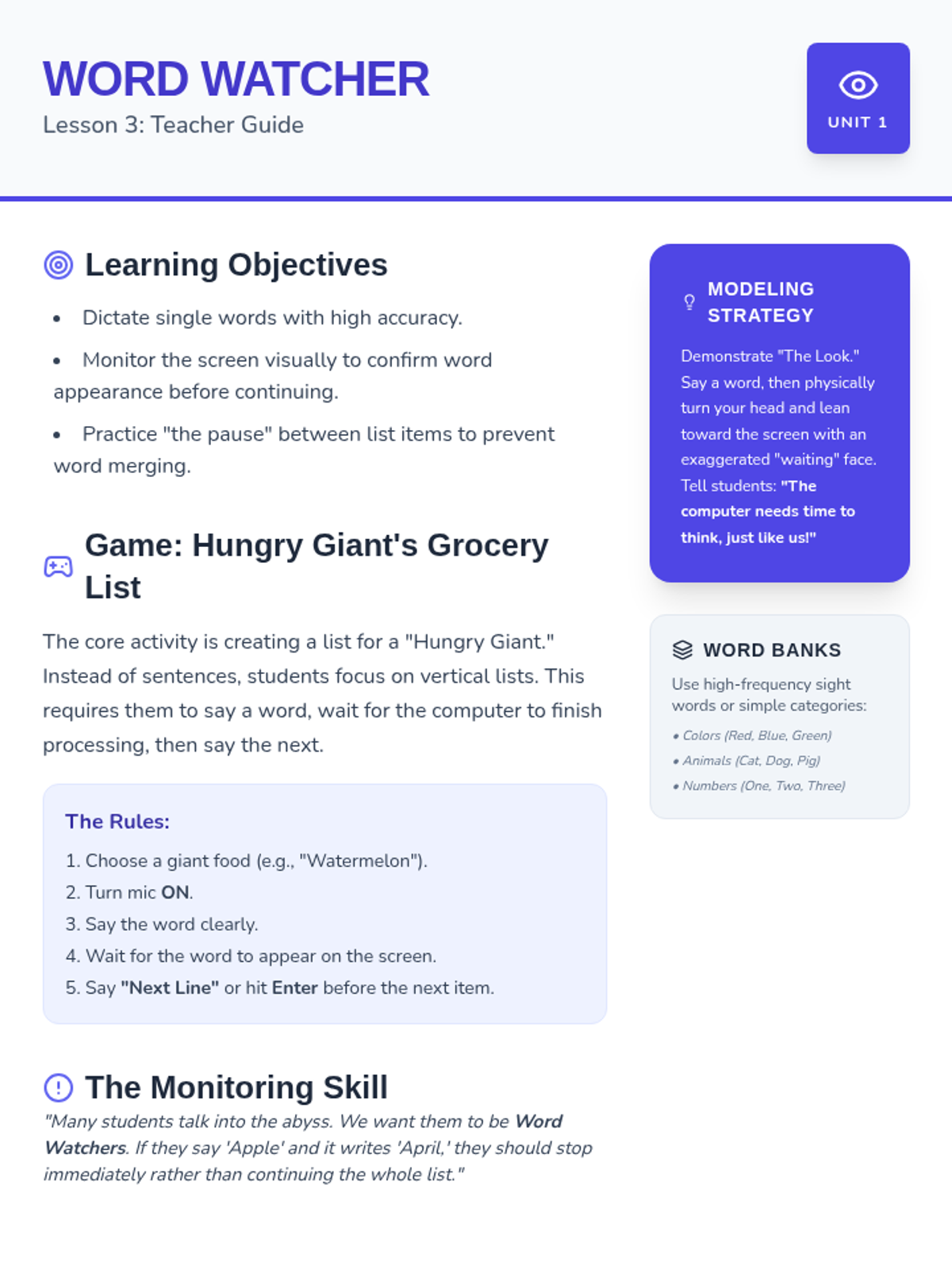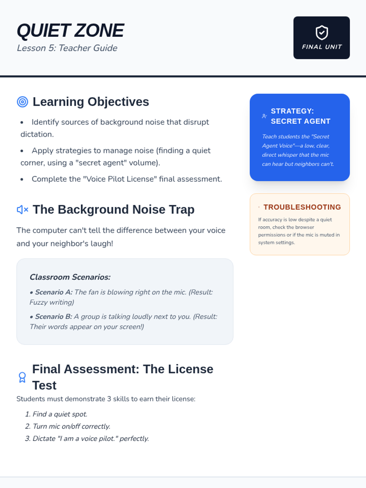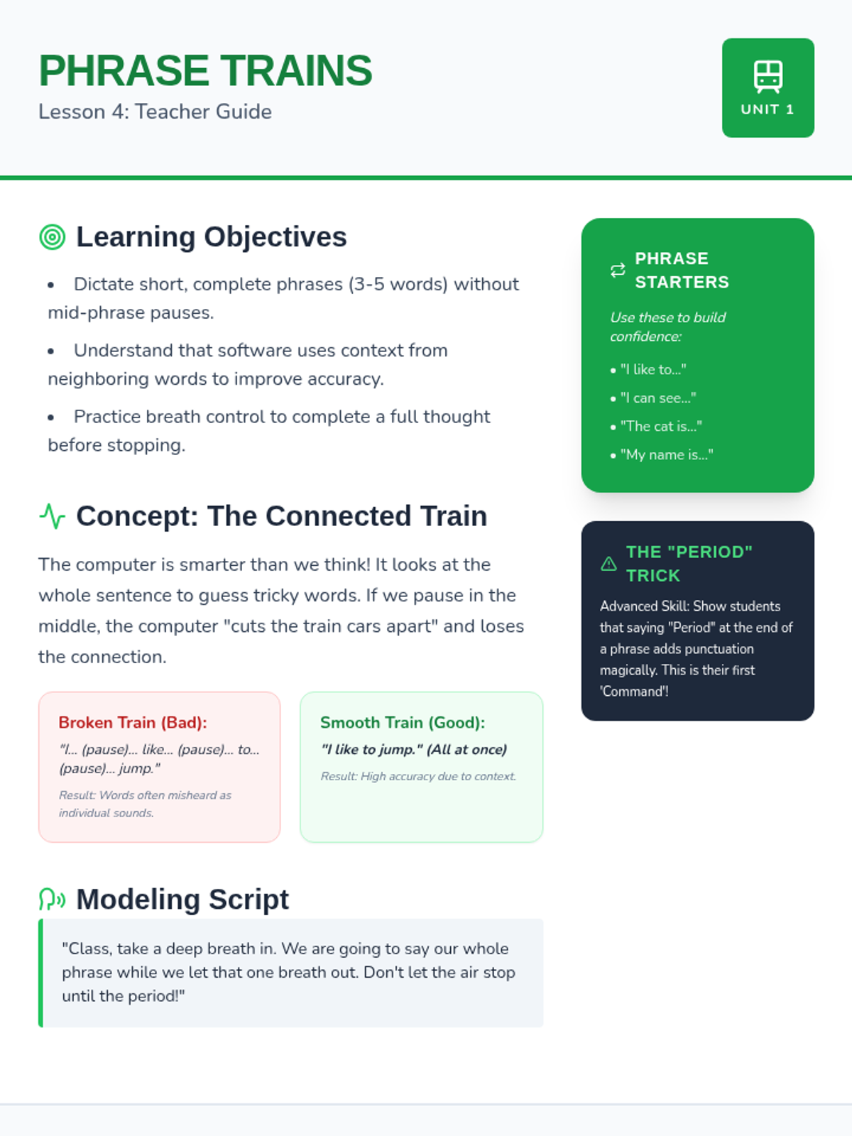 A 5-lesson sequence for 2nd grade students to master the foundational skills of speech-to-text technology, focusing on hardware usage, voice control, pacing, and troubleshooting.
