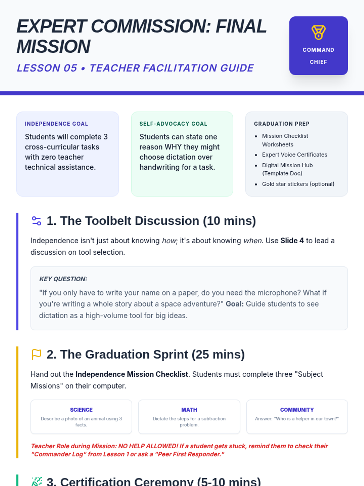 This sequence empowers 2nd-grade students to master text-to-speech tools by personalizing settings for their unique needs and developing the self-advocacy skills to request these accommodations confidently. Students move from technical customization to social-emotional scenarios, normalizing the use of assistive technology in the classroom.