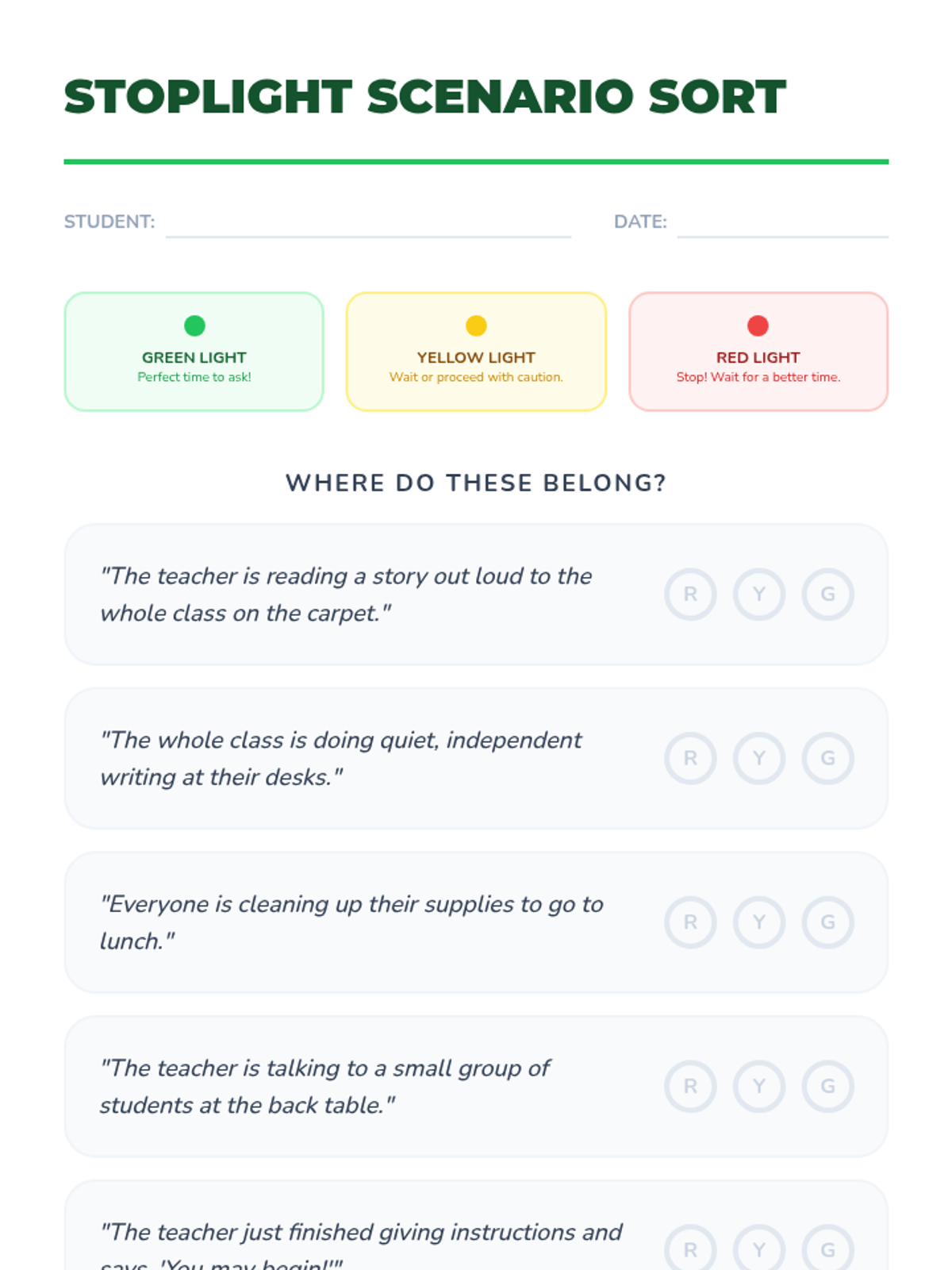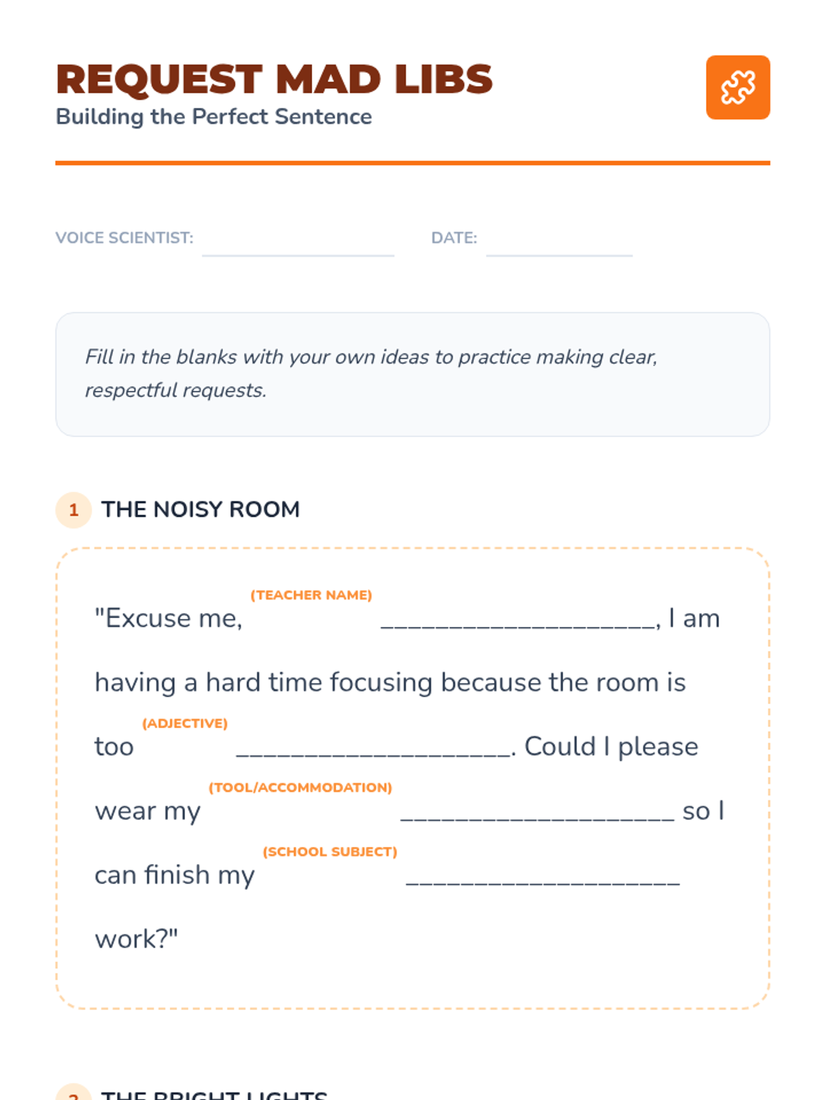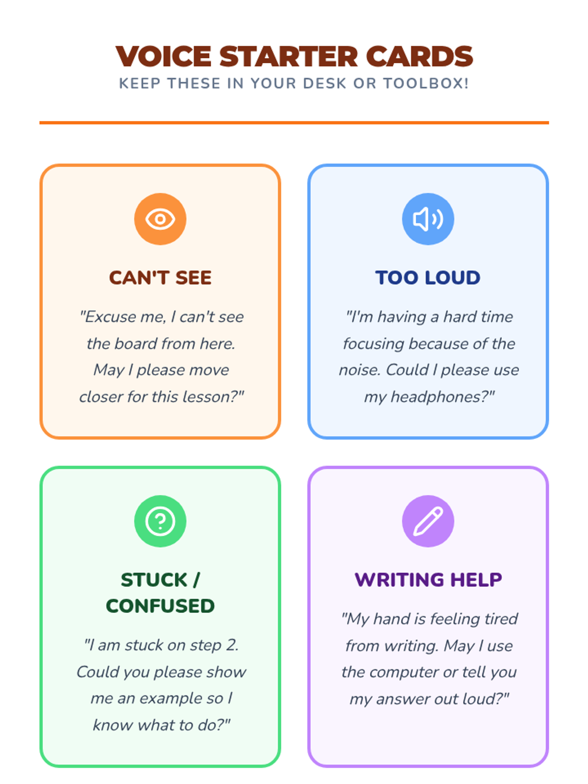 A 5-lesson sequence designed for 3rd-grade students to build the communication skills needed to request accommodations. Students move from defining self-advocacy to practicing scripts, understanding social timing, role-playing scenarios, and building resilience for when requests aren't immediately met.