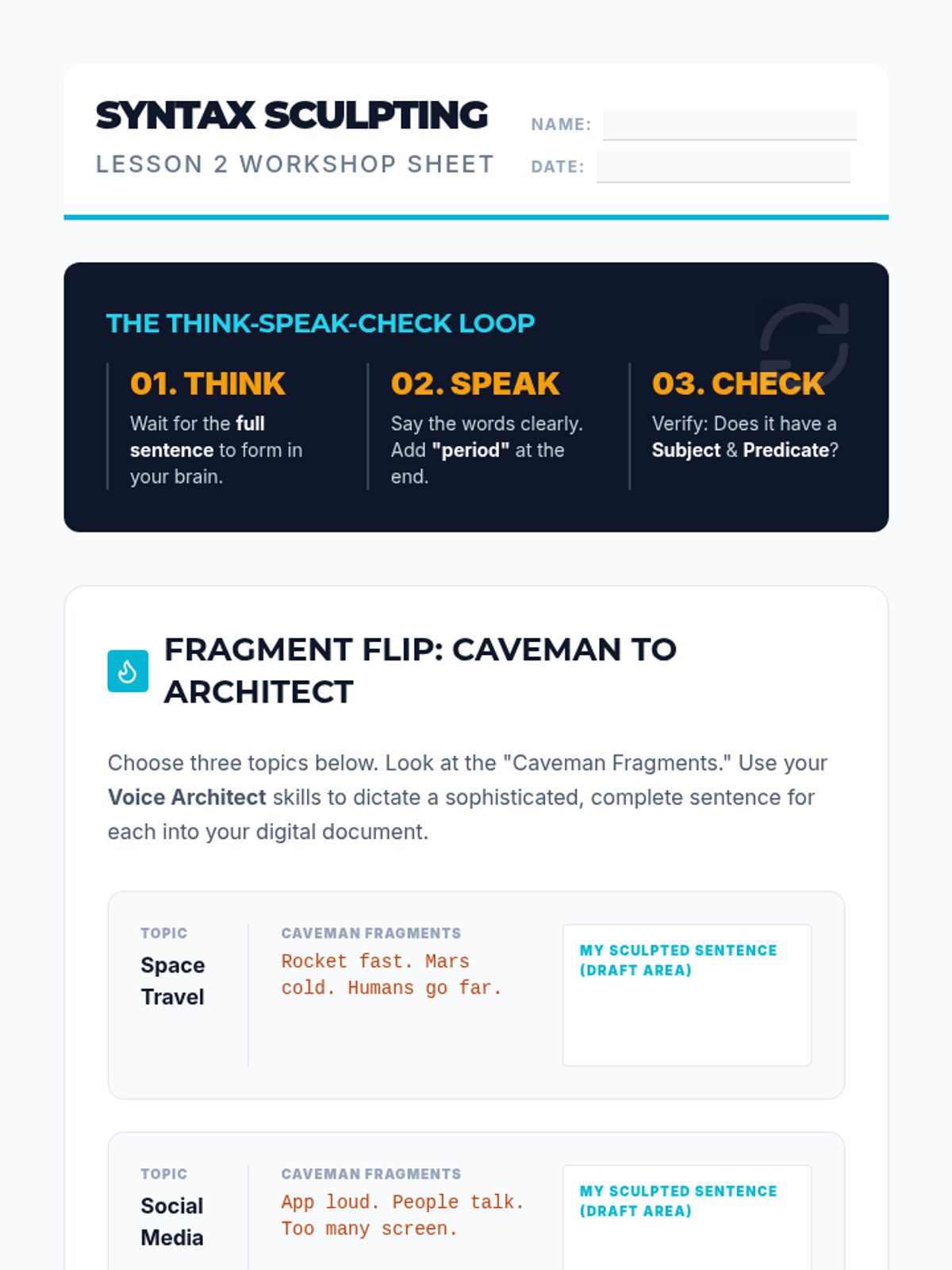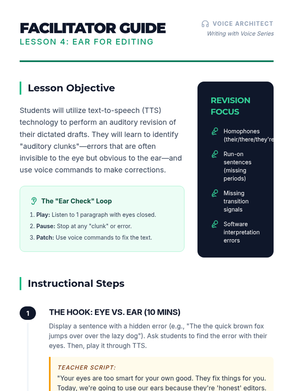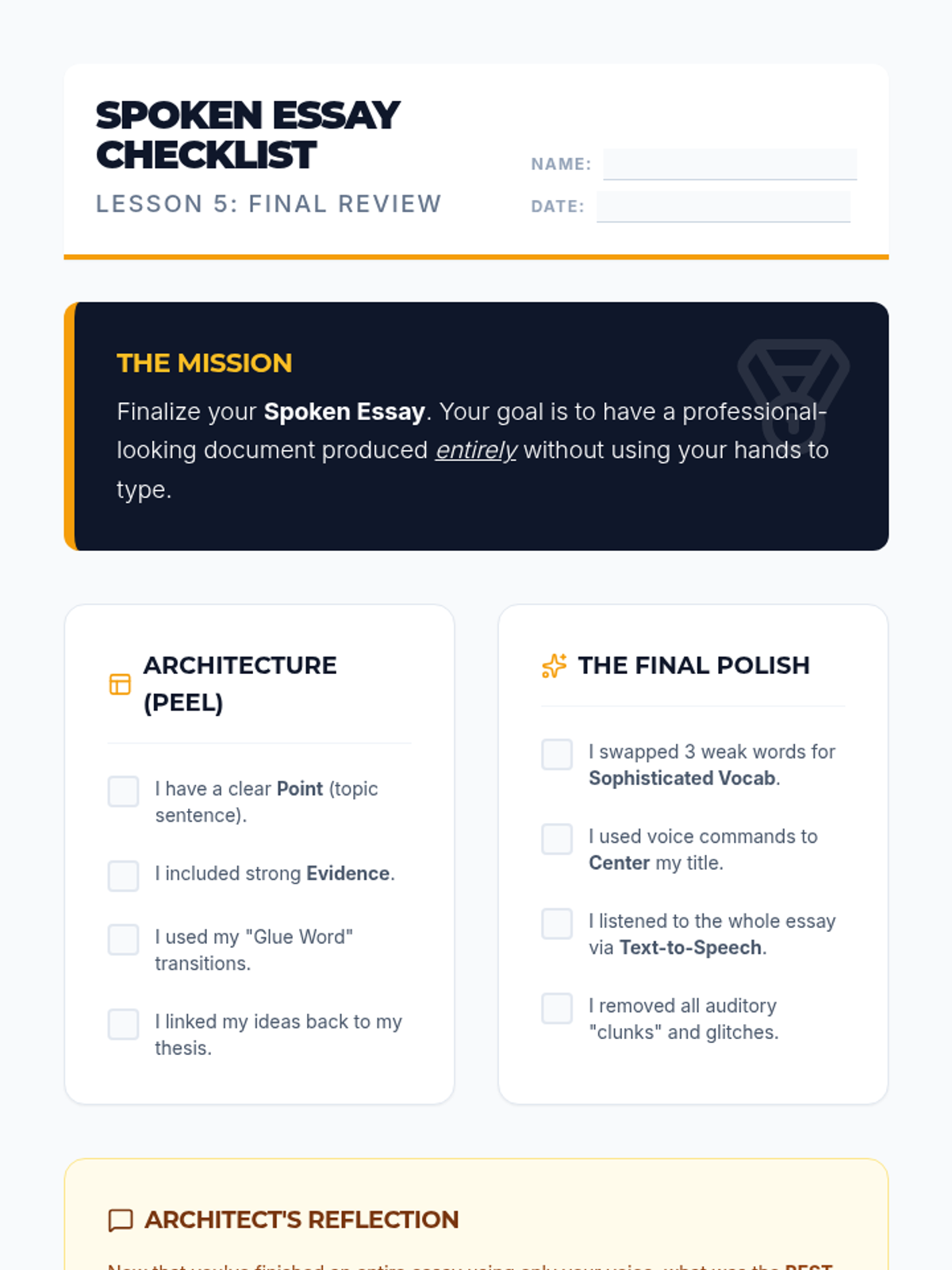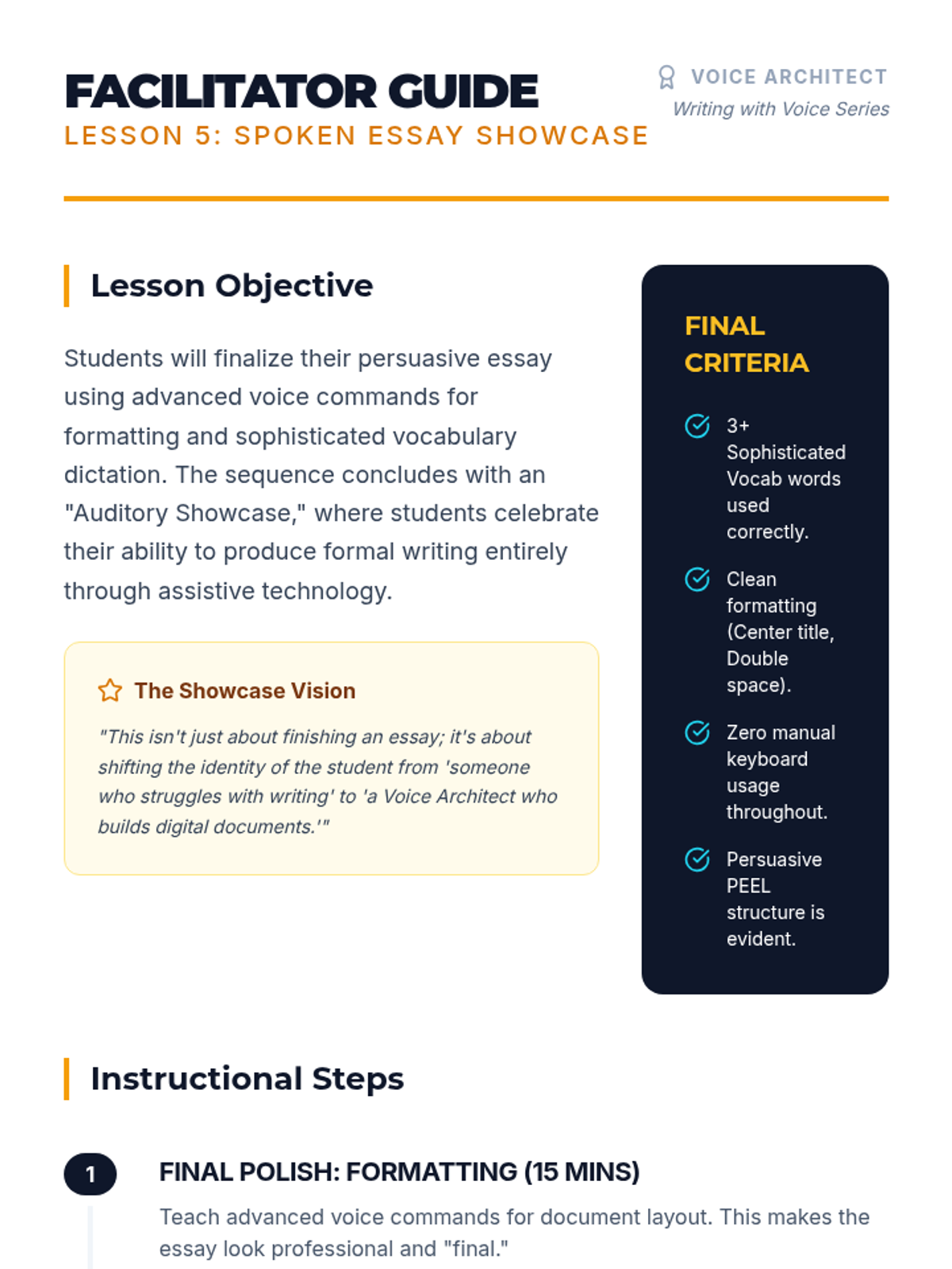 This sequence teaches 8th-grade students to master voice recognition technology as a tool for formal essay writing. It focuses on the transition from oral brainstorming to sophisticated composition and auditory revision.