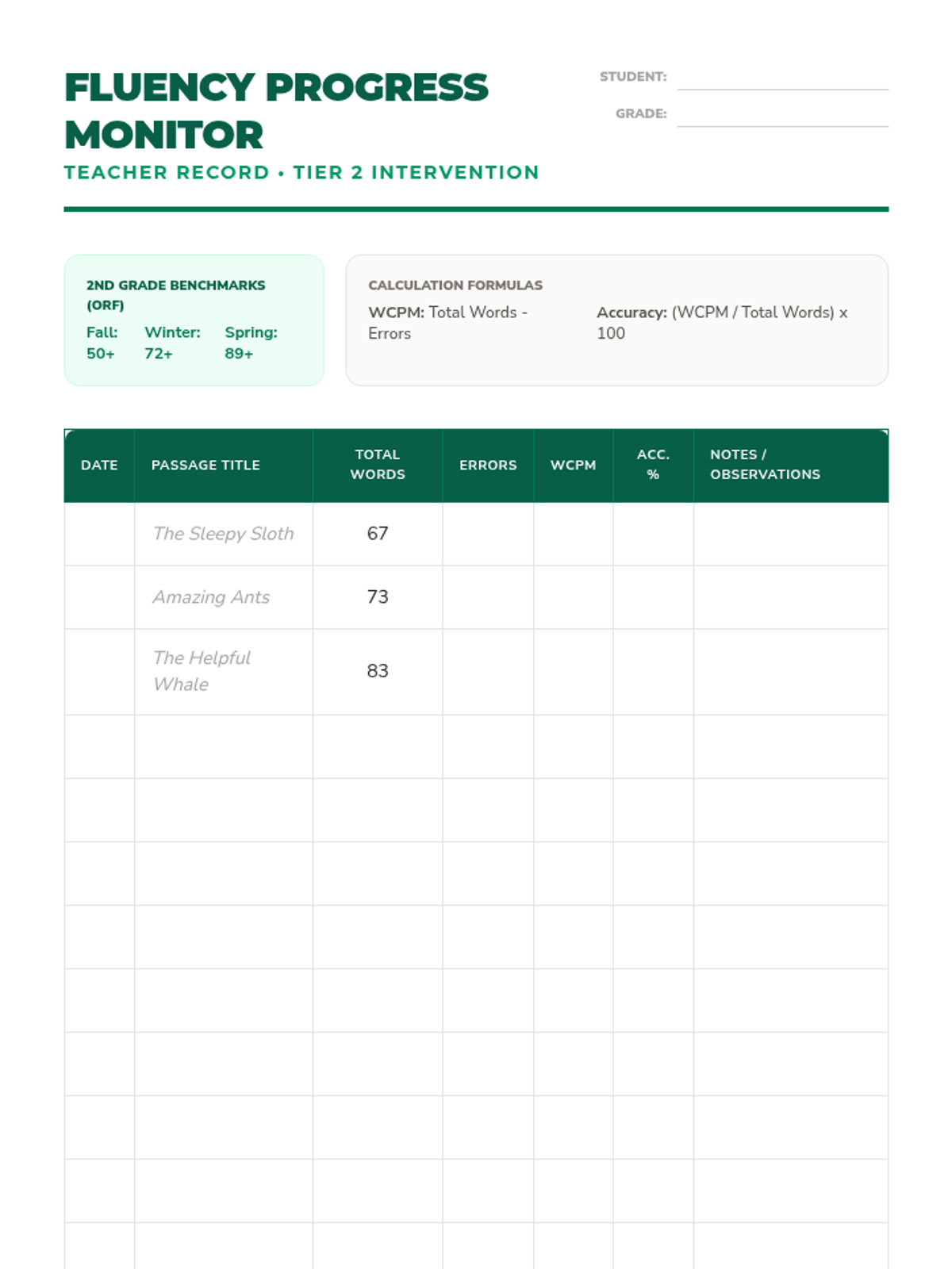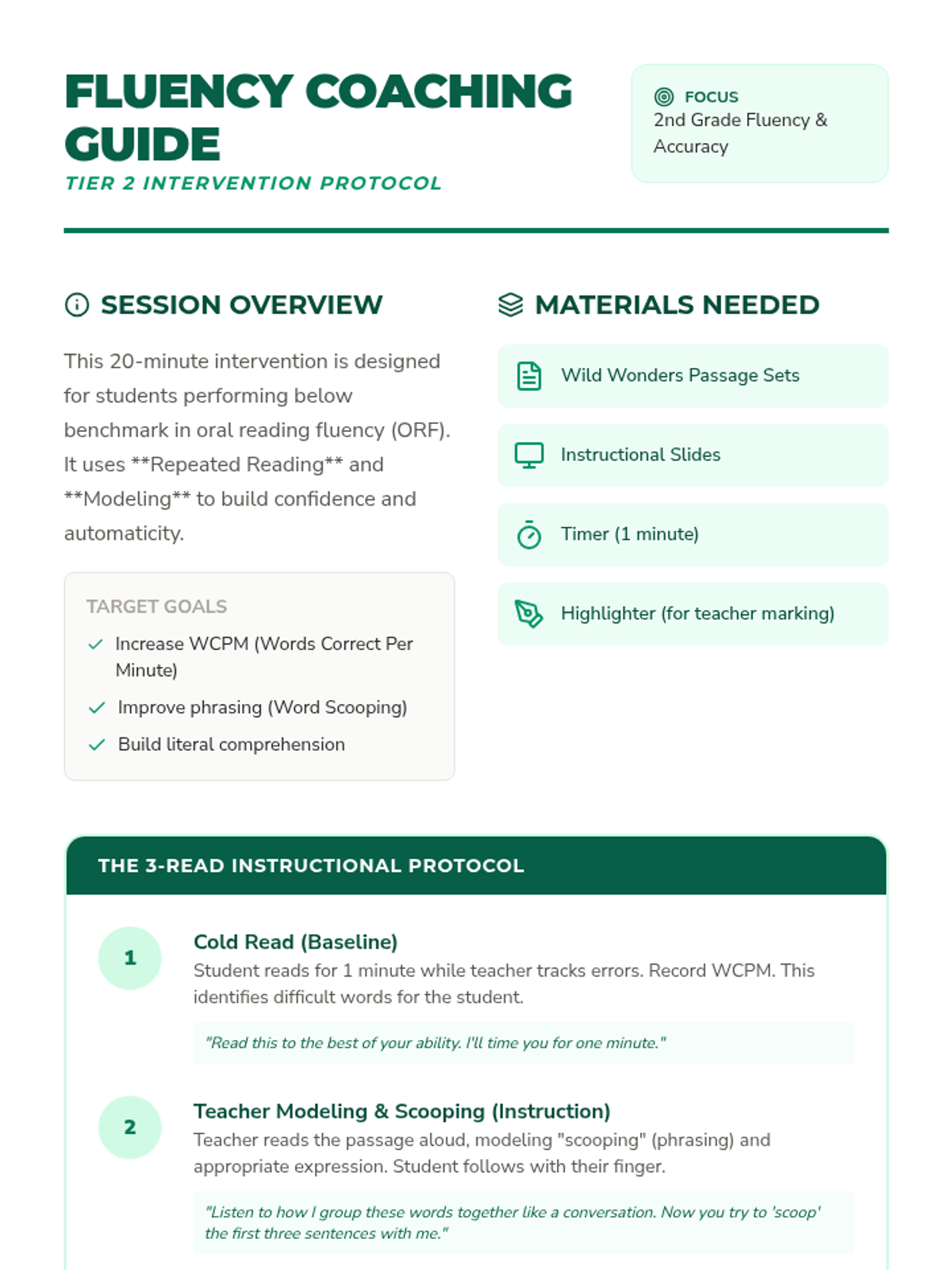 A Tier 2 reading intervention program for 2nd graders focusing on fluency through repeated reading of high-interest animal passages, expression practice, and comprehension.