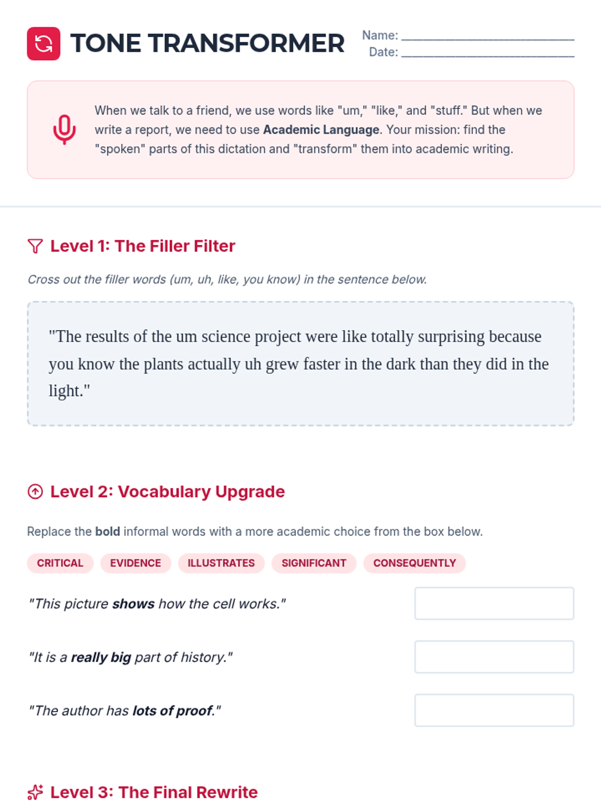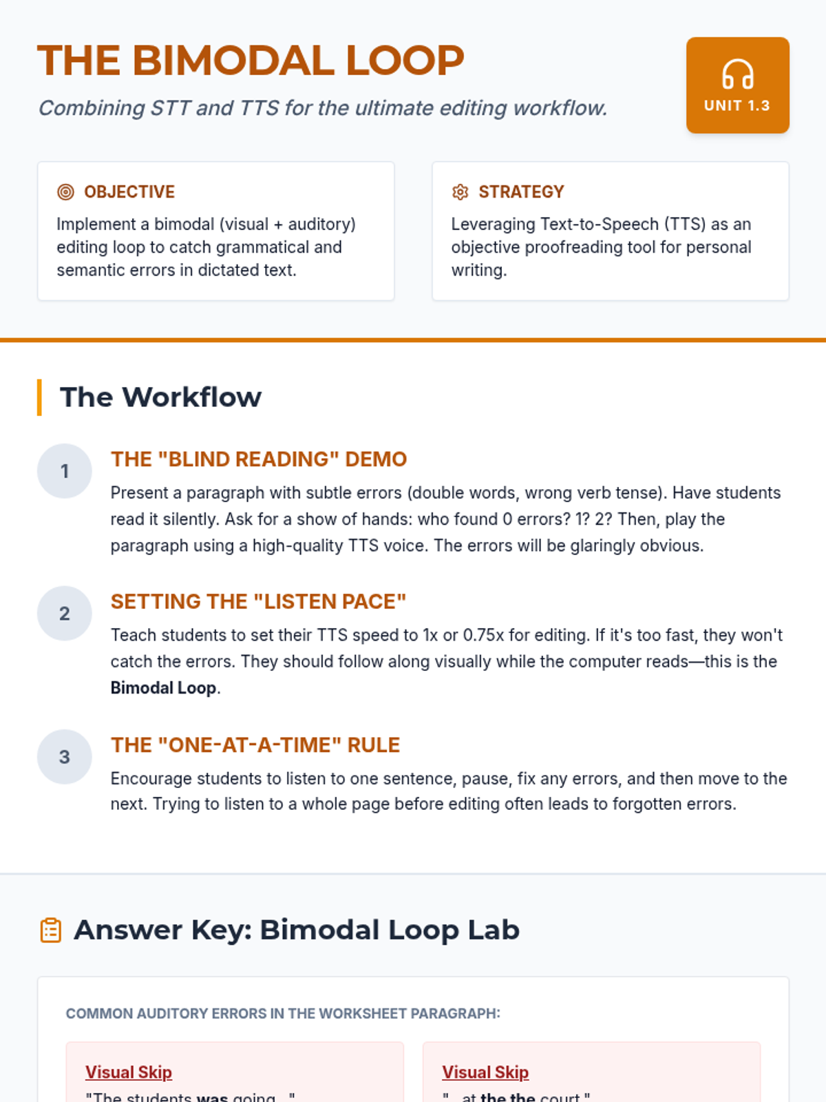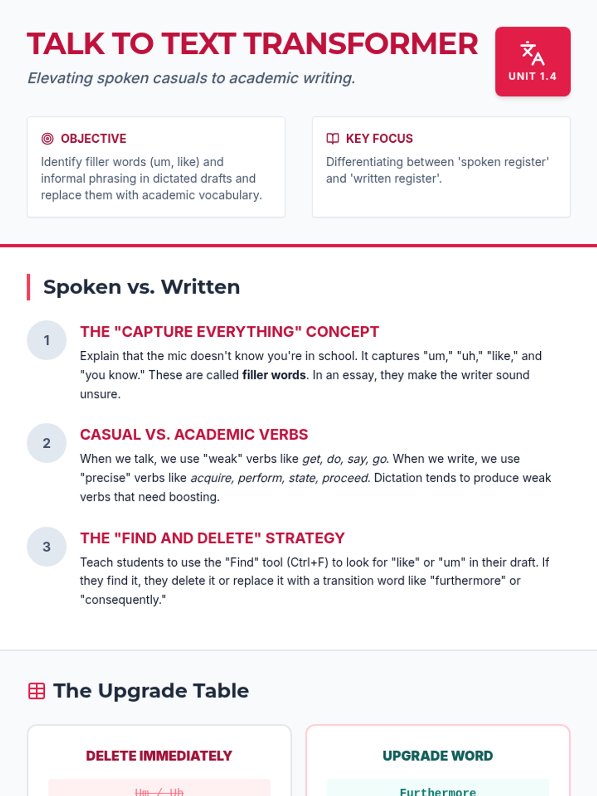 A sequence focused on the critical revision workflow for students using speech-to-text technology. Students learn to identify and fix common errors like homophone confusion, run-on sentences, and informal tone to turn raw dictation into polished academic writing.