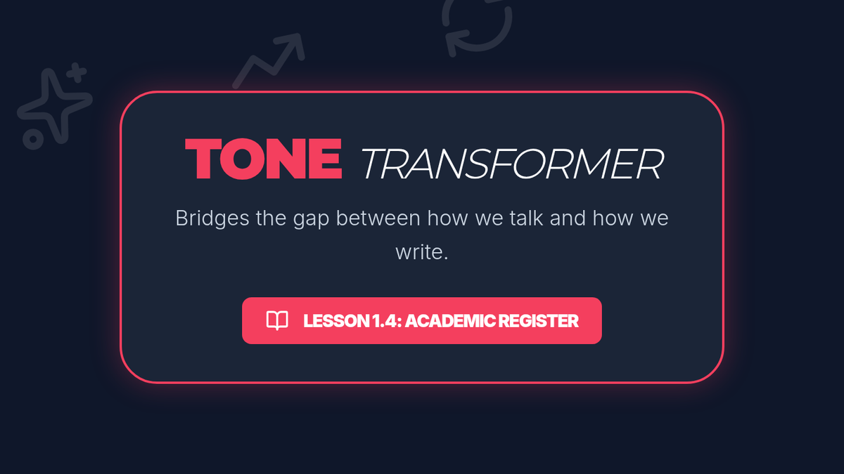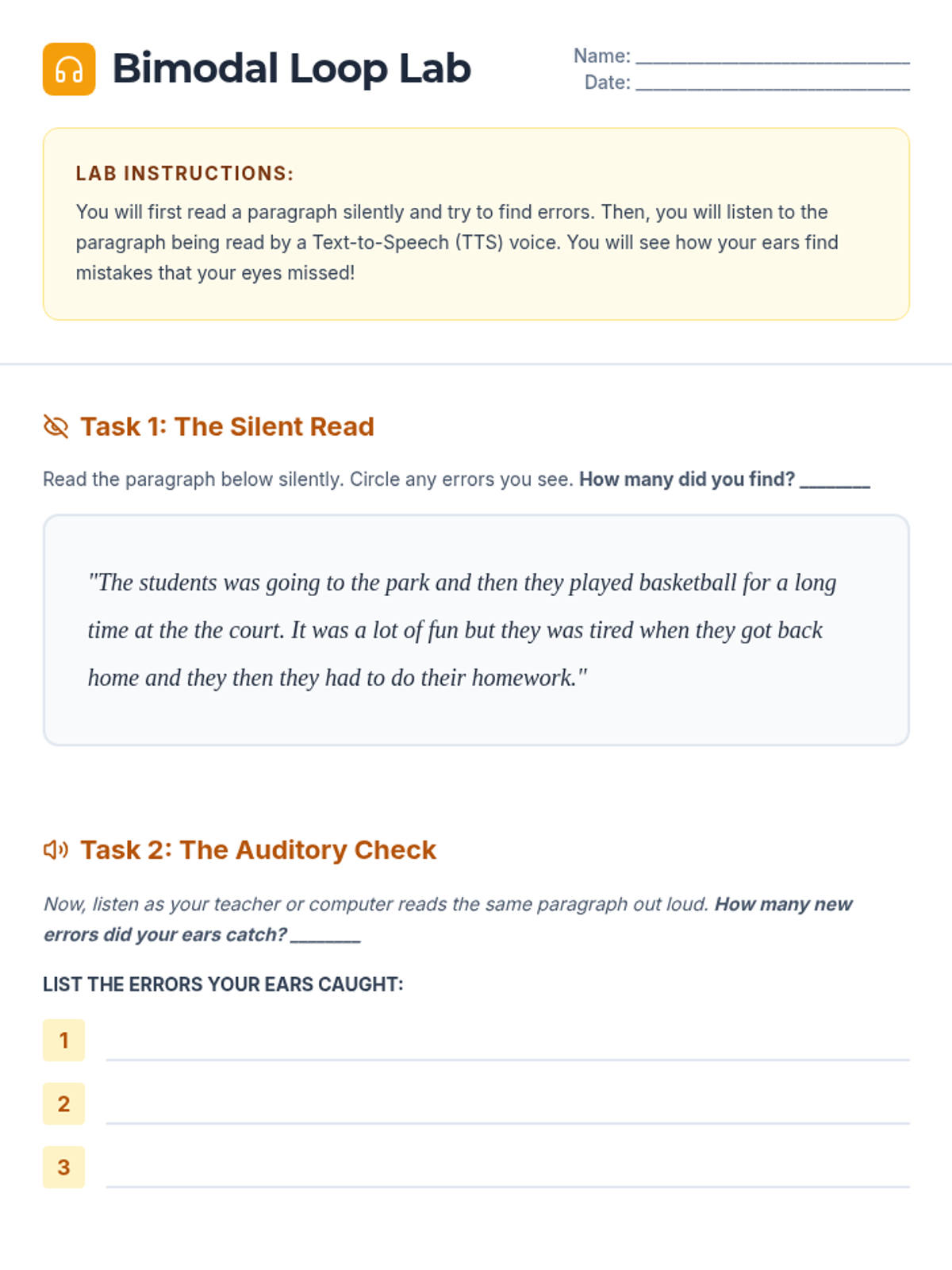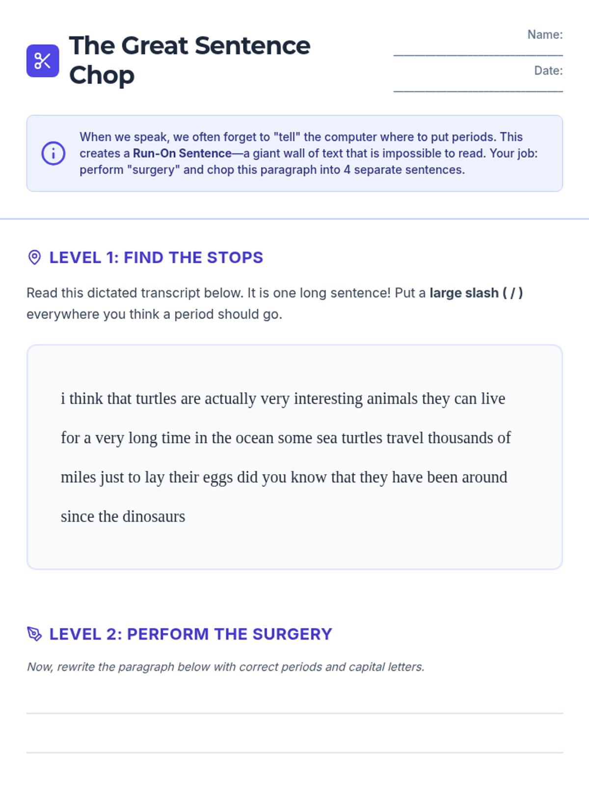 A sequence focused on the critical revision workflow for students using speech-to-text technology. Students learn to identify and fix common errors like homophone confusion, run-on sentences, and informal tone to turn raw dictation into polished academic writing.
