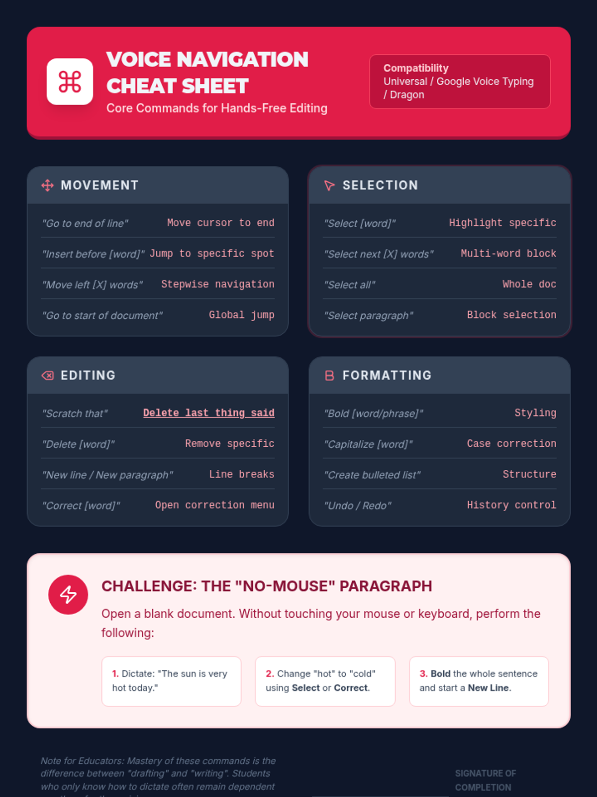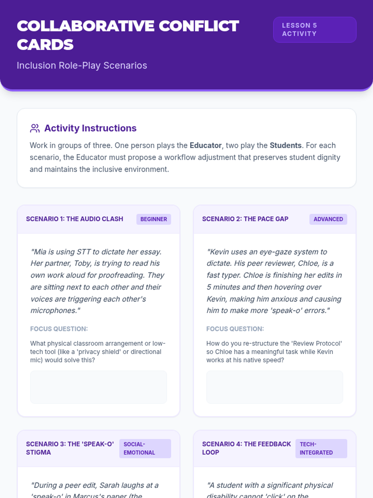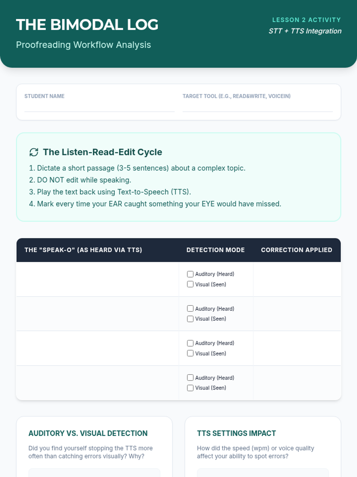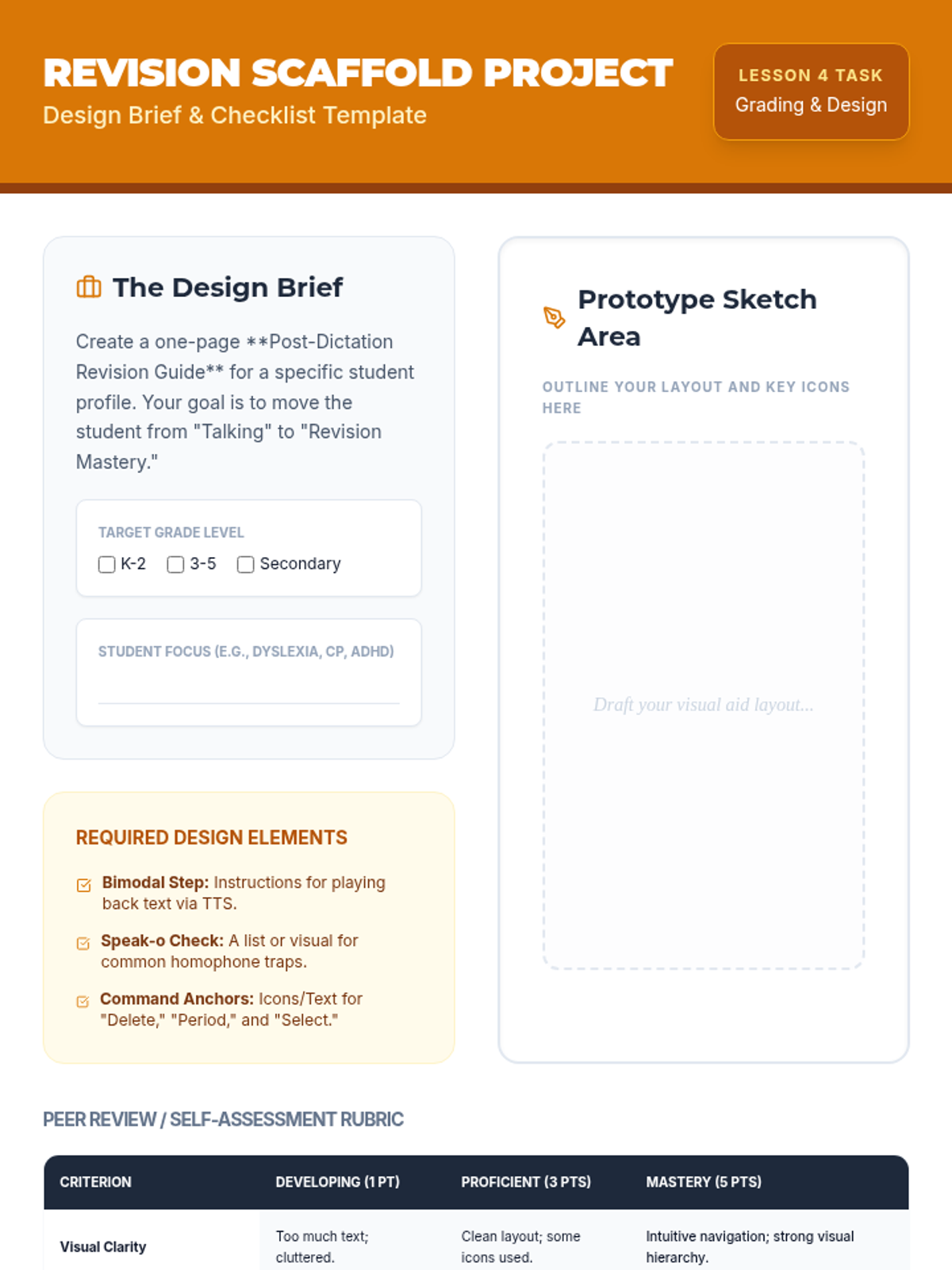 This project-based sequence prepares graduate students in Special Education to teach effective 'listen-read-edit' workflows for speech recognition technology. Participants move from identifying unique phonetic errors to designing instructional scaffolds and facilitating inclusive peer reviews for students with physical disabilities.