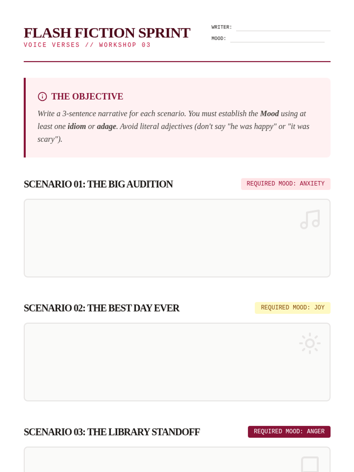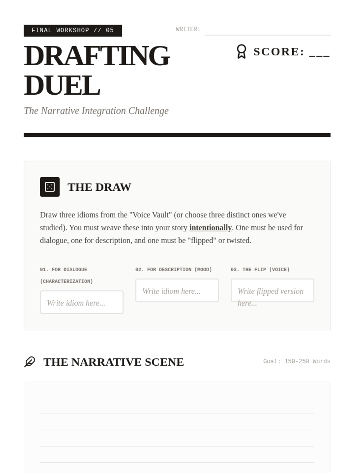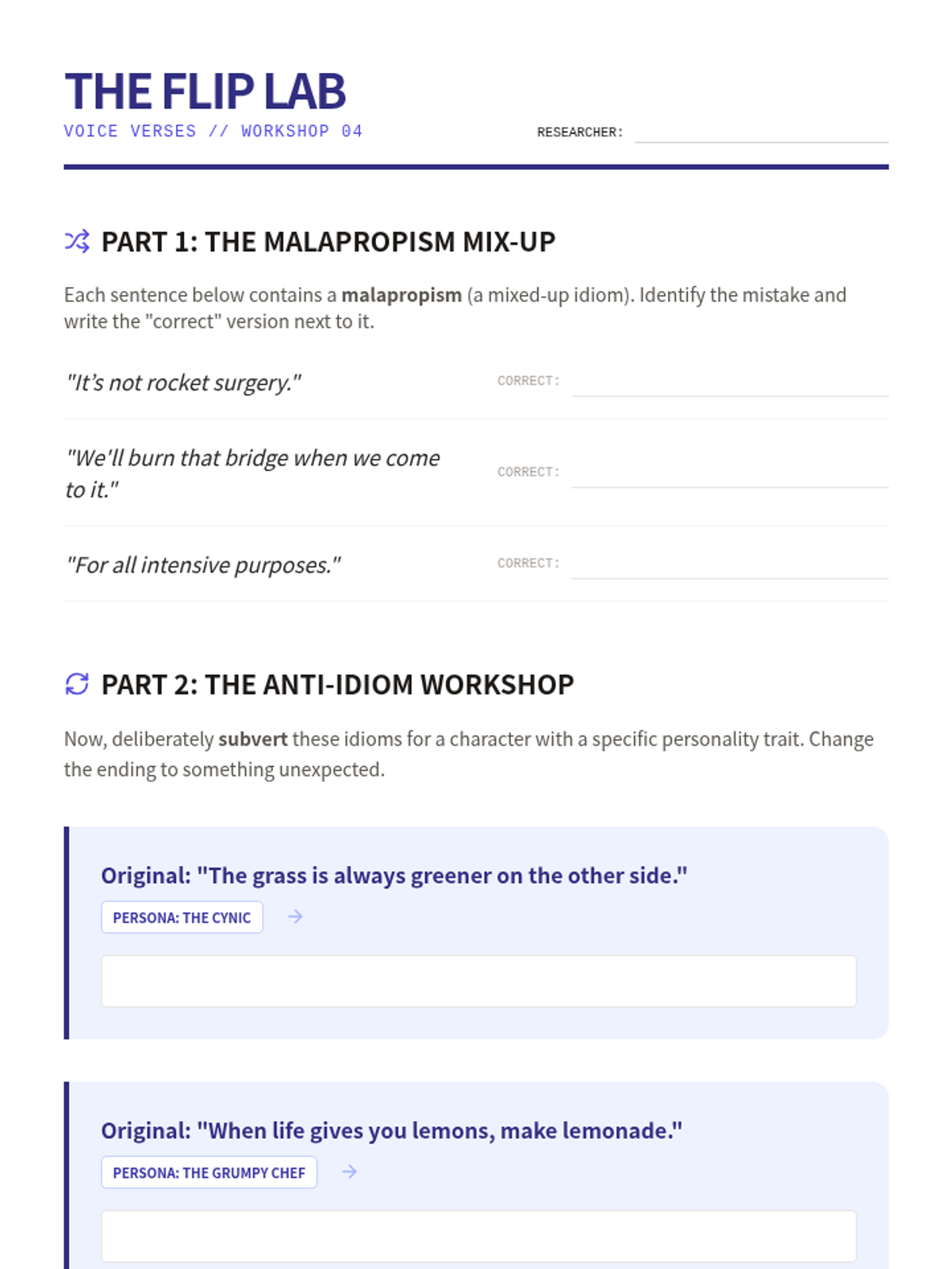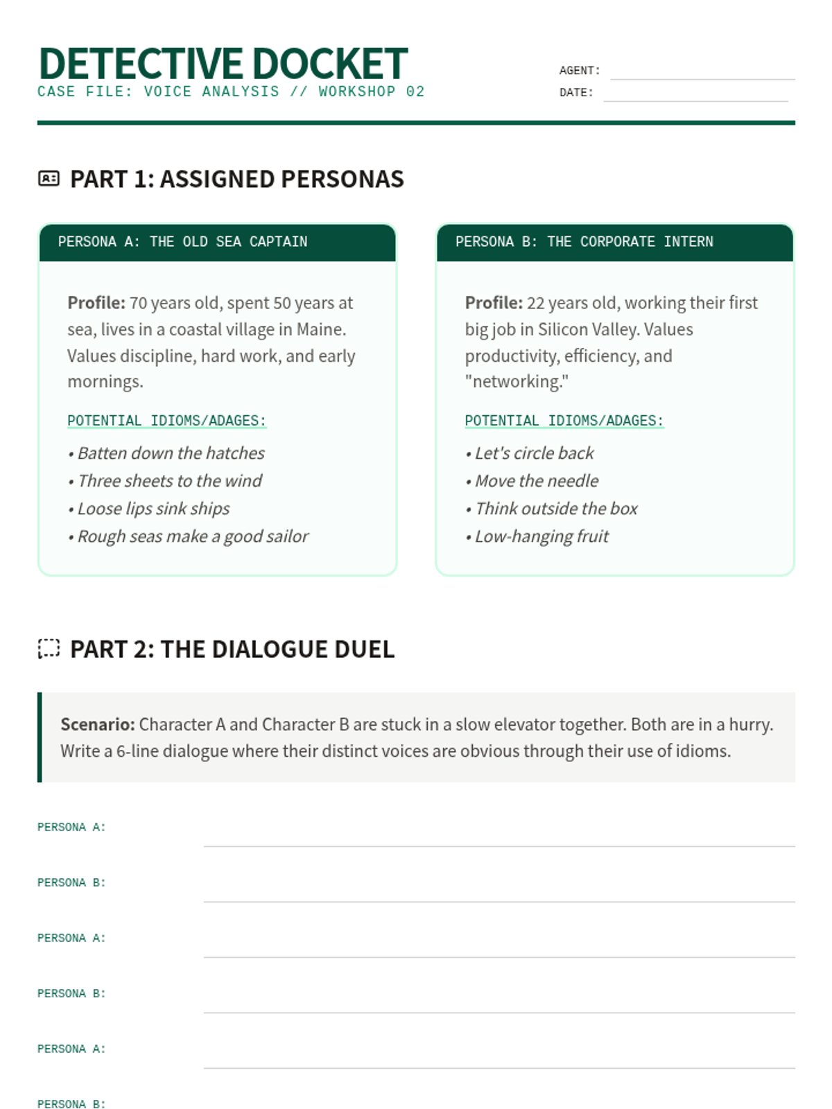 A writer's workshop sequence for 8th-grade students to master the intentional use of idioms and adages in narrative writing. Students move from identifying clichés to using idioms for characterization, mood, and subverting reader expectations.