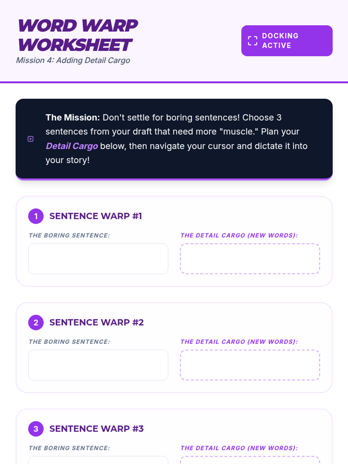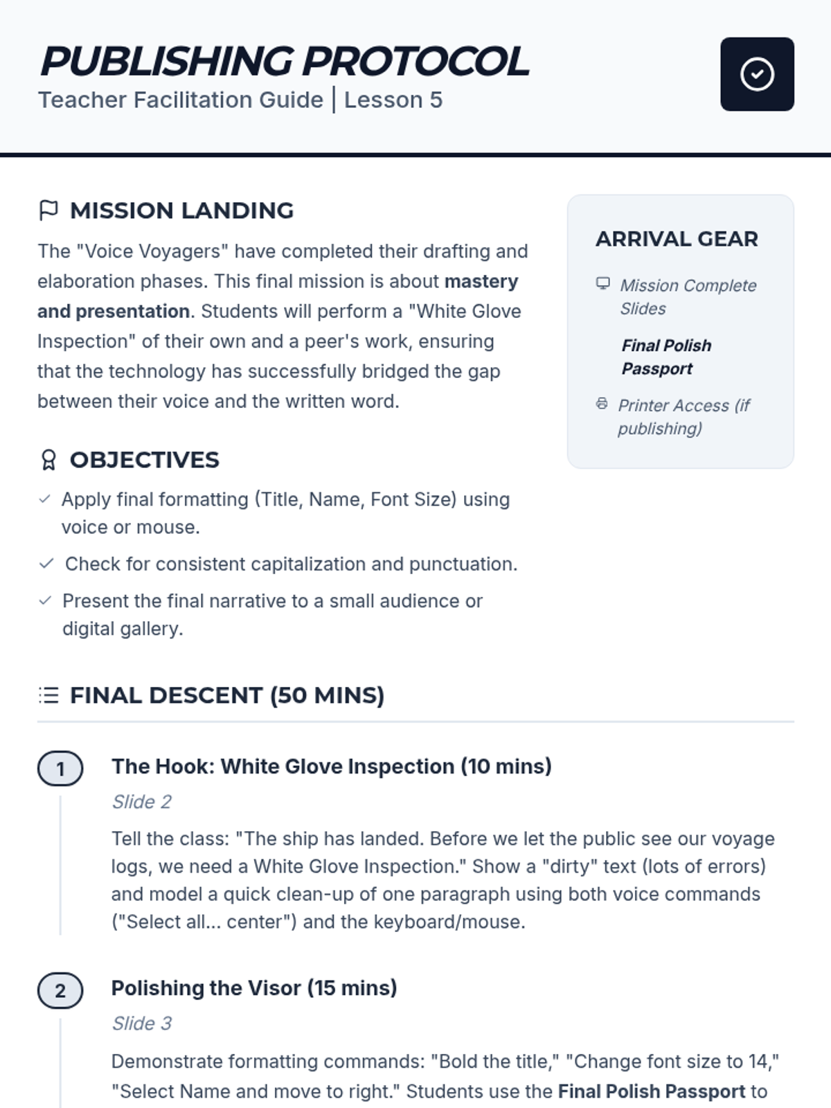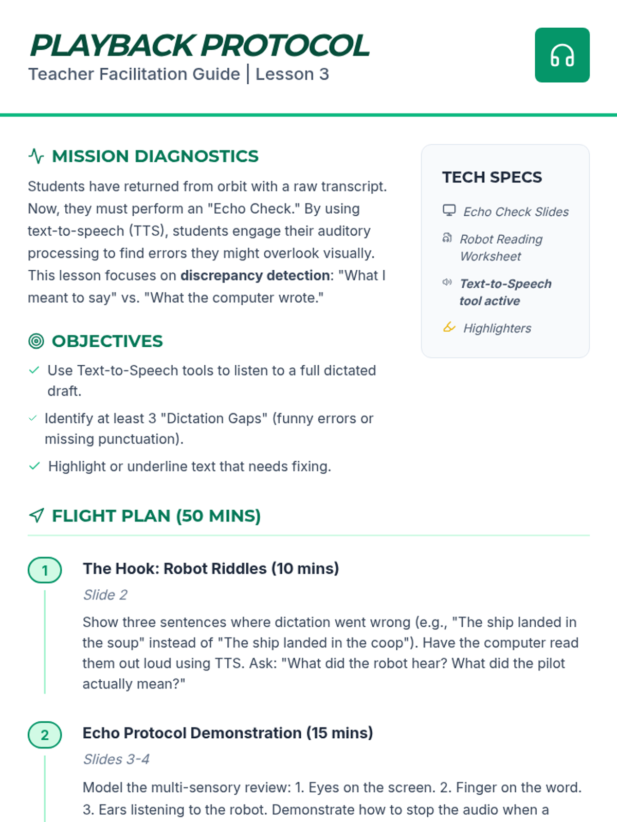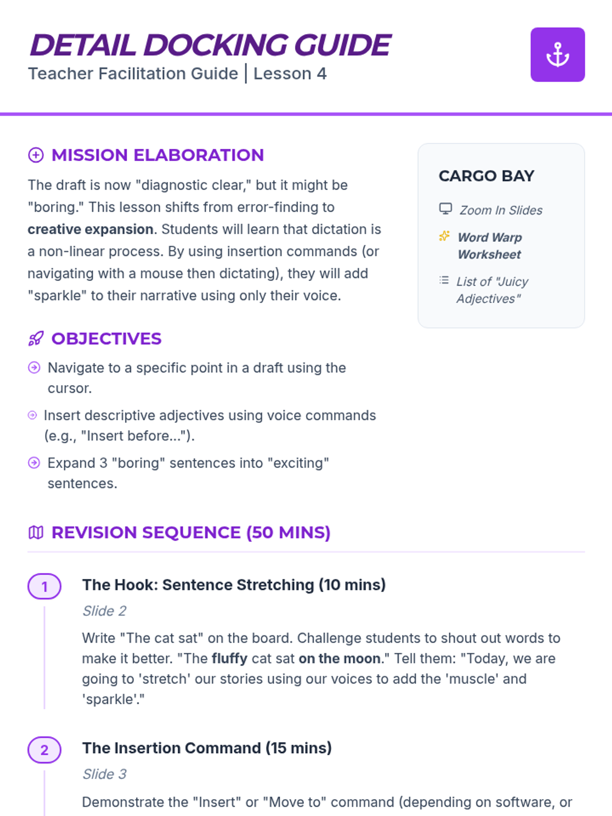 A 5-lesson sequence for 4th-grade students on using assistive technology for dictation and text editing. Students move from oral brainstorming to drafting, reviewing, revising with insertion commands, and final polishing of a multiparagraph narrative.