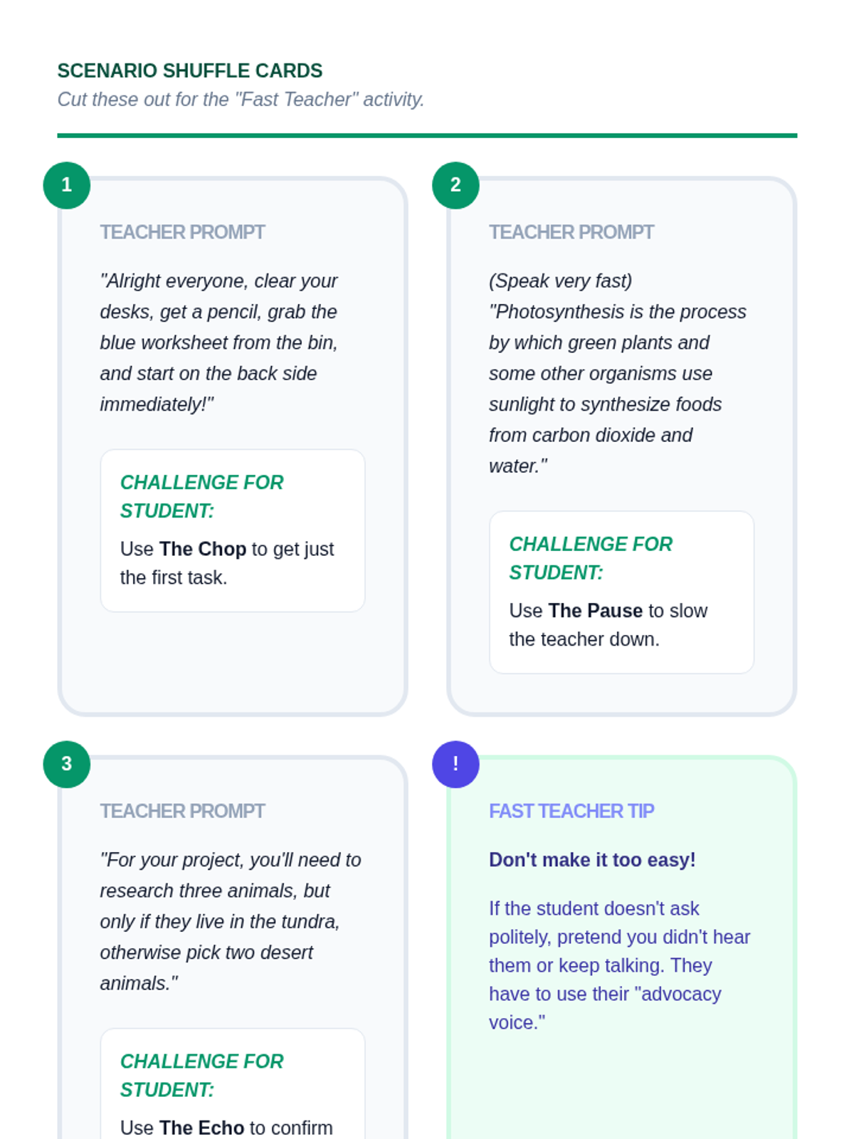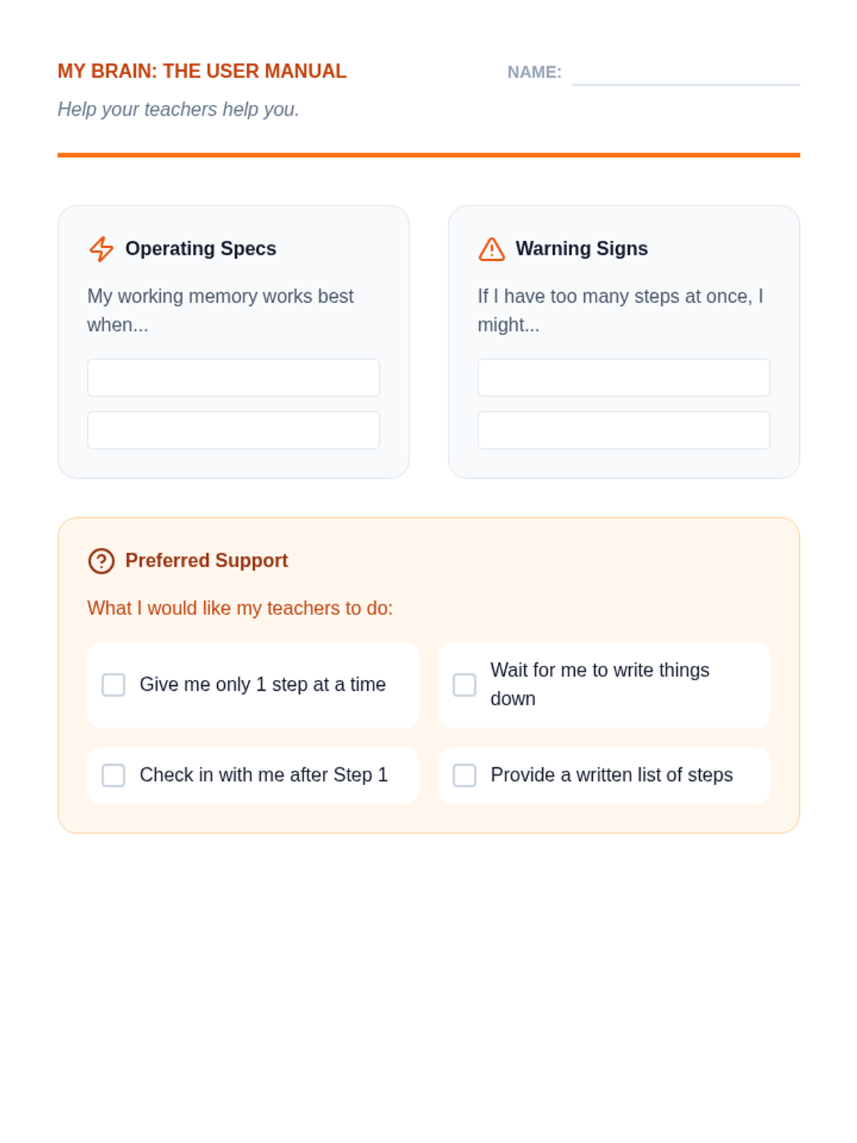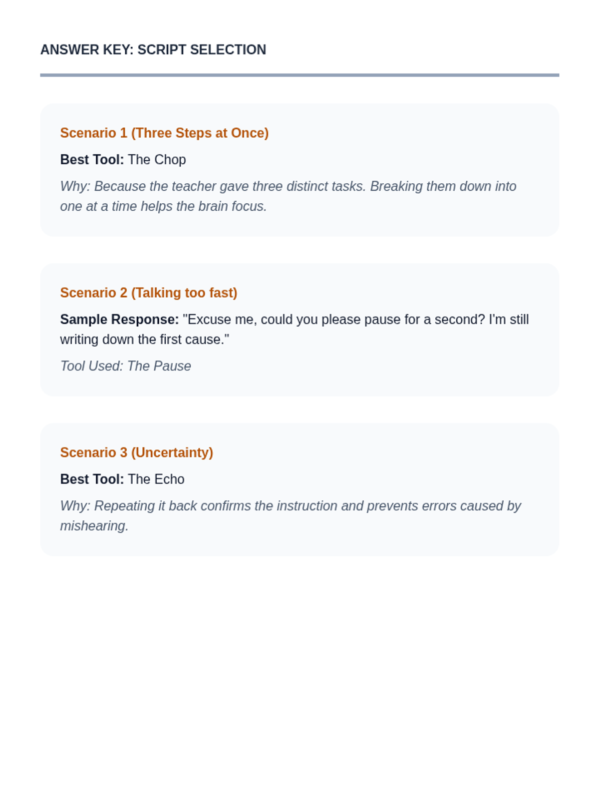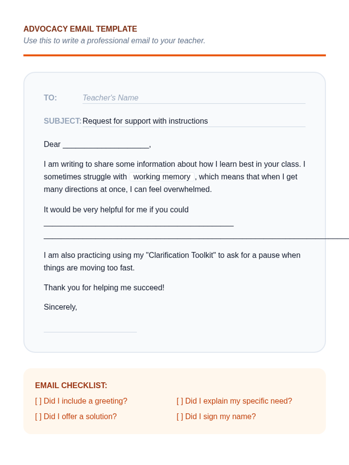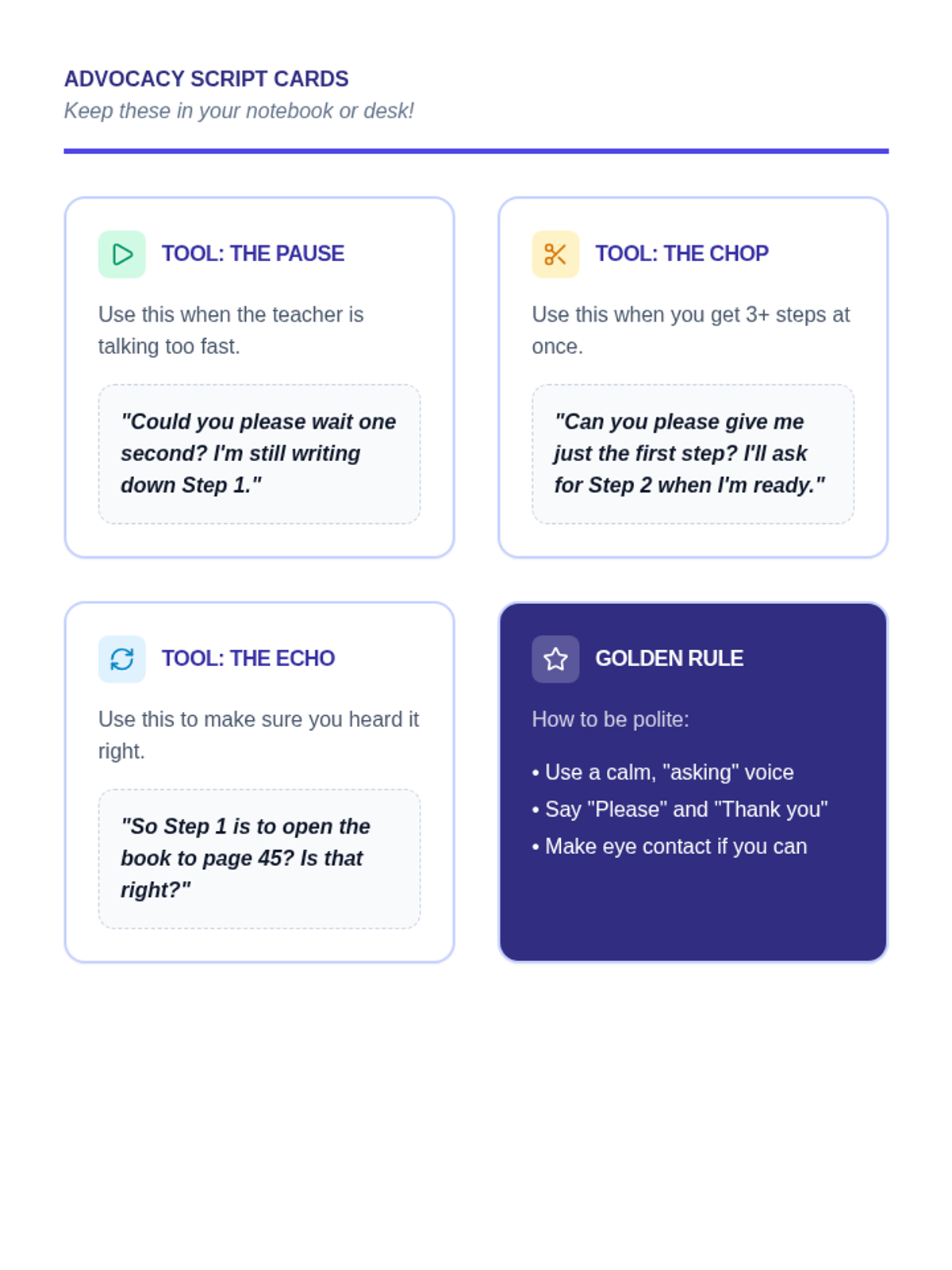 This sequence empowers 6th-grade students with working memory challenges to recognize cognitive overload and advocate for single-step directions. Students develop metacognitive awareness and a practical 'clarification toolkit' to manage learning inputs effectively.