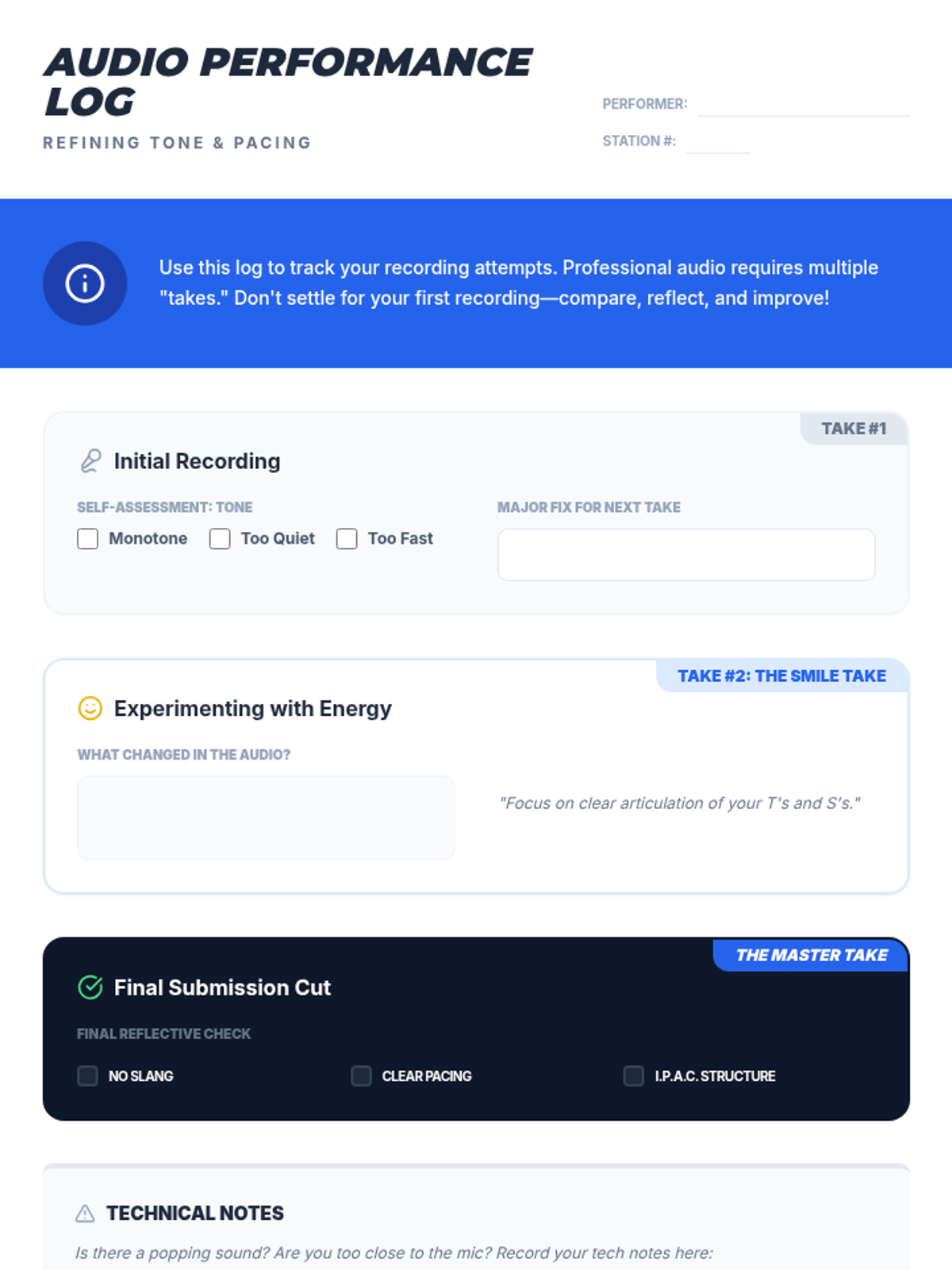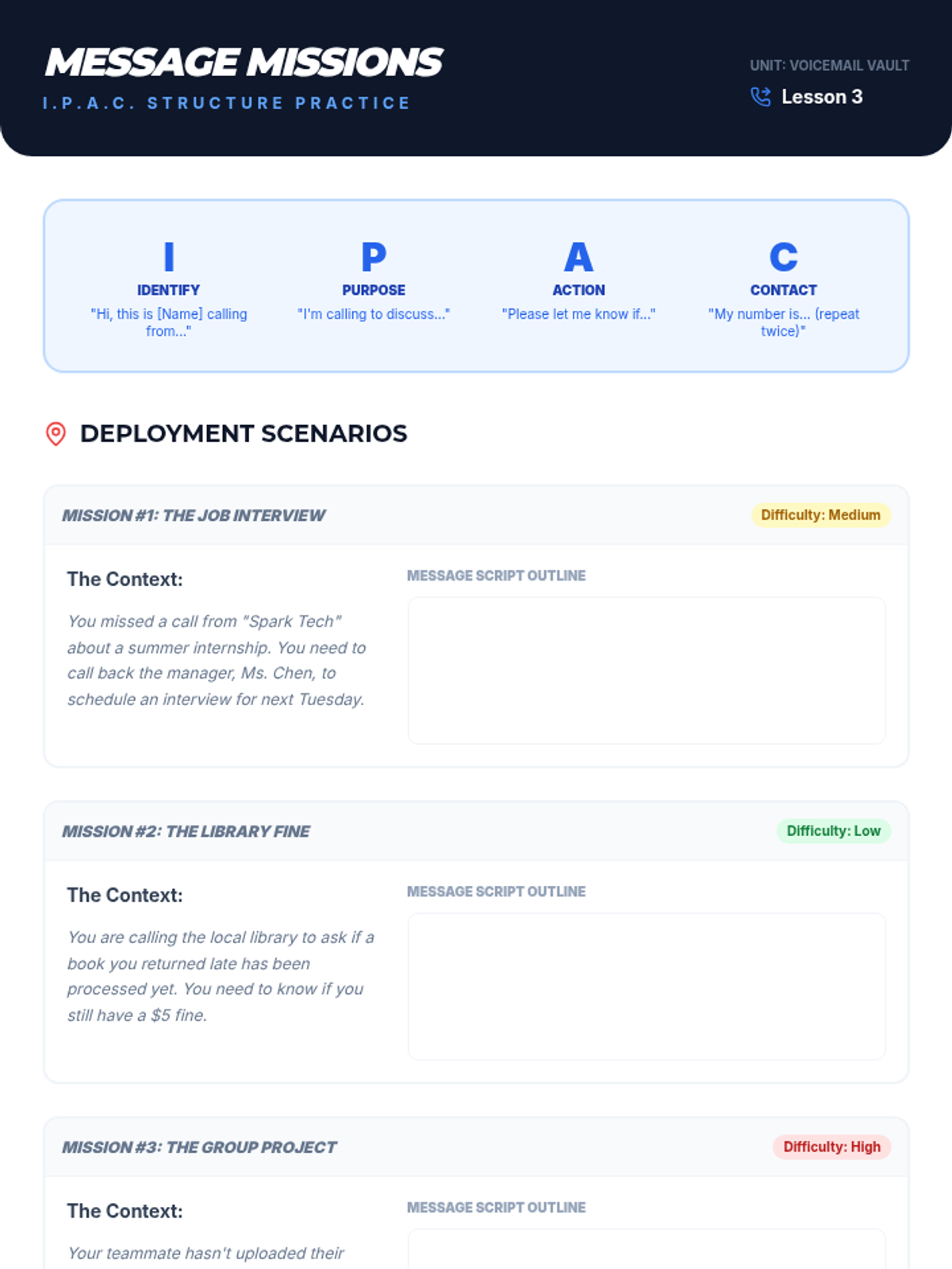This project-based sequence explores the world of asynchronous audio communication, specifically voicemail systems. Students investigate professional standards, script their own greetings, and practice leaving clear, actionable messages, culminating in a digital audio portfolio.