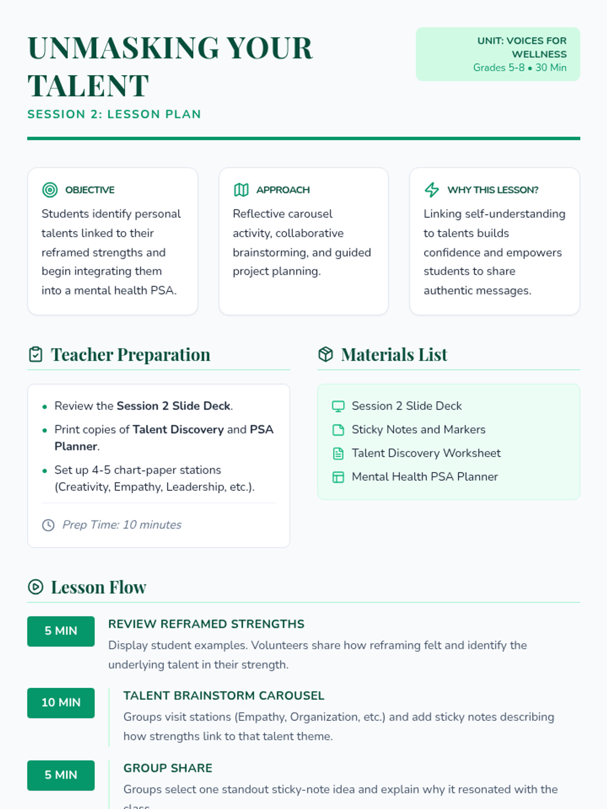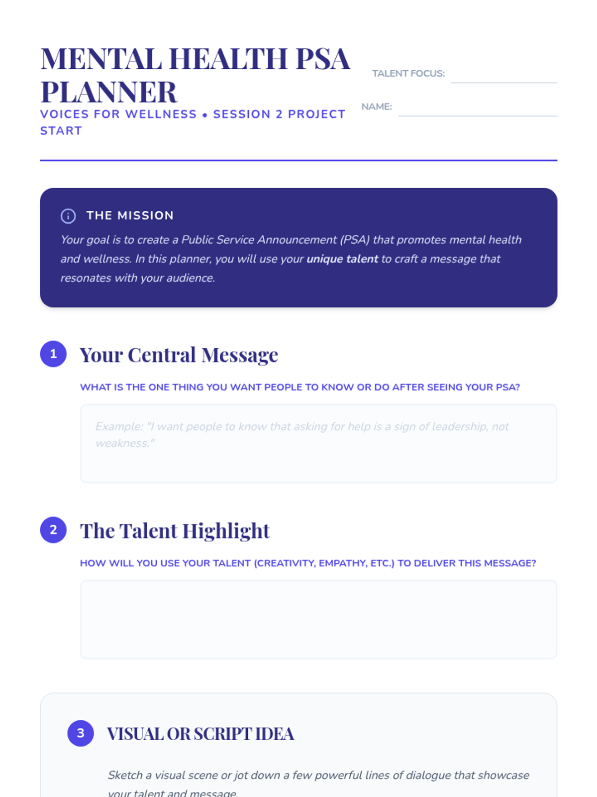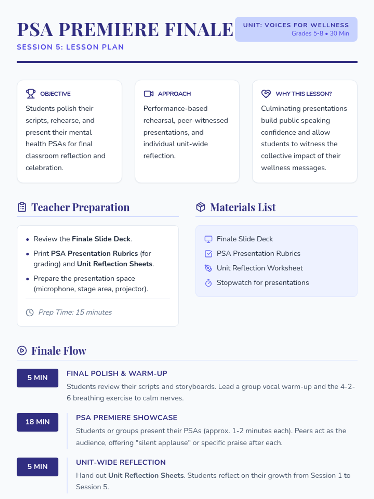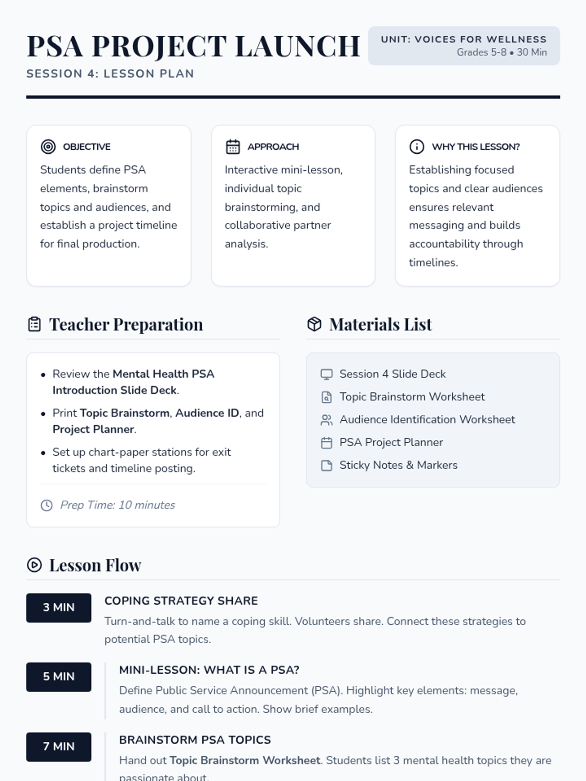 A 5-session unit for grades 5–8 that guides students from self-reflection and growth mindset to creating a persuasive mental health public service announcement (PSA). Students explore weaknesses as strengths, identify personal talents, and use their voices to advocate for wellness and coping strategies.