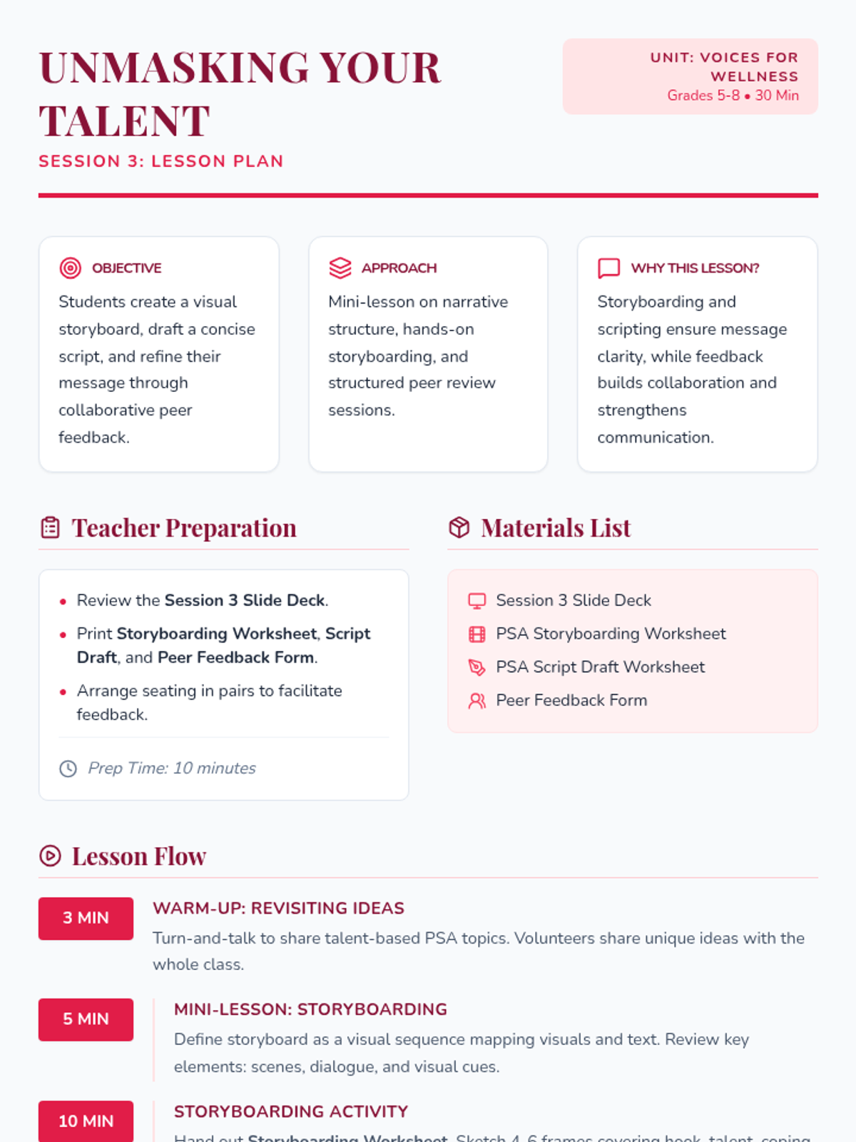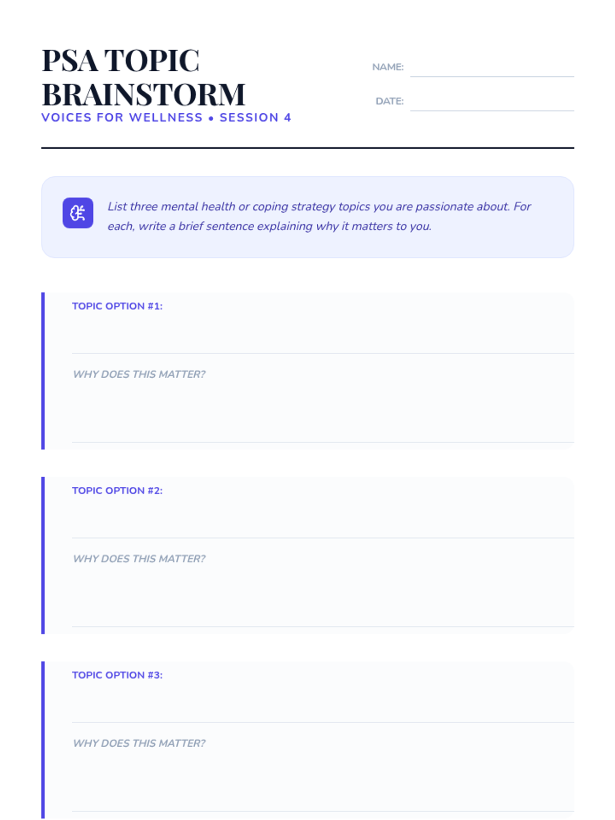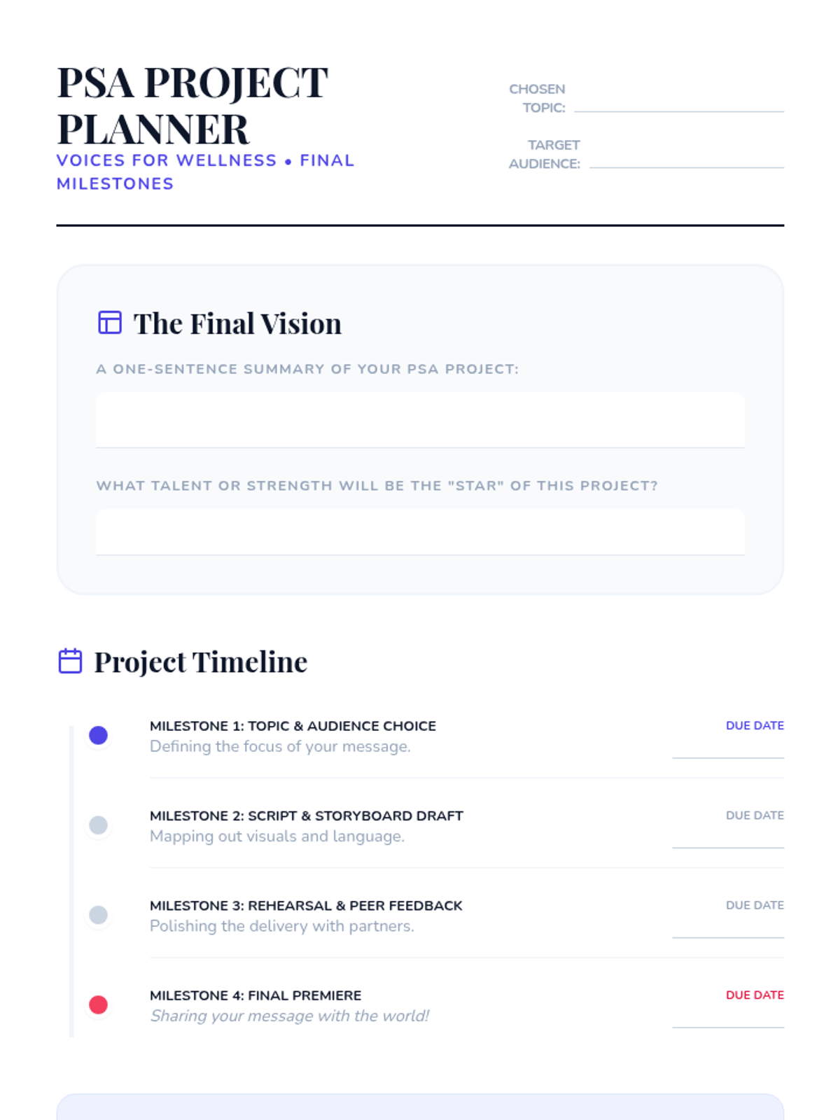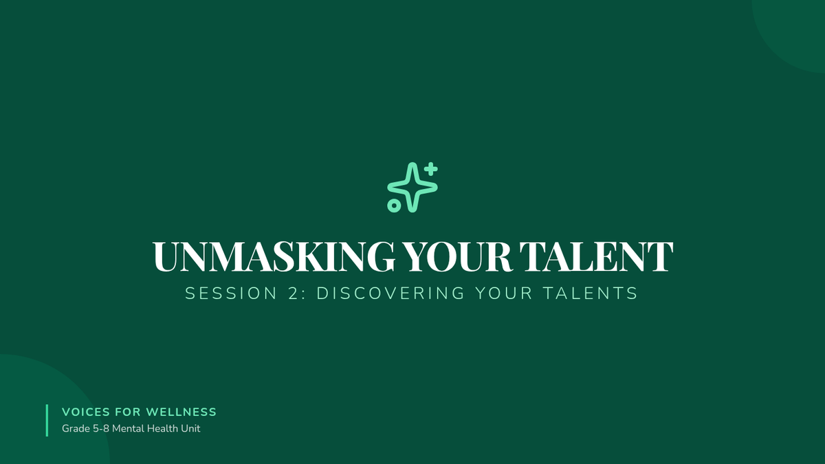 A 5-session unit for grades 5–8 that guides students from self-reflection and growth mindset to creating a persuasive mental health public service announcement (PSA). Students explore weaknesses as strengths, identify personal talents, and use their voices to advocate for wellness and coping strategies.
