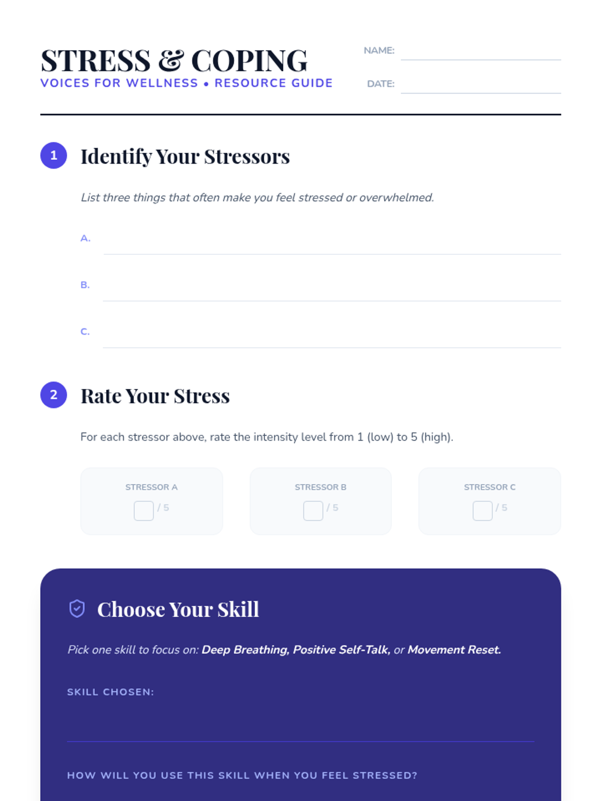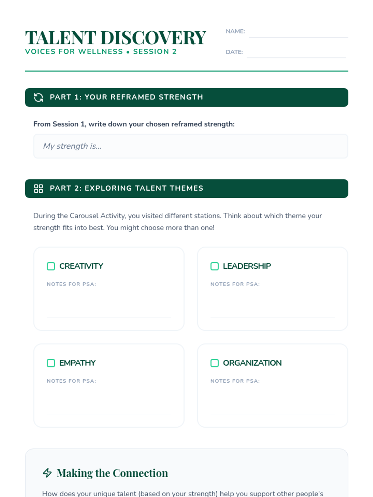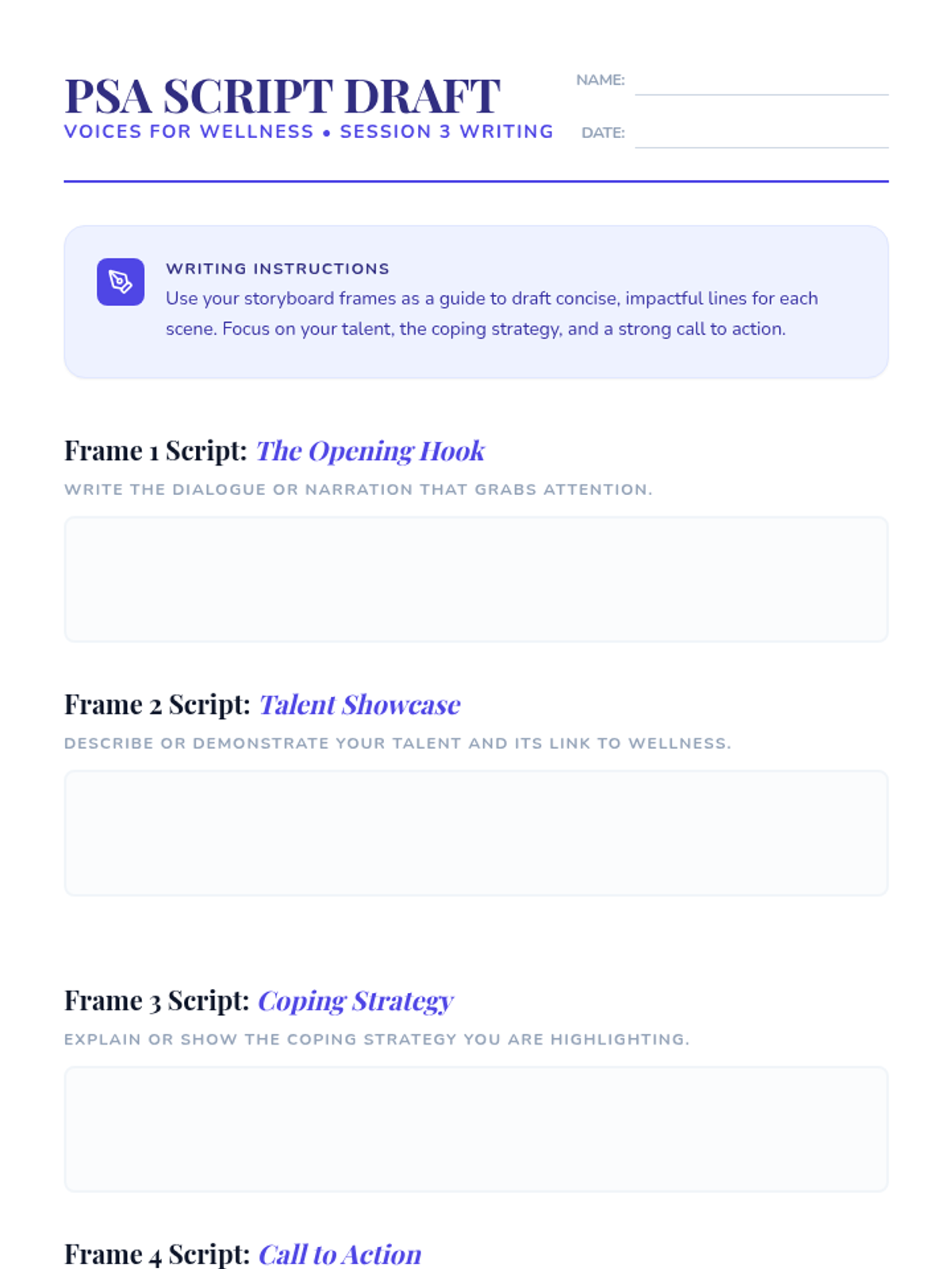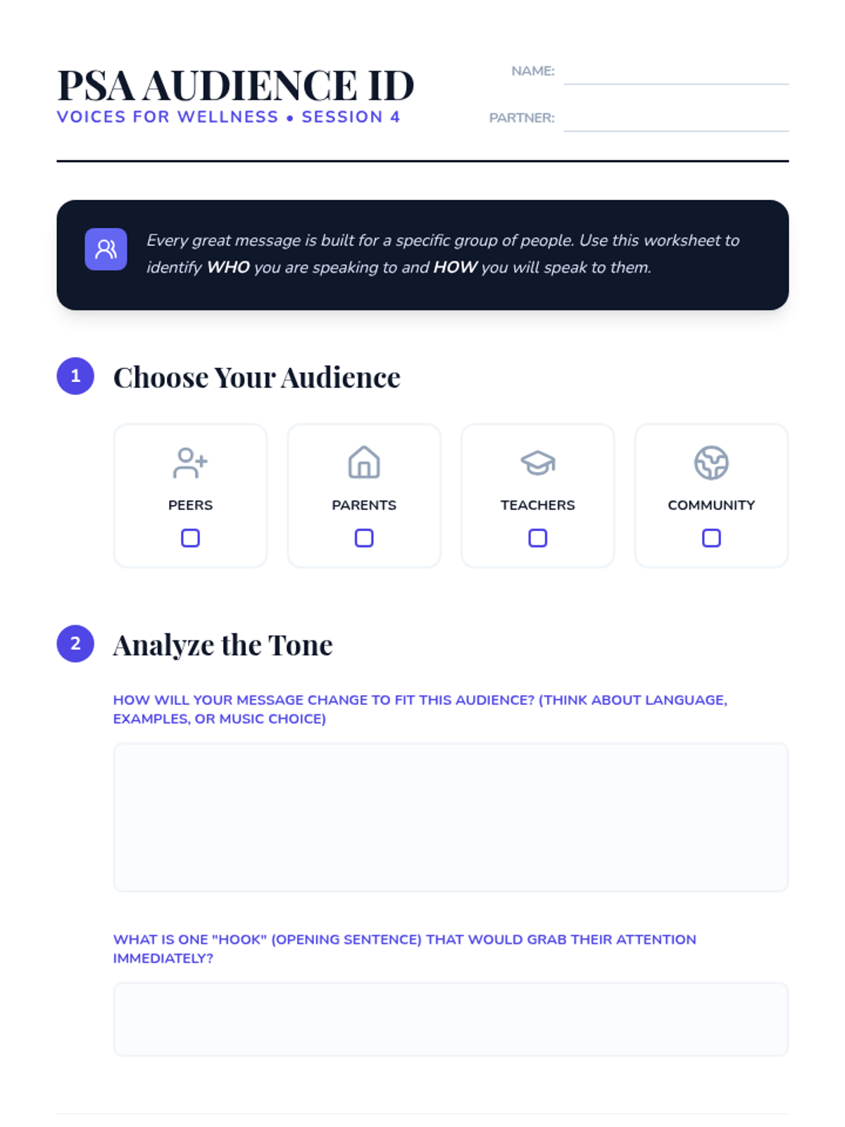 A 5-session unit for grades 5–8 that guides students from self-reflection and growth mindset to creating a persuasive mental health public service announcement (PSA). Students explore weaknesses as strengths, identify personal talents, and use their voices to advocate for wellness and coping strategies.