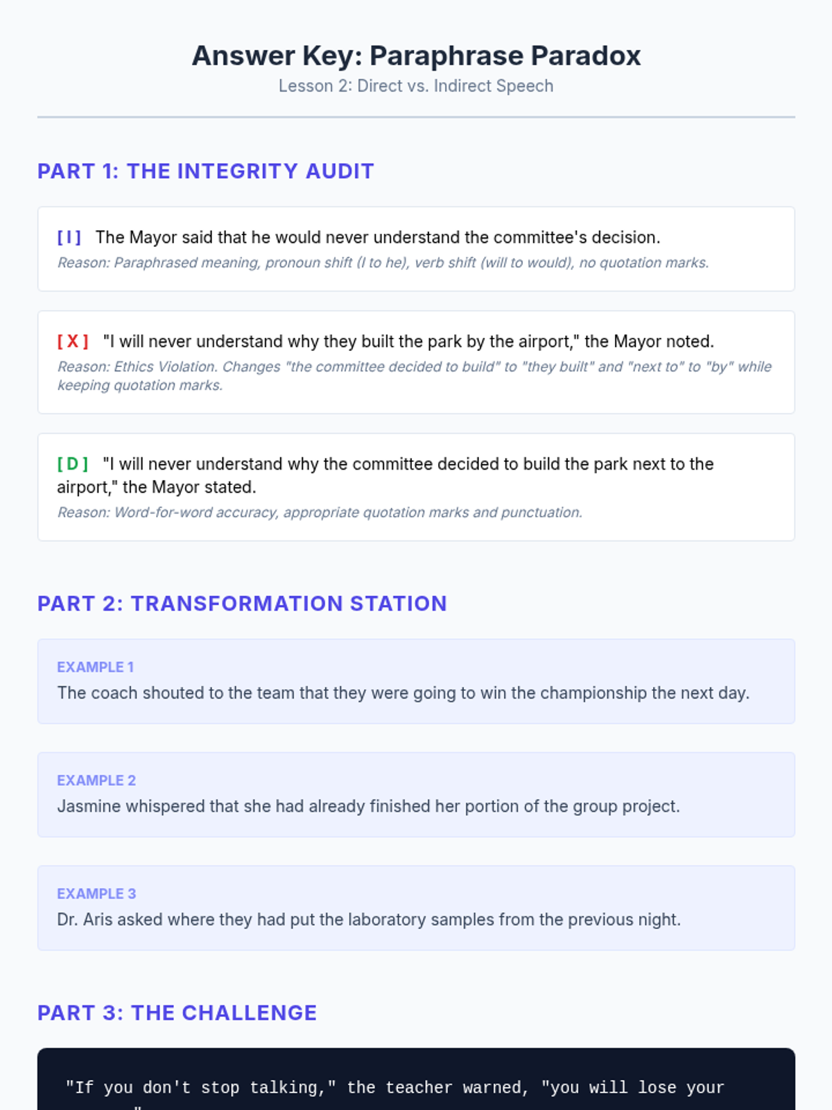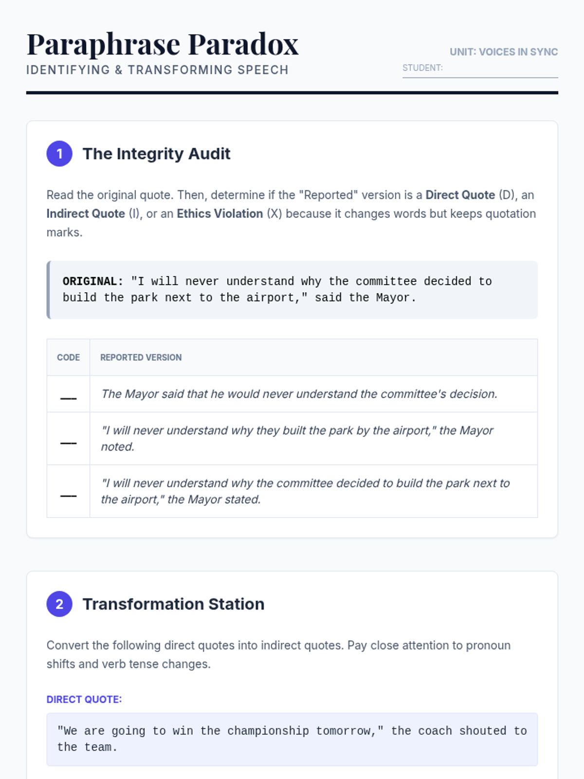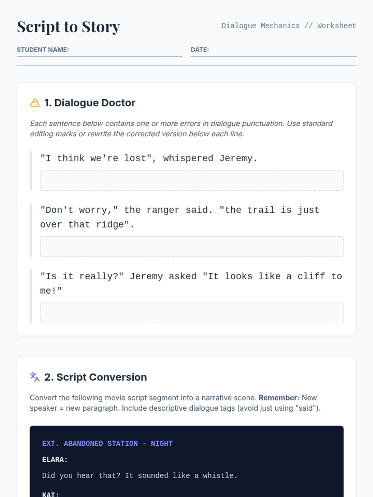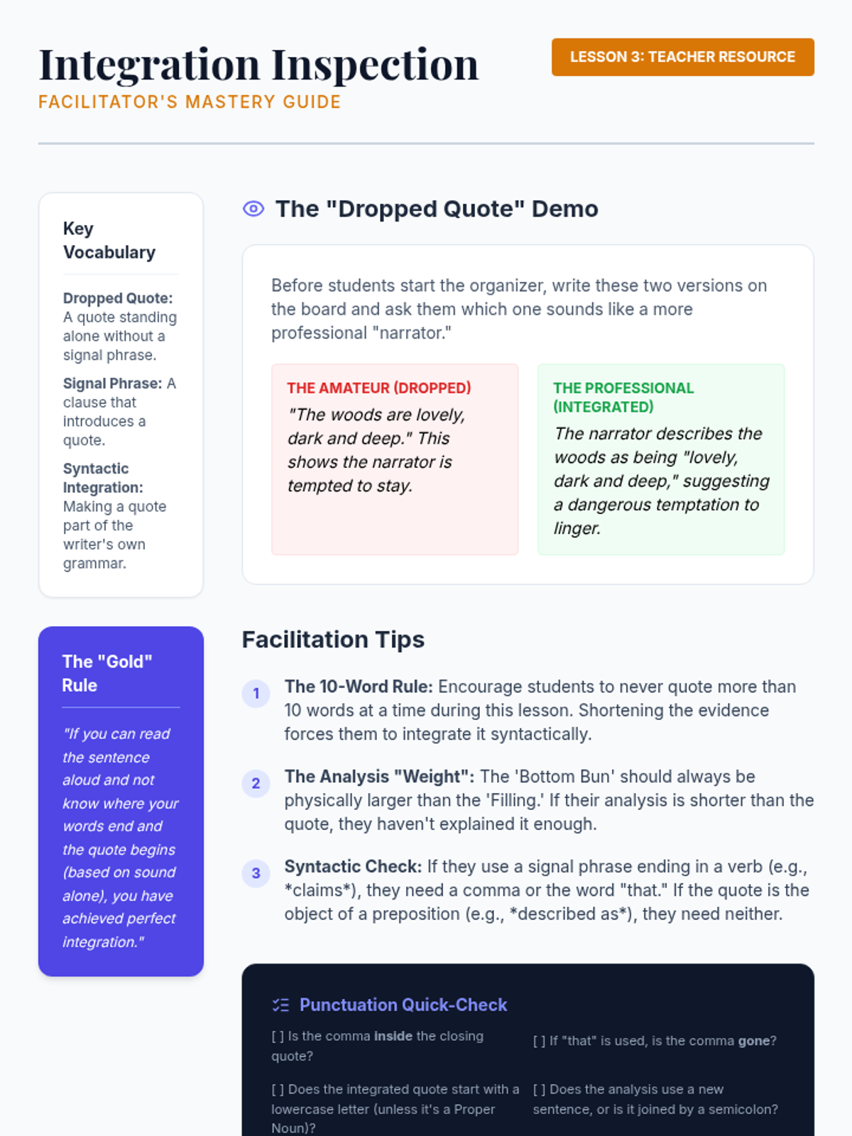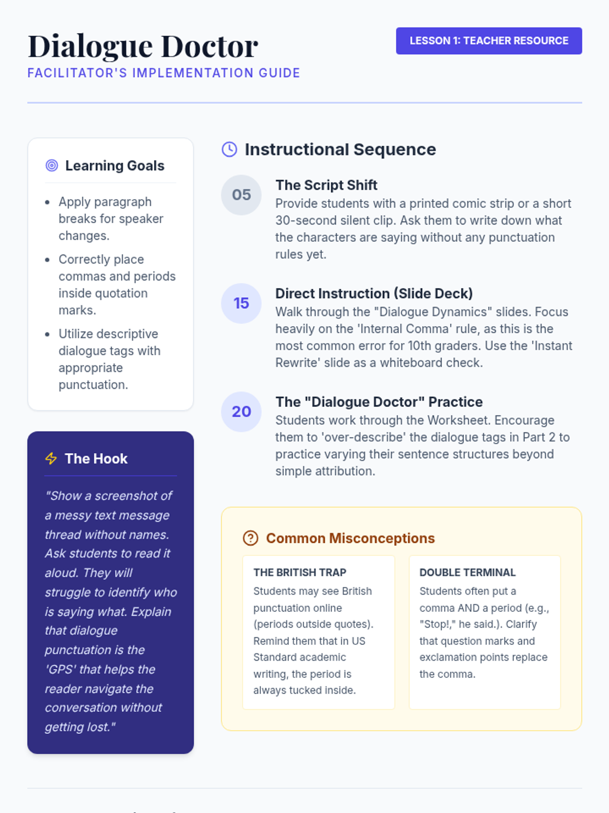 A comprehensive sequence for 10th-grade students on the mechanics of dialogue and textual evidence integration. This unit covers everything from basic dialogue punctuation to sophisticated quote embedding and MLA citation boundaries.