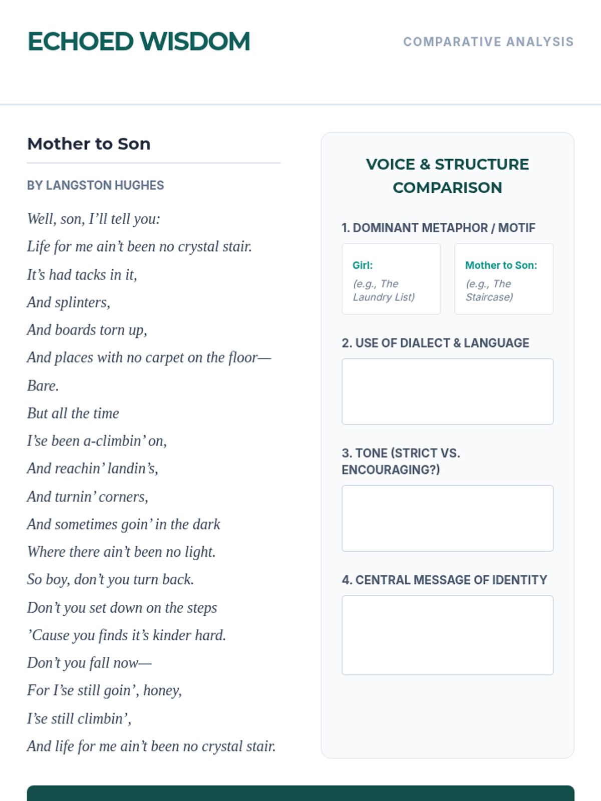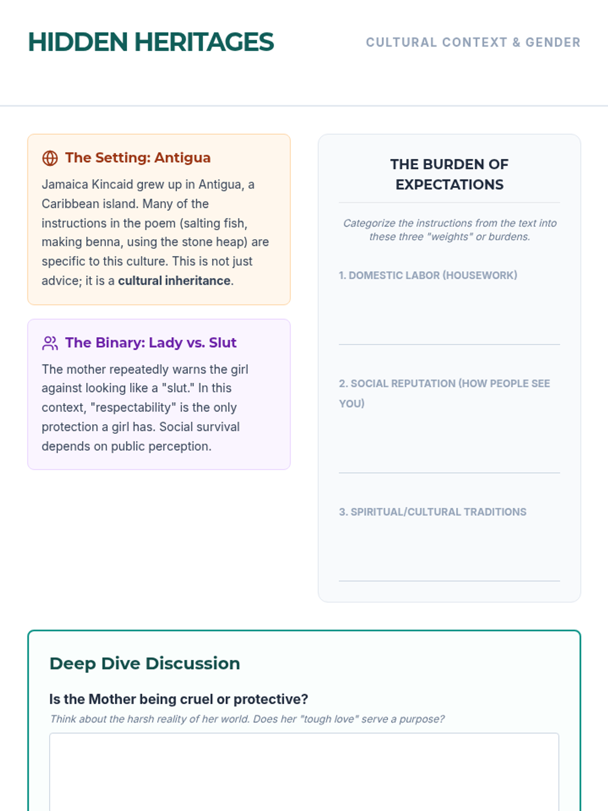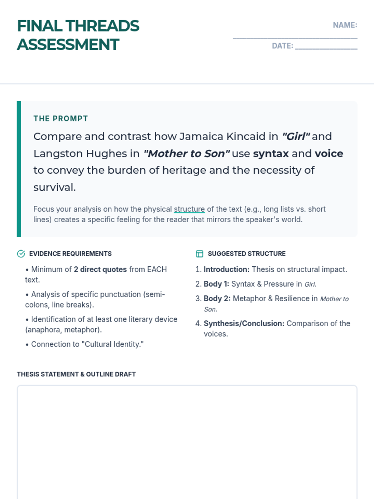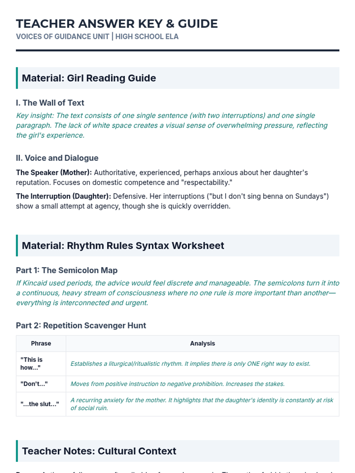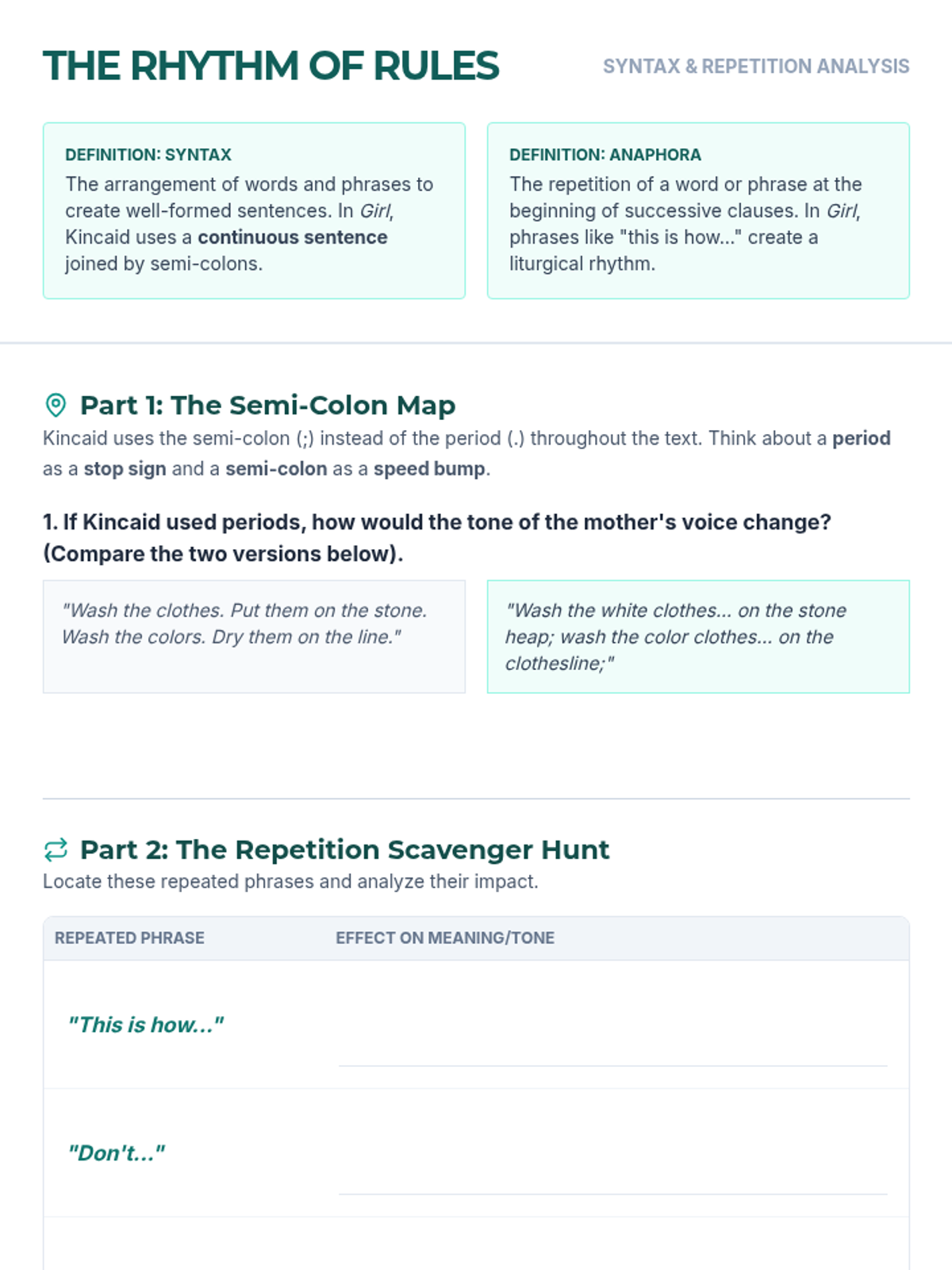 A five-day high school ELA unit exploring Jamaica Kincaid's 'Girl' through the lens of syntax, repetition, and cultural identity. Students analyze how structural choices mirror societal pressures before comparing the text with Langston Hughes' 'Mother to Son'.