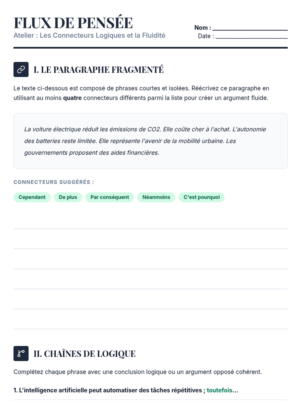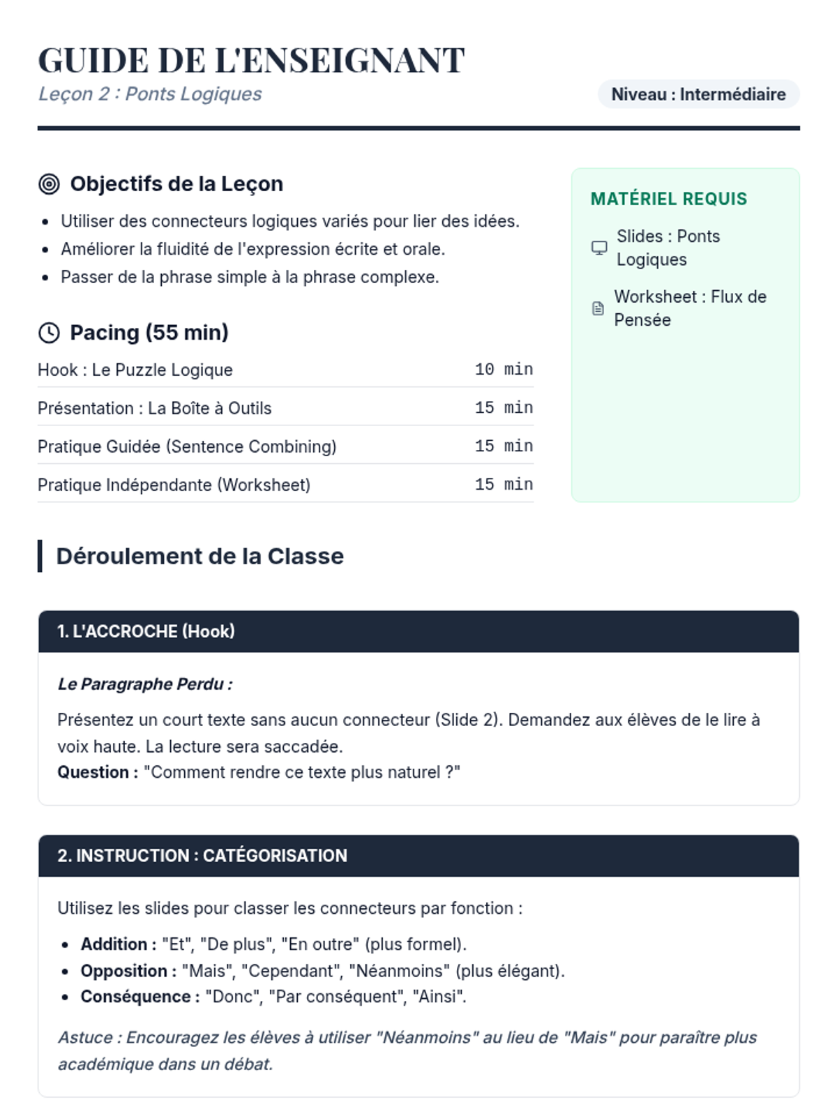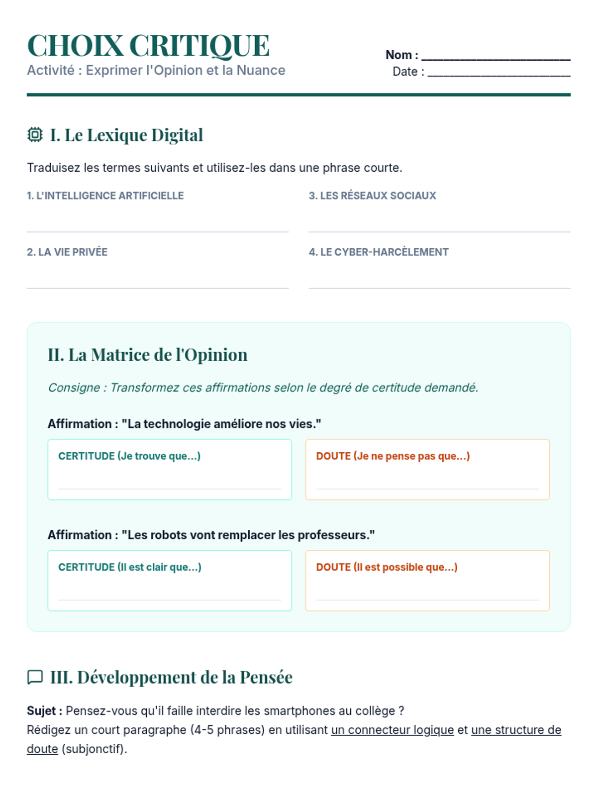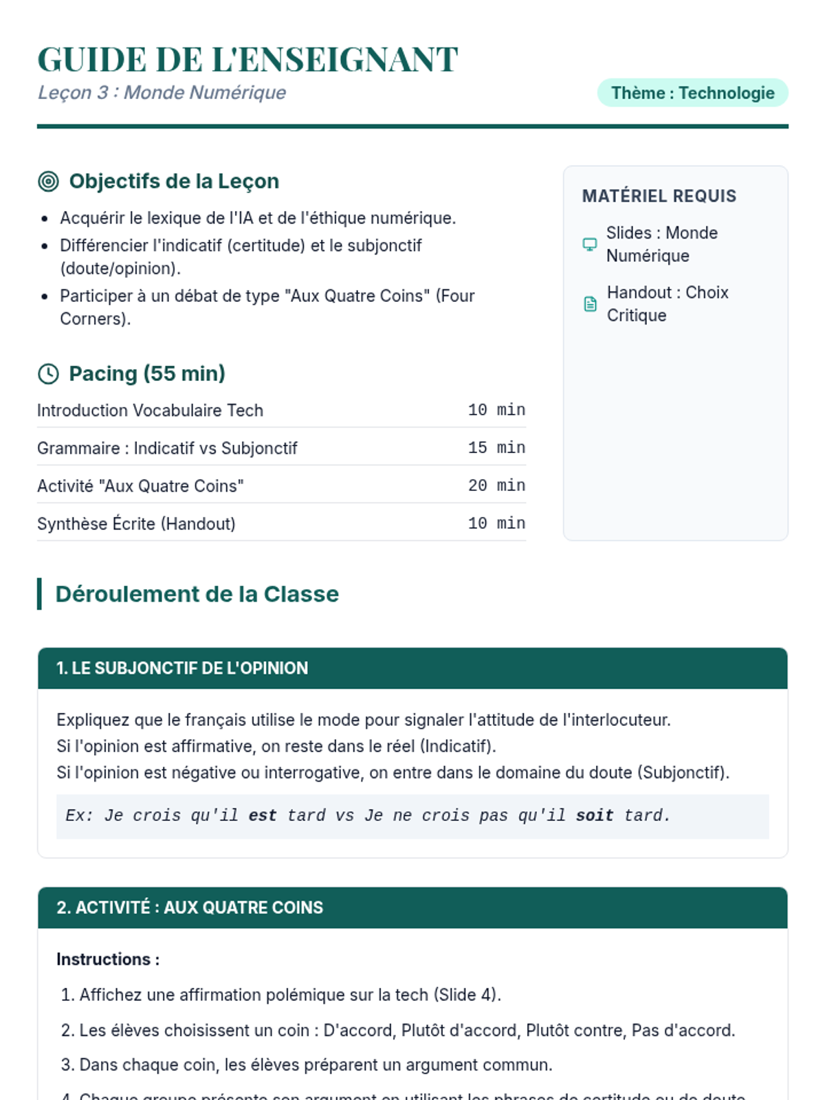 This sequence empowers 8th-grade French students to discuss complex global challenges like environment, technology, and human rights. Through thematic vocabulary, advanced logical connectors, and rhetorical structures, students build the skills necessary to participate in a formal debate on current events.