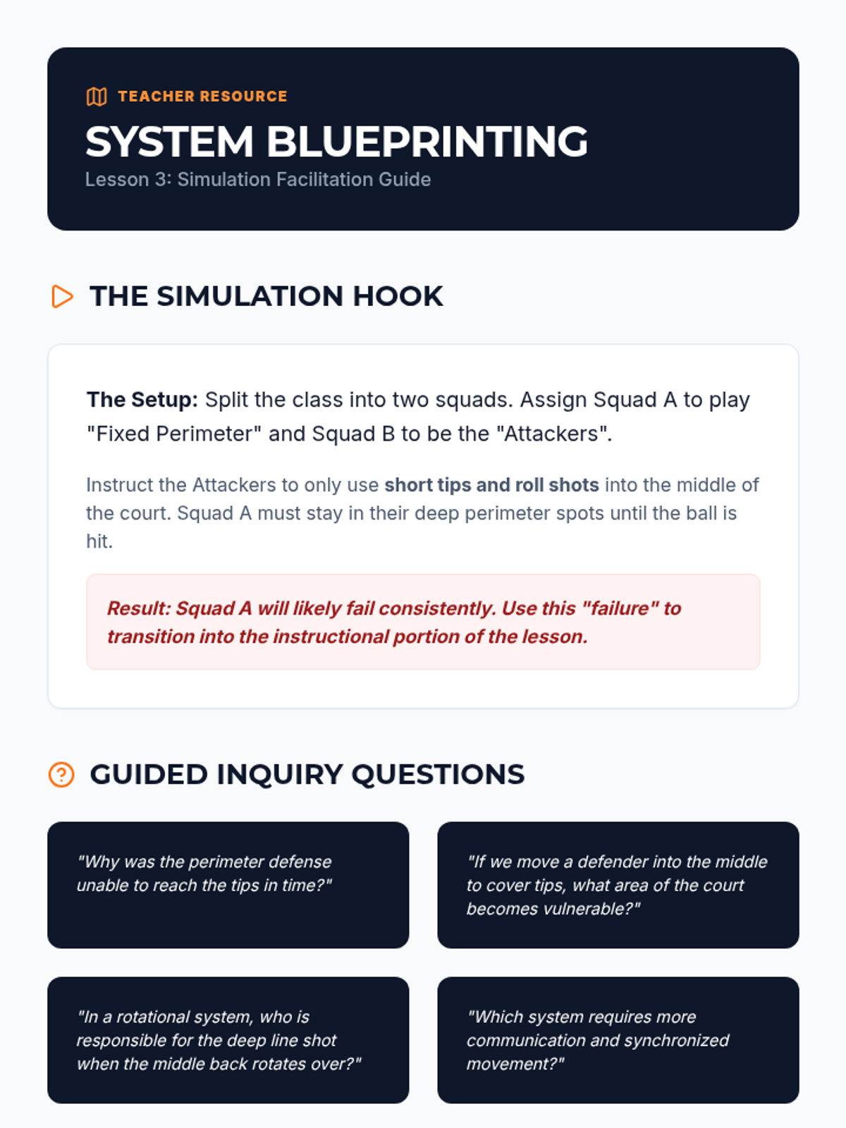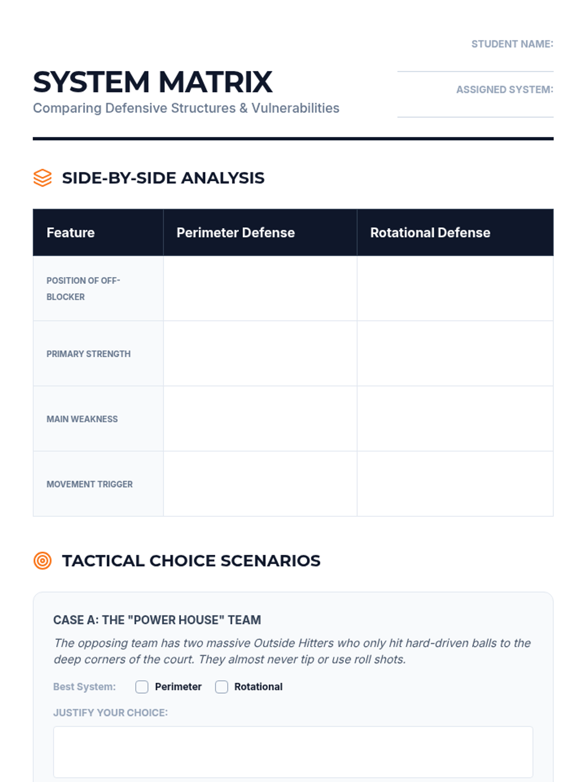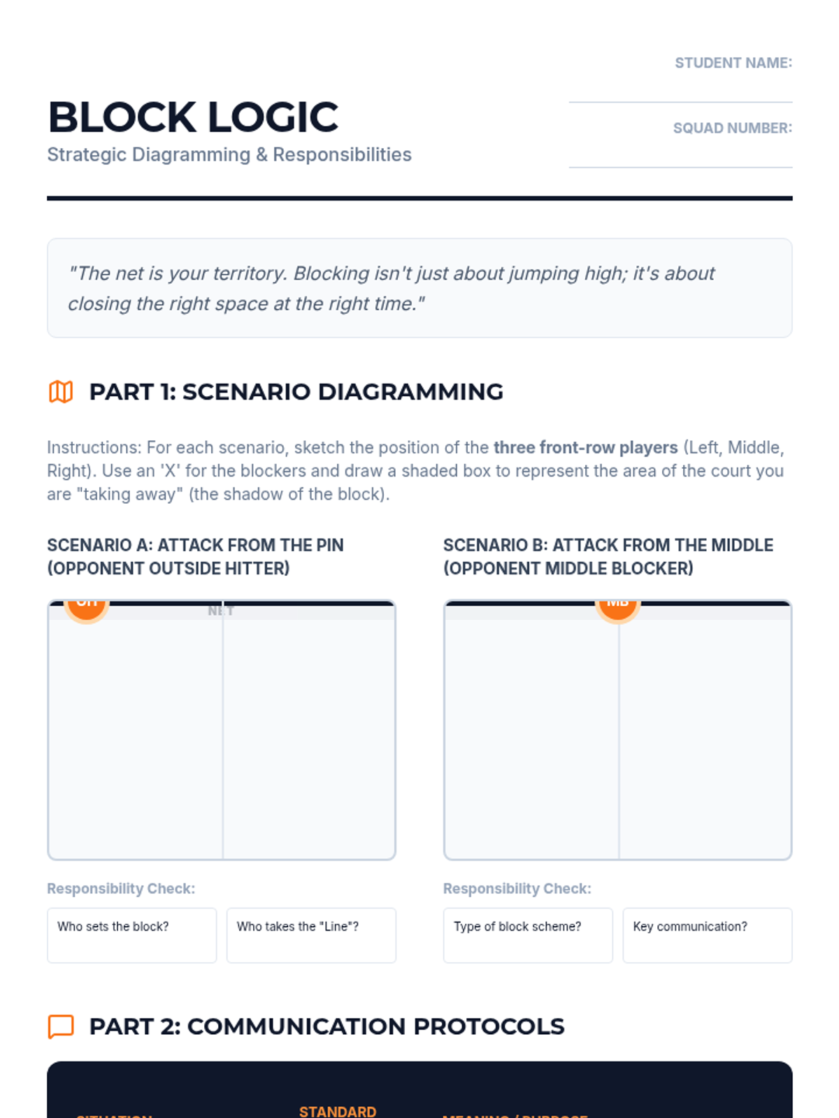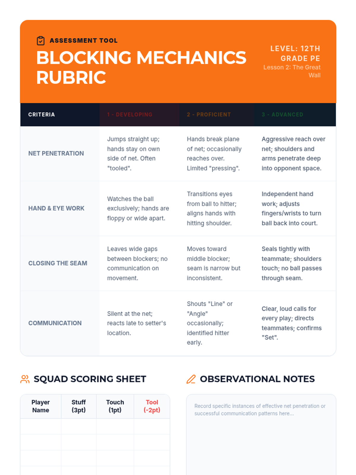 A comprehensive 12th-grade Physical Education sequence focusing on advanced volleyball defensive systems, anticipation, and the transition from defense to offense. Students analyze tactical formations, master emergency techniques, and develop the communication skills necessary for high-level team play.