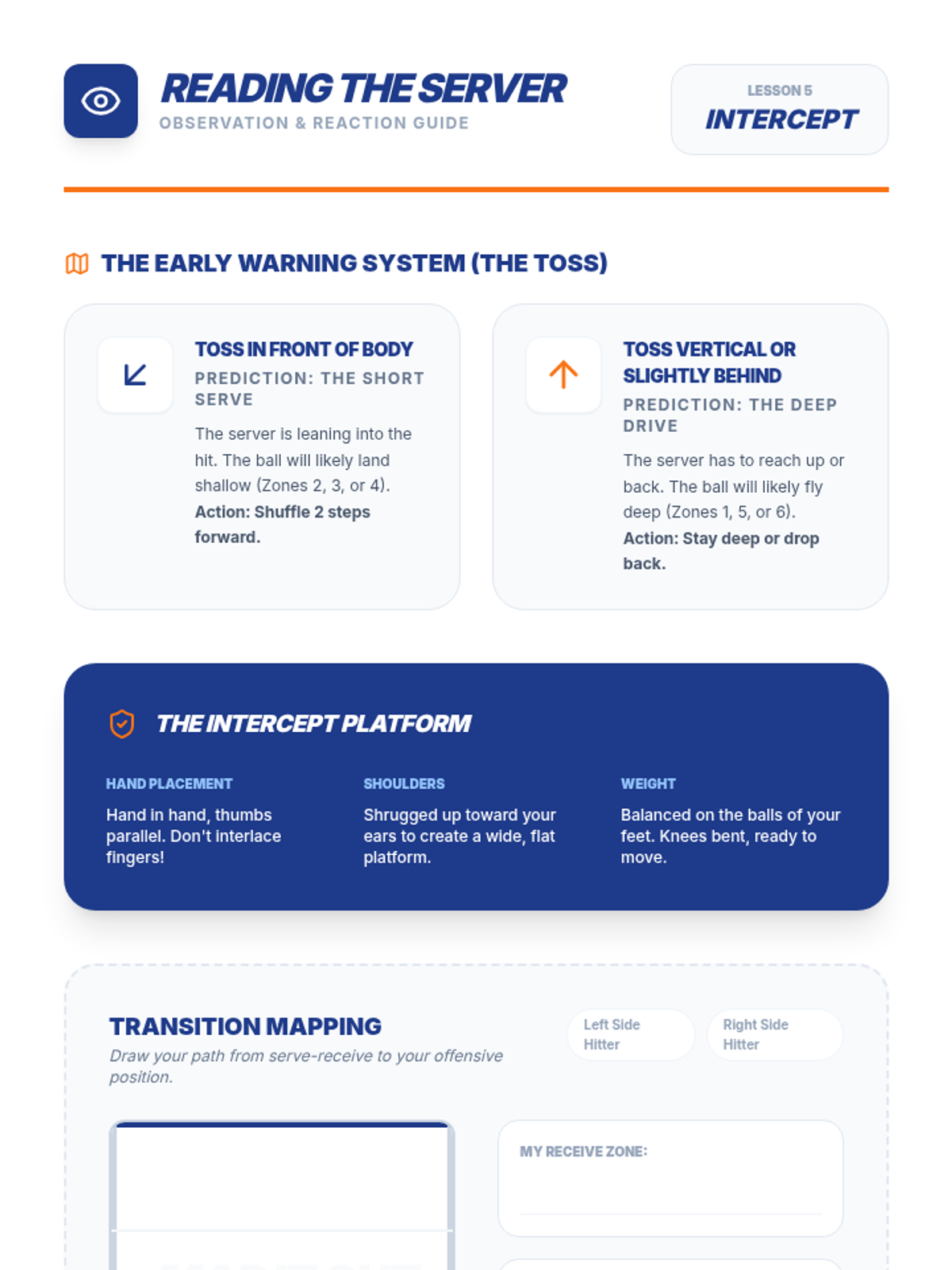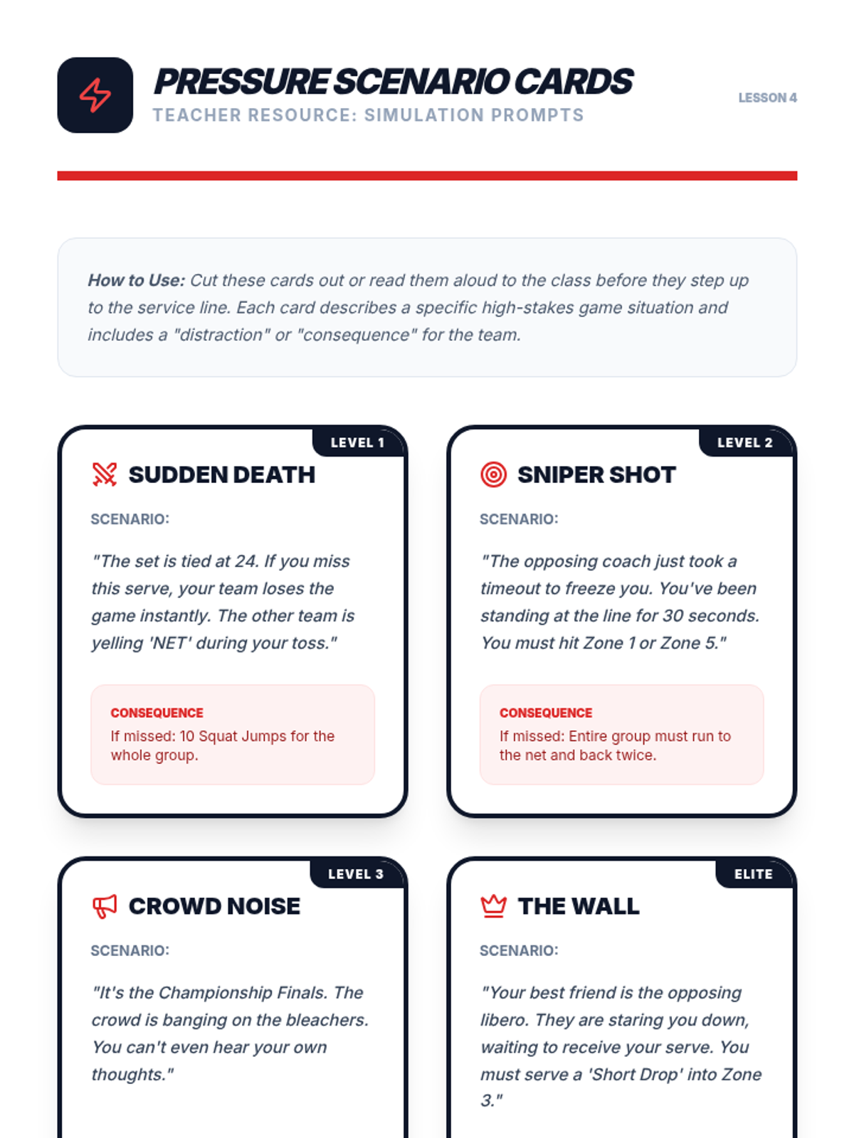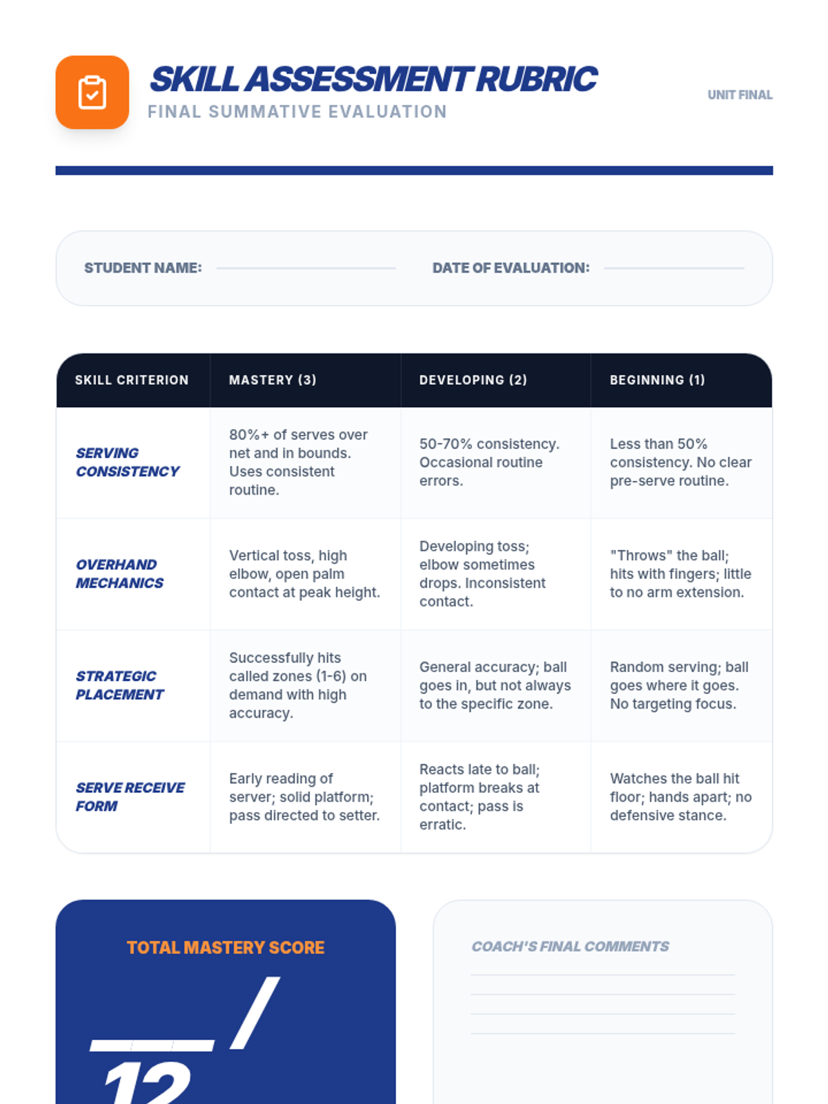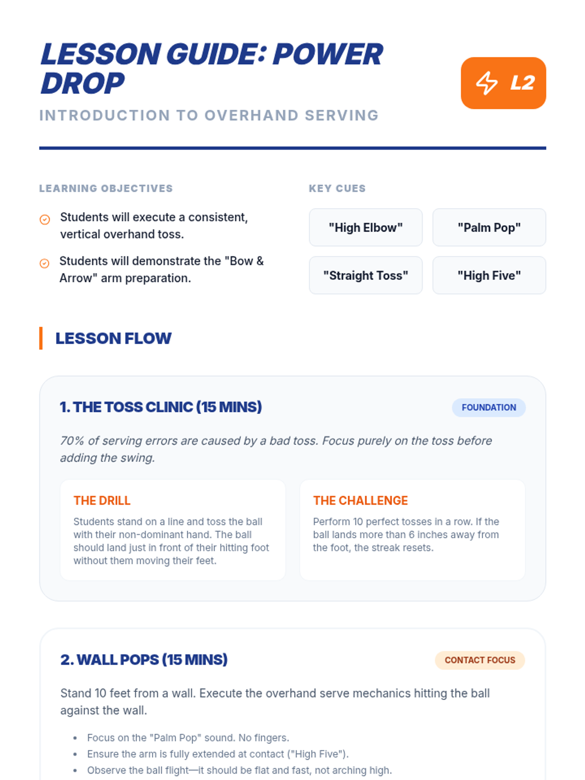 A comprehensive 5-lesson sequence for 8th-grade physical education focused on mastering volleyball serving. Students progress from underhand consistency to overhand mechanics, strategic zone targeting, and performing under pressure, concluding with serve-receive transitions.