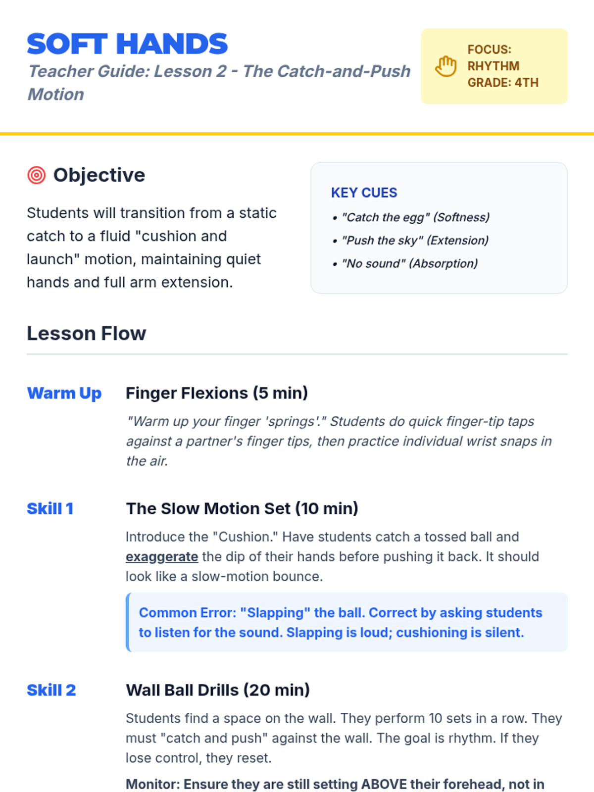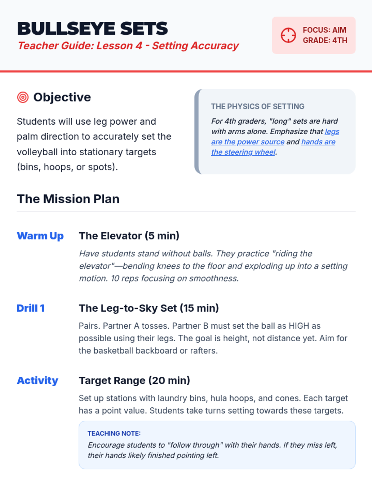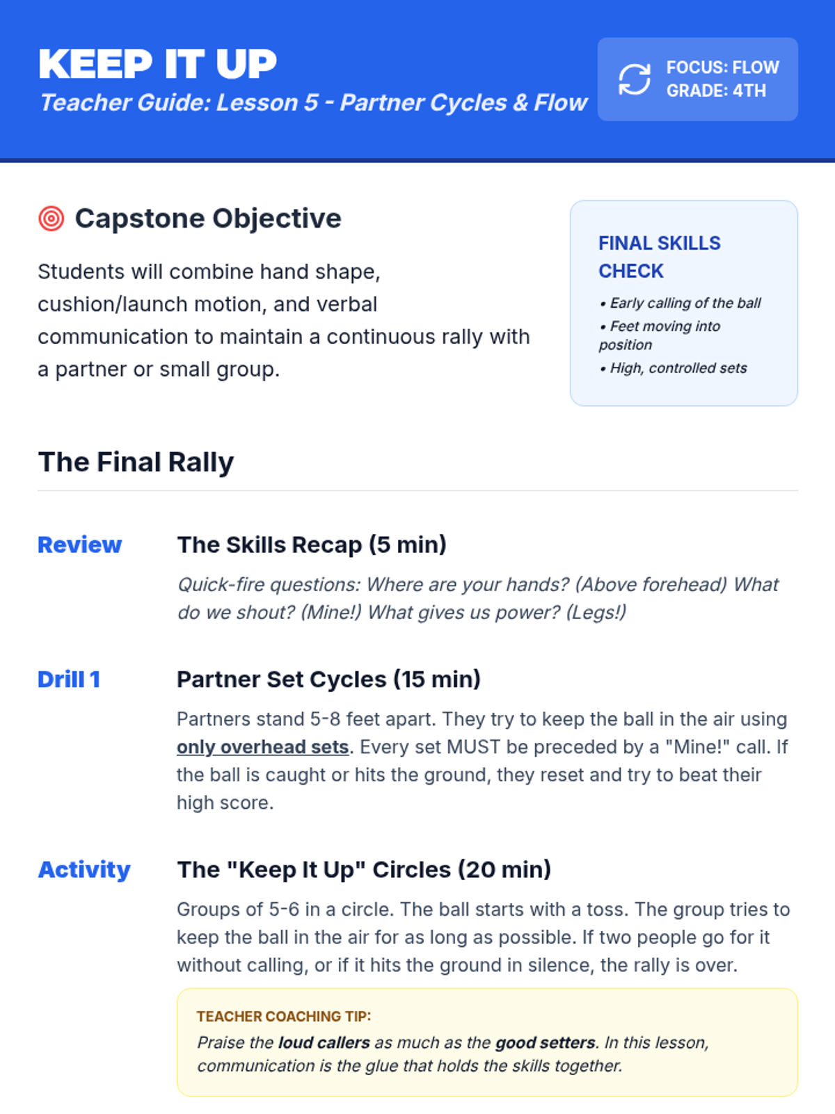 A 5-lesson sequence for 4th graders focusing on the overhead set and verbal communication in volleyball. Students progress from basic hand geometry to active gameplay communication.