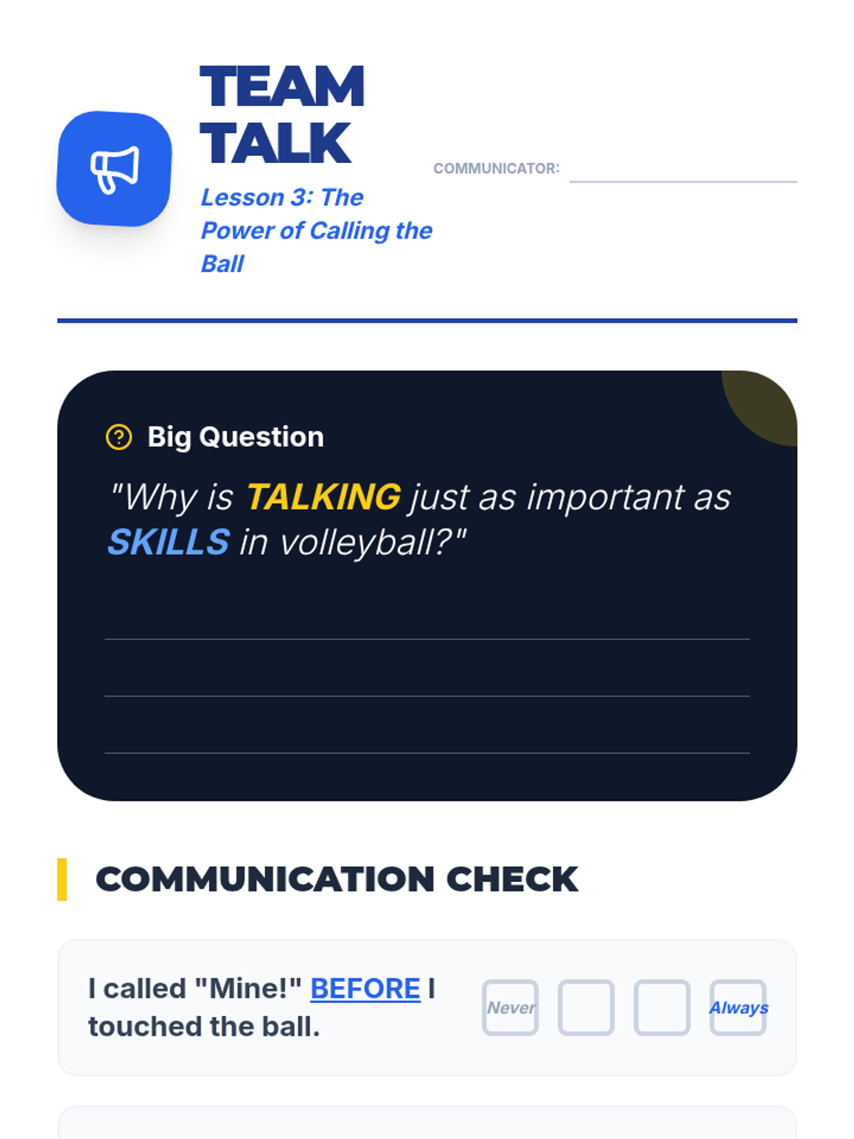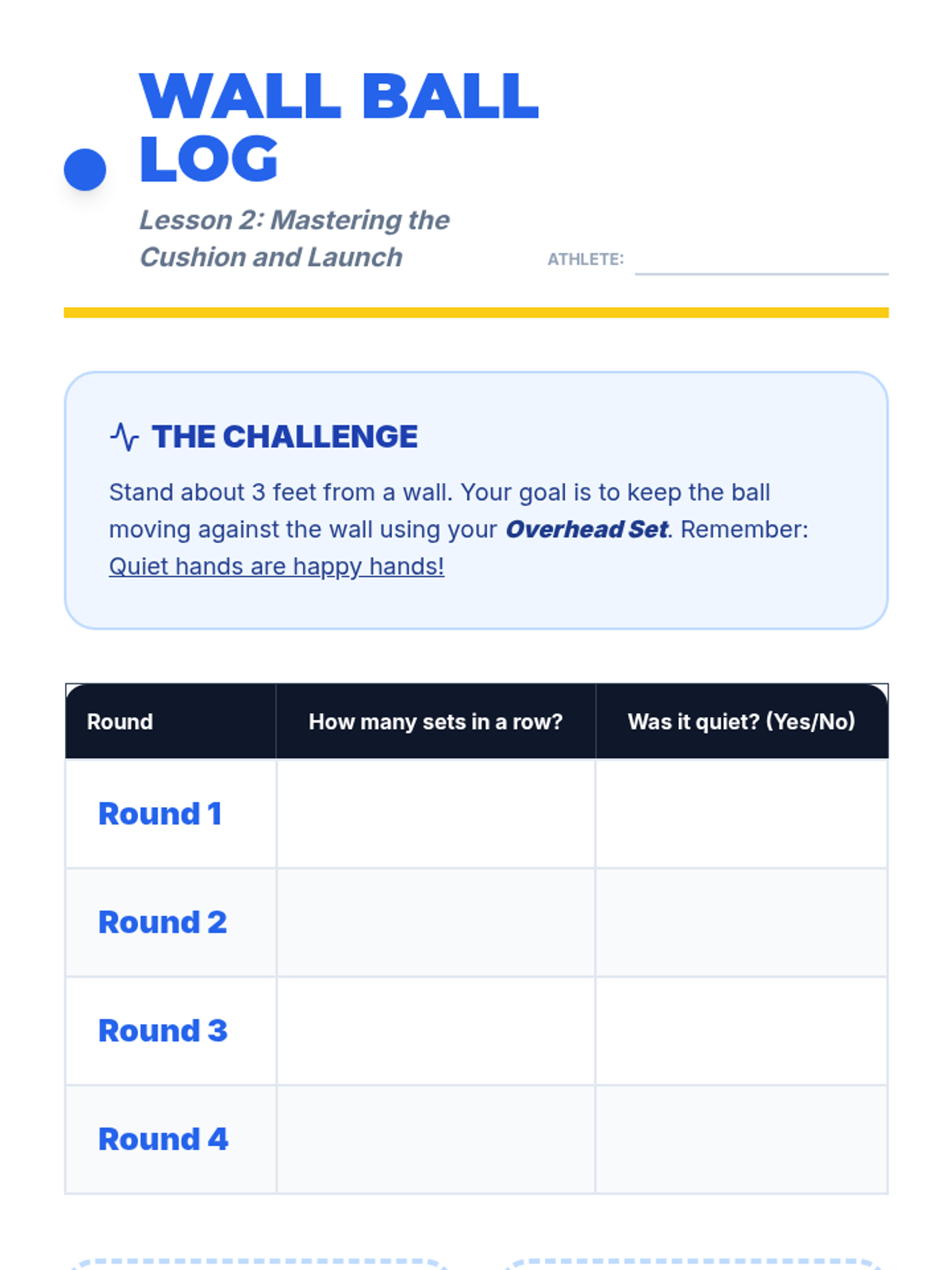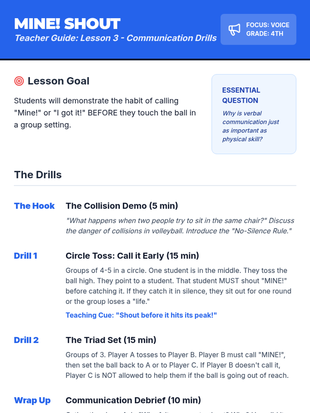 A 5-lesson sequence for 4th graders focusing on the overhead set and verbal communication in volleyball. Students progress from basic hand geometry to active gameplay communication.
