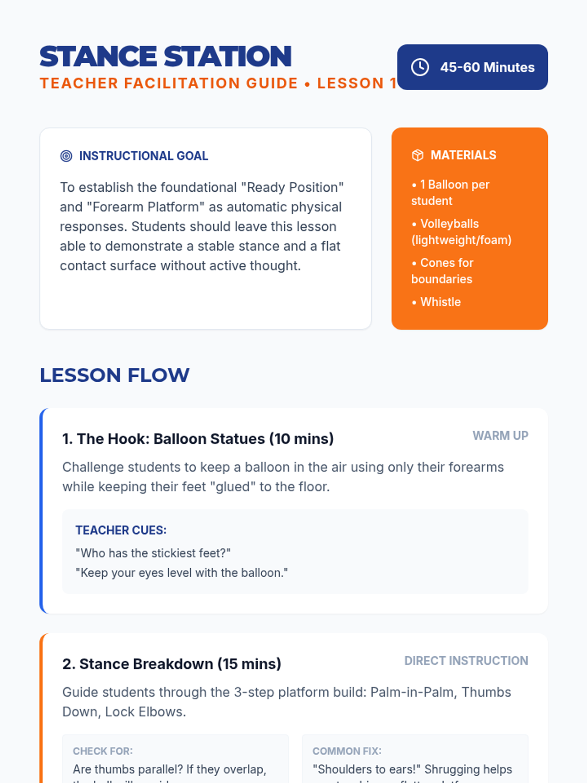 A comprehensive introduction to foundational volleyball skills, focusing on the forearm pass and underhand serve through an athletic, technique-driven approach. Students master body positioning and ball control to build confidence on the court.