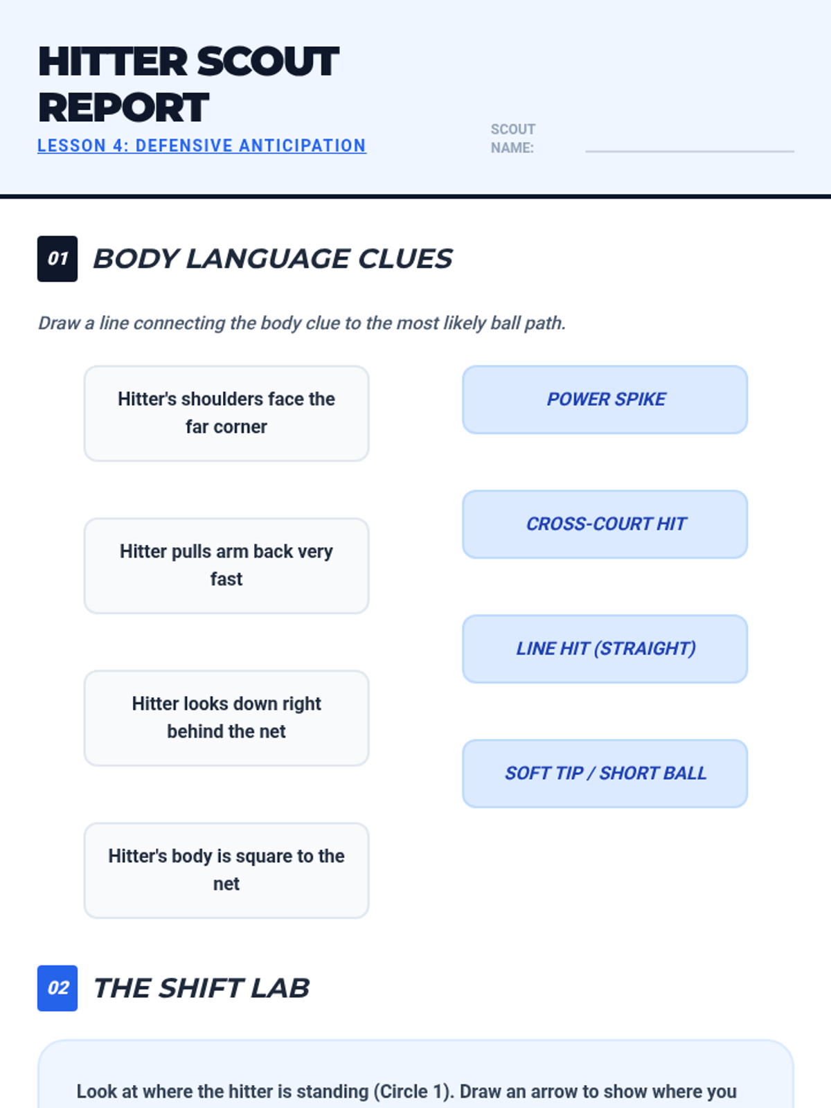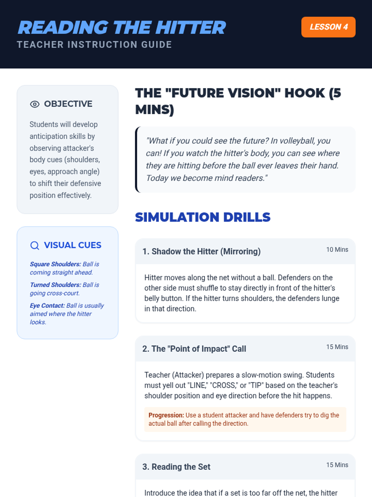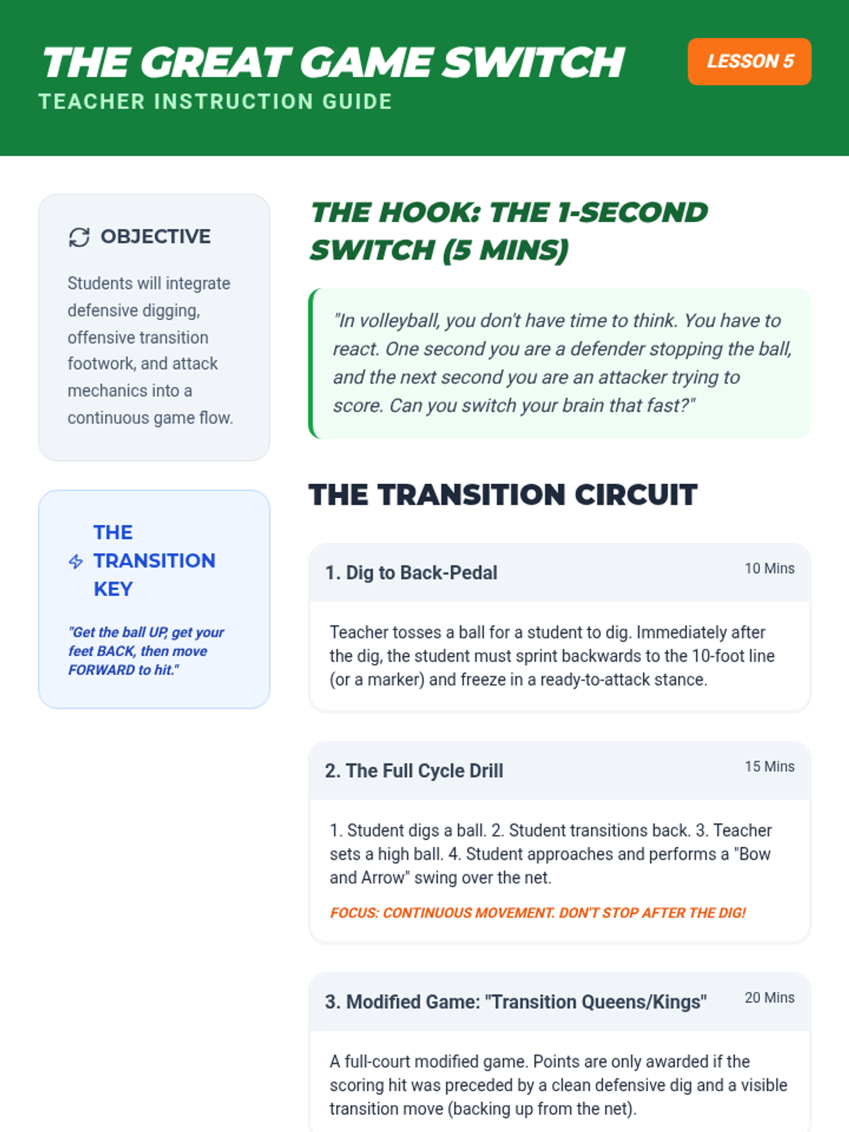 A comprehensive 4th-grade volleyball unit focused on transitioning between offensive attack mechanics and defensive positioning. Students learn the 'bow and arrow' arm swing, strategic ball placement, the defensive ready stance, and how to read an opponent's movements to anticipate play.
