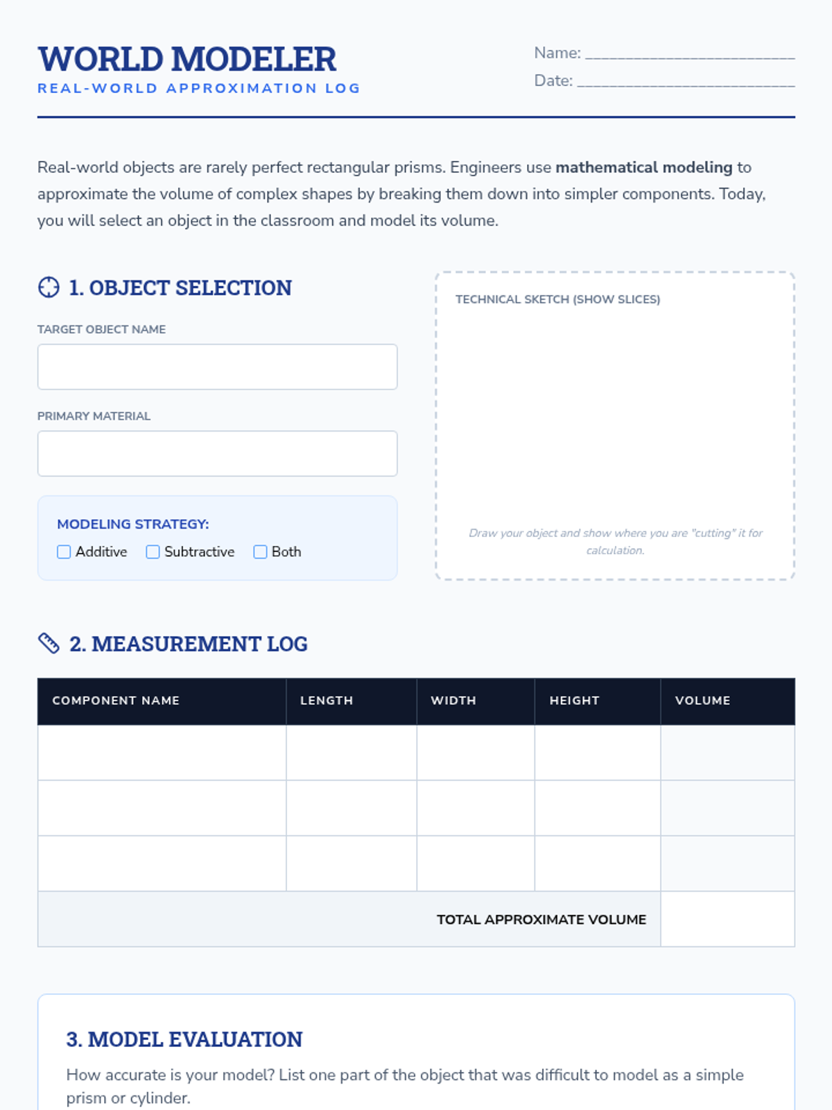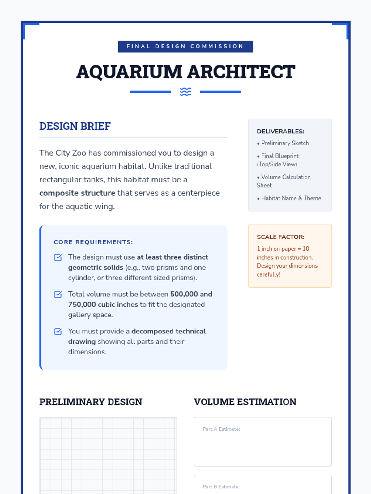 This sequence guides 6th-grade students through the process of analyzing and calculating the volume of composite 3D figures. Students progress from basic spatial decomposition to additive and subtractive volume strategies, culminating in a real-world design project for a custom aquarium.