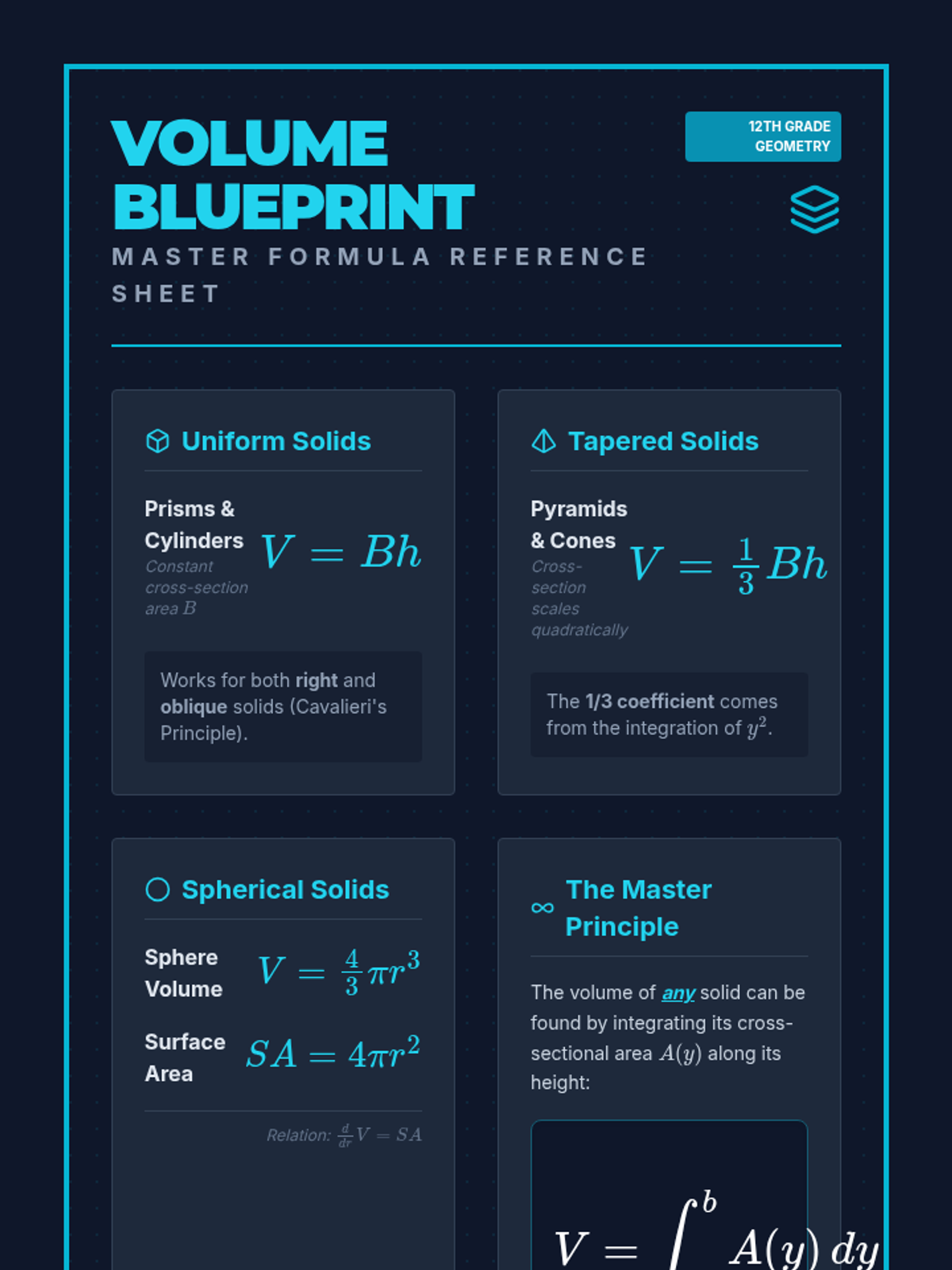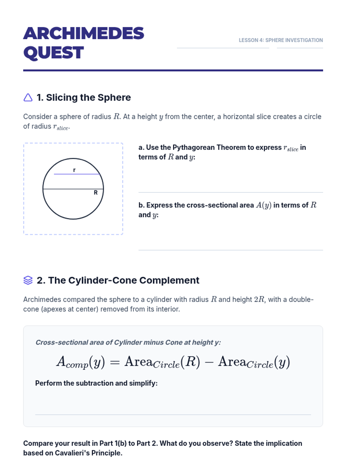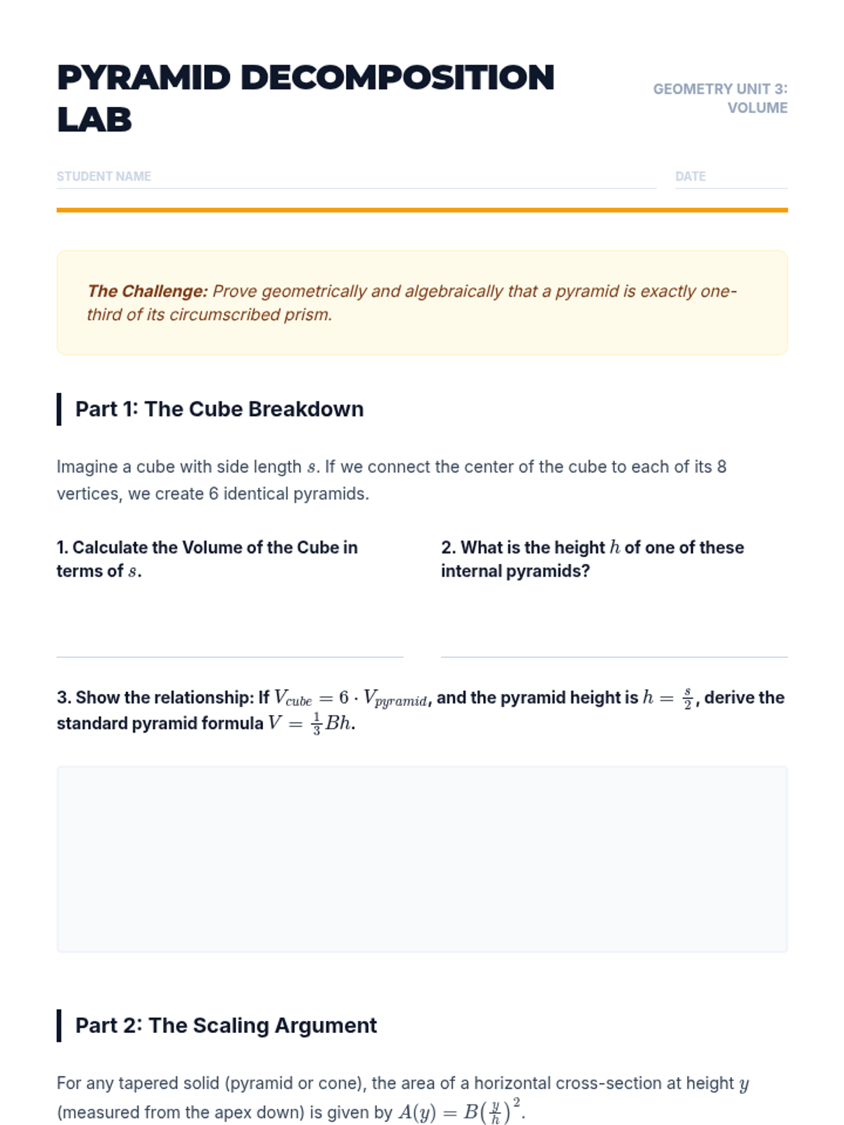 A 12th-grade geometry sequence exploring the derivation of volume formulas using Cavalieri's Principle, limits, and cross-sectional analysis to bridge geometry and calculus.