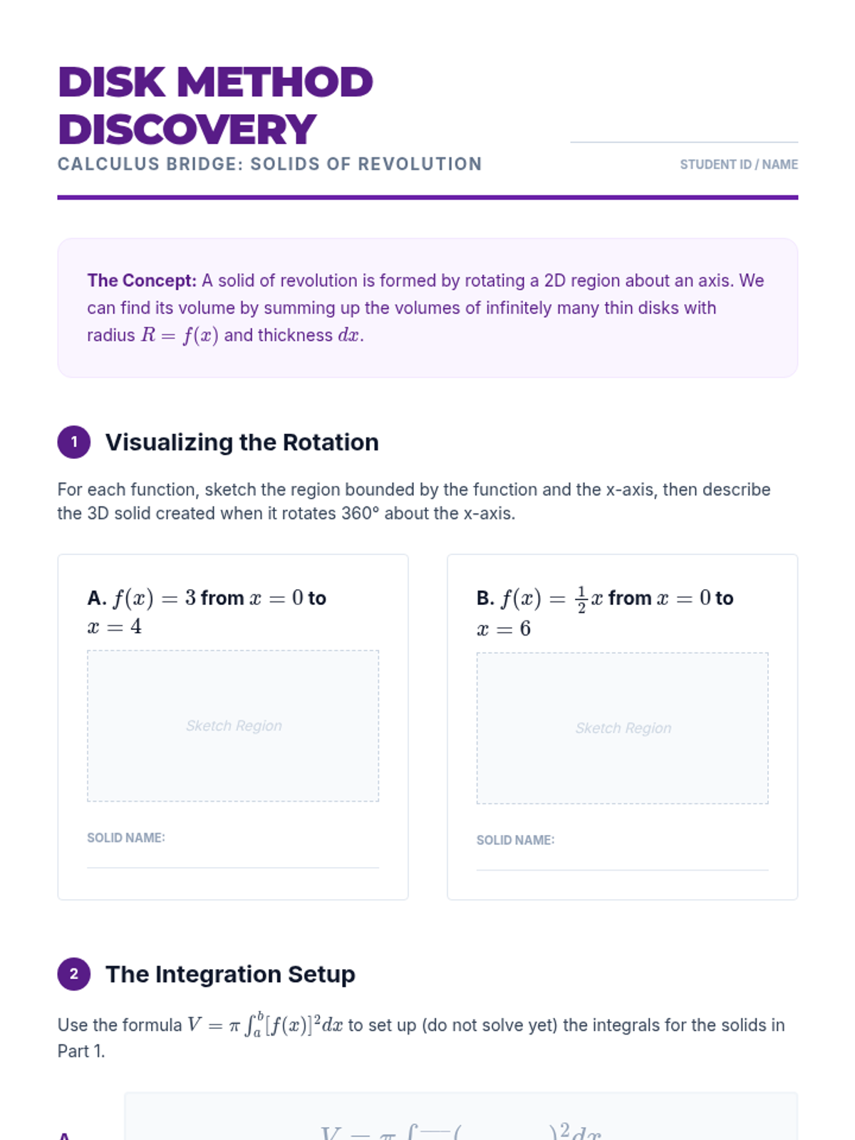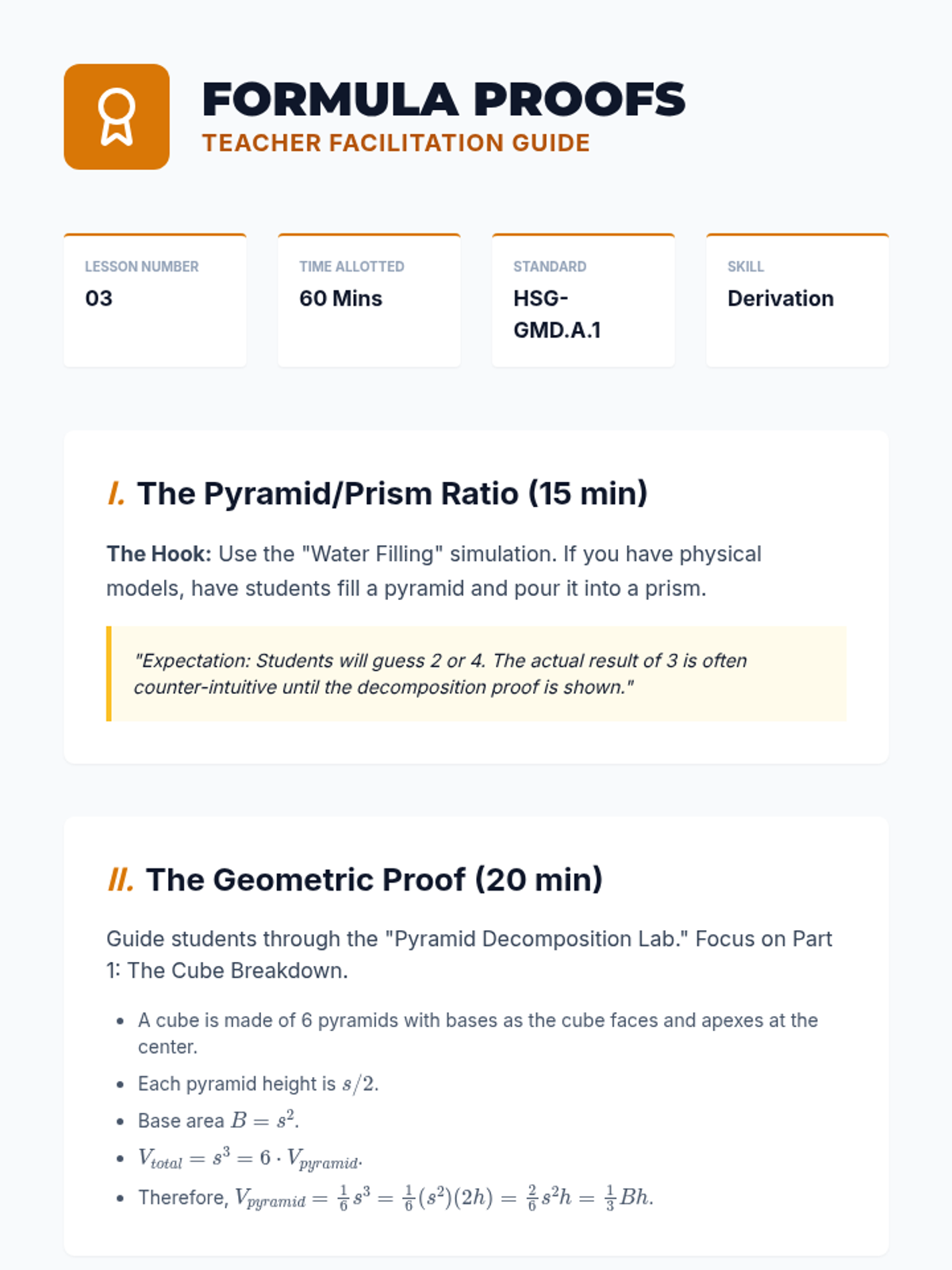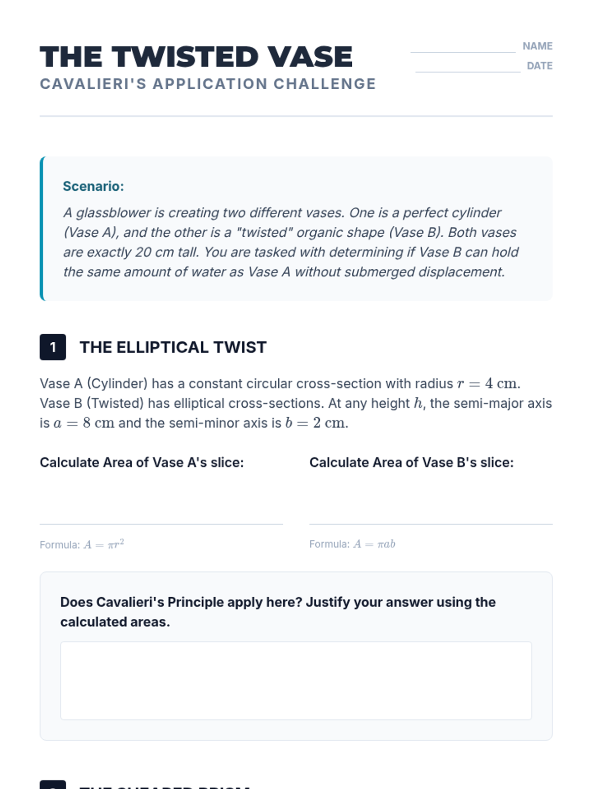A 12th-grade geometry sequence exploring the derivation of volume formulas using Cavalieri's Principle, limits, and cross-sectional analysis to bridge geometry and calculus.