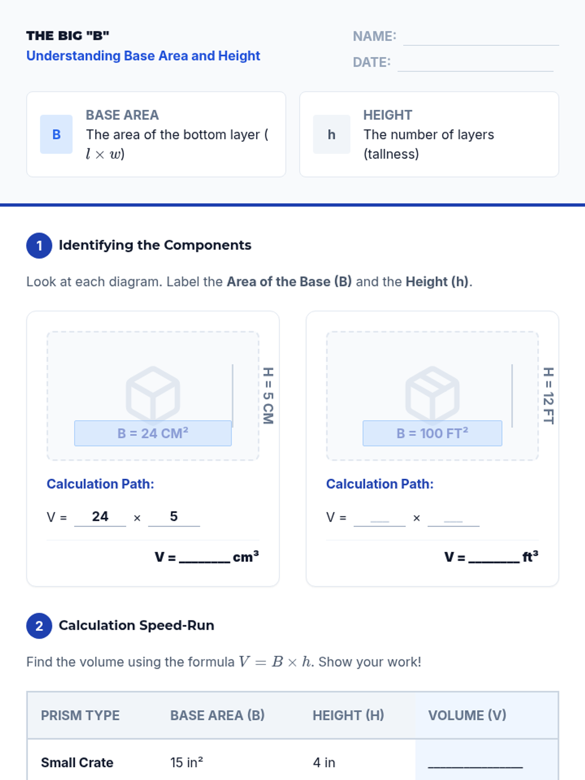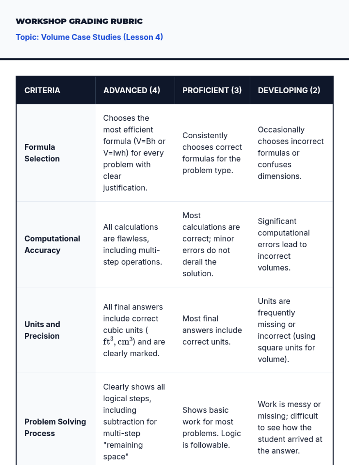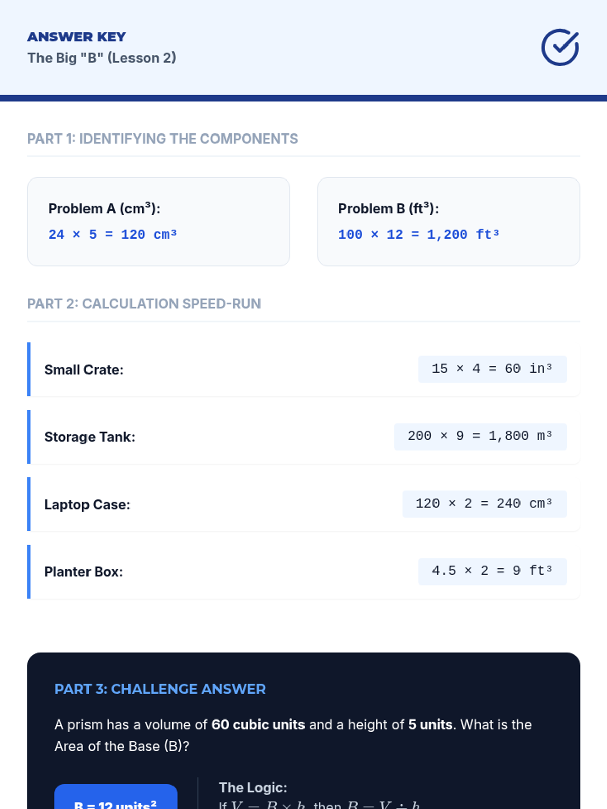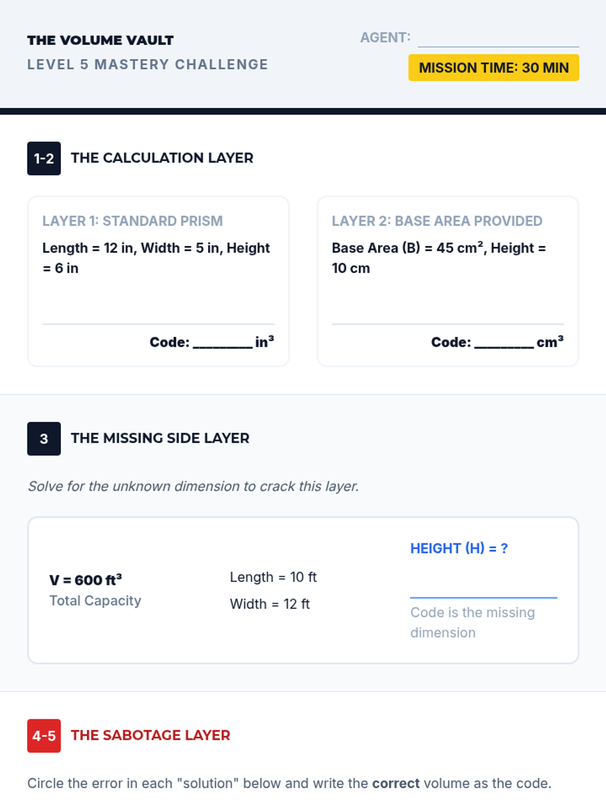 This workshop-style sequence transitions students from counting cubes to applying standard algorithms for calculating volume. Students derive and master the formulas V = l × w × h and V = B × h, progressing from straightforward calculations to solving for missing dimensions and complex real-world word problems.