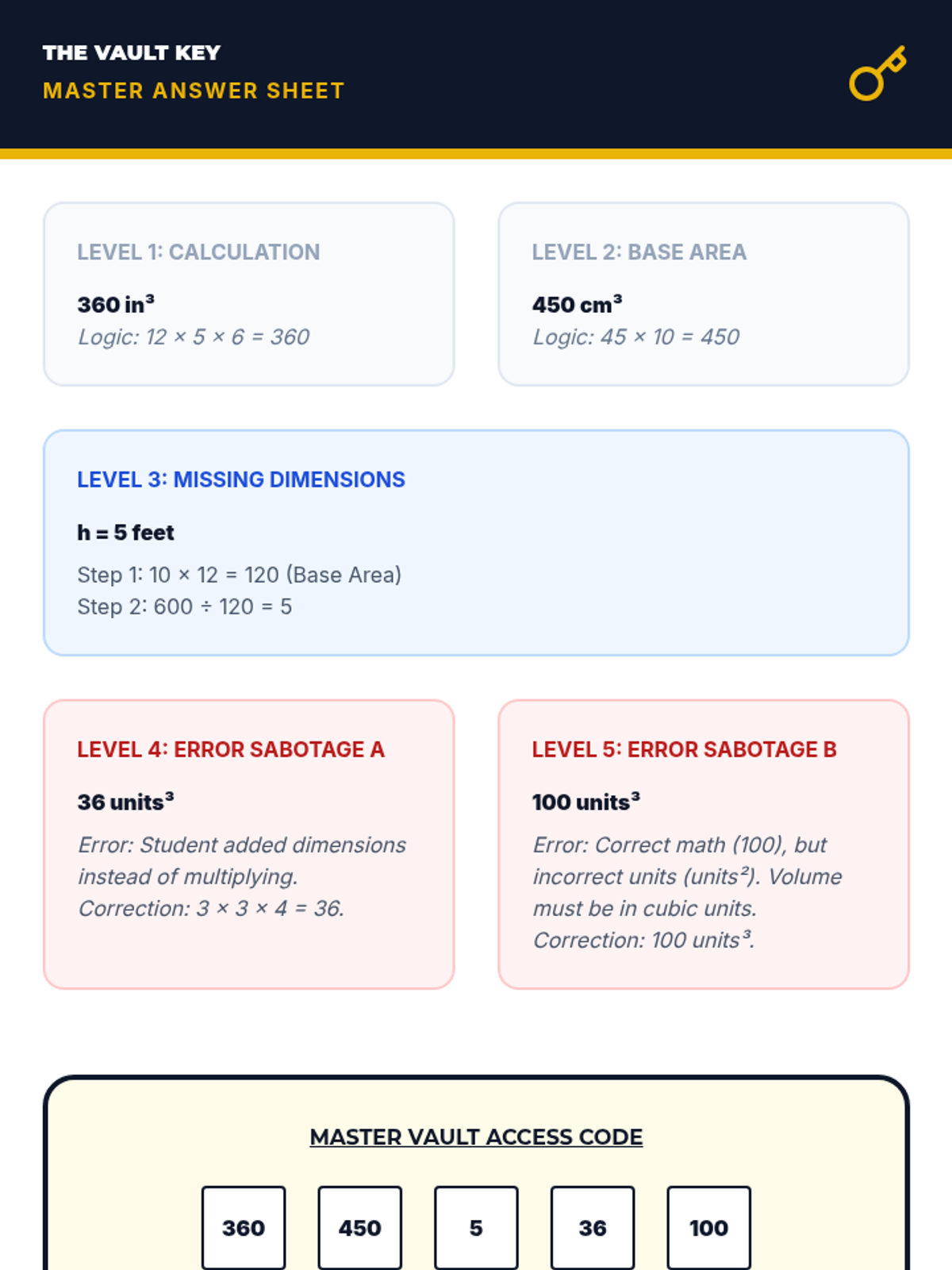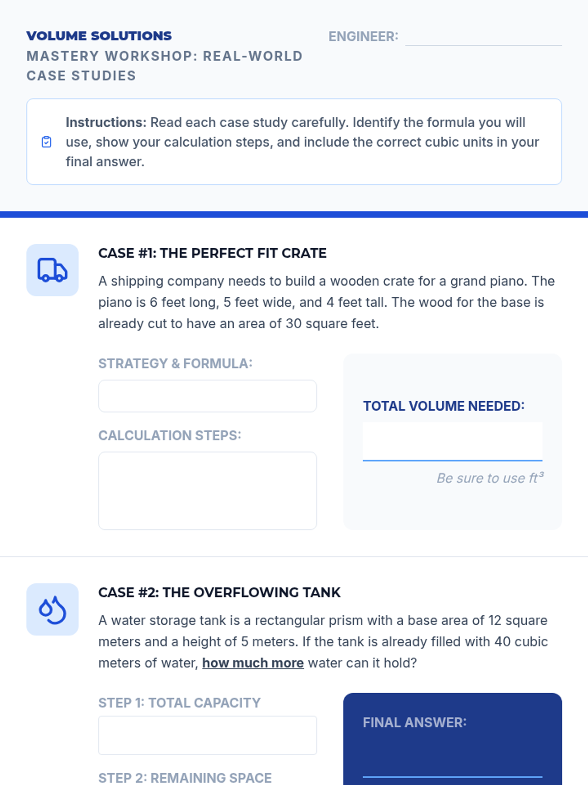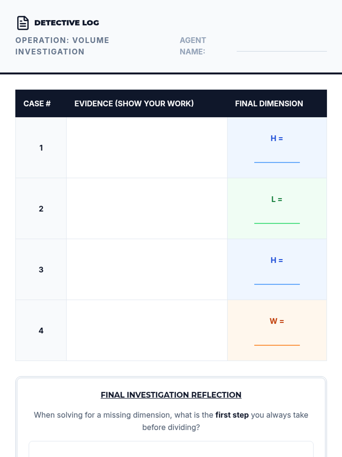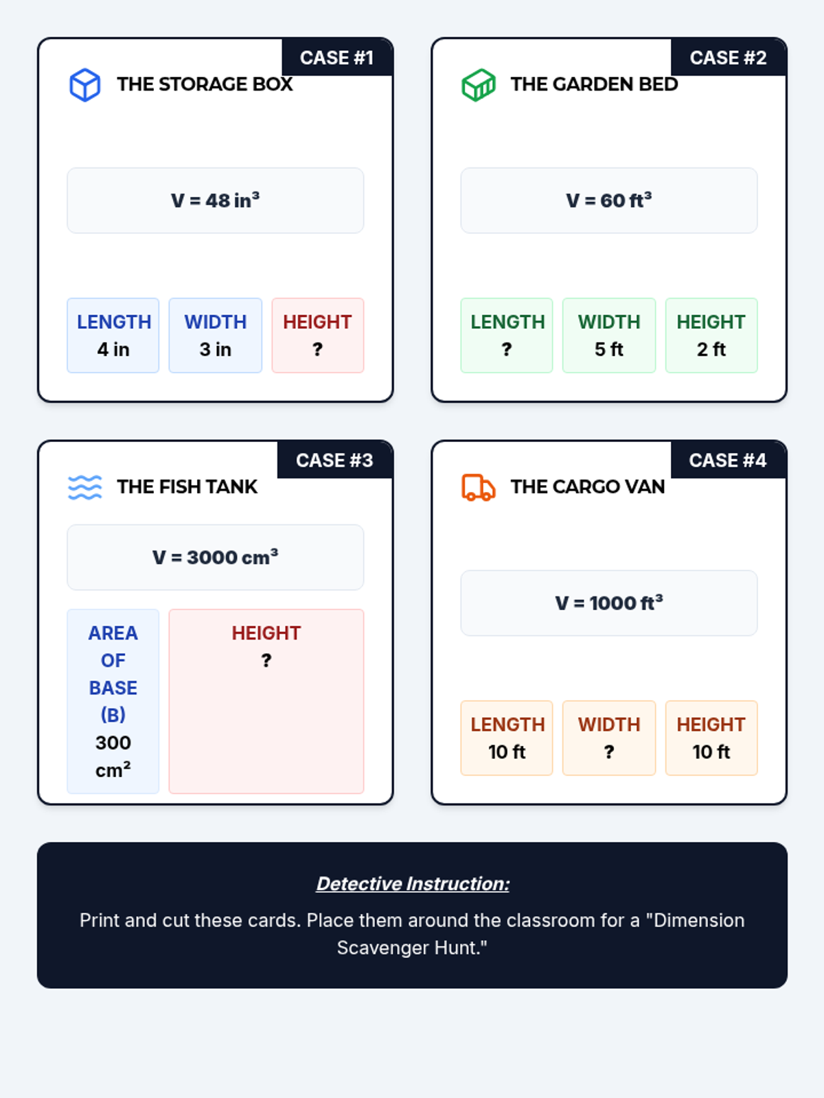 This workshop-style sequence transitions students from counting cubes to applying standard algorithms for calculating volume. Students derive and master the formulas V = l × w × h and V = B × h, progressing from straightforward calculations to solving for missing dimensions and complex real-world word problems.