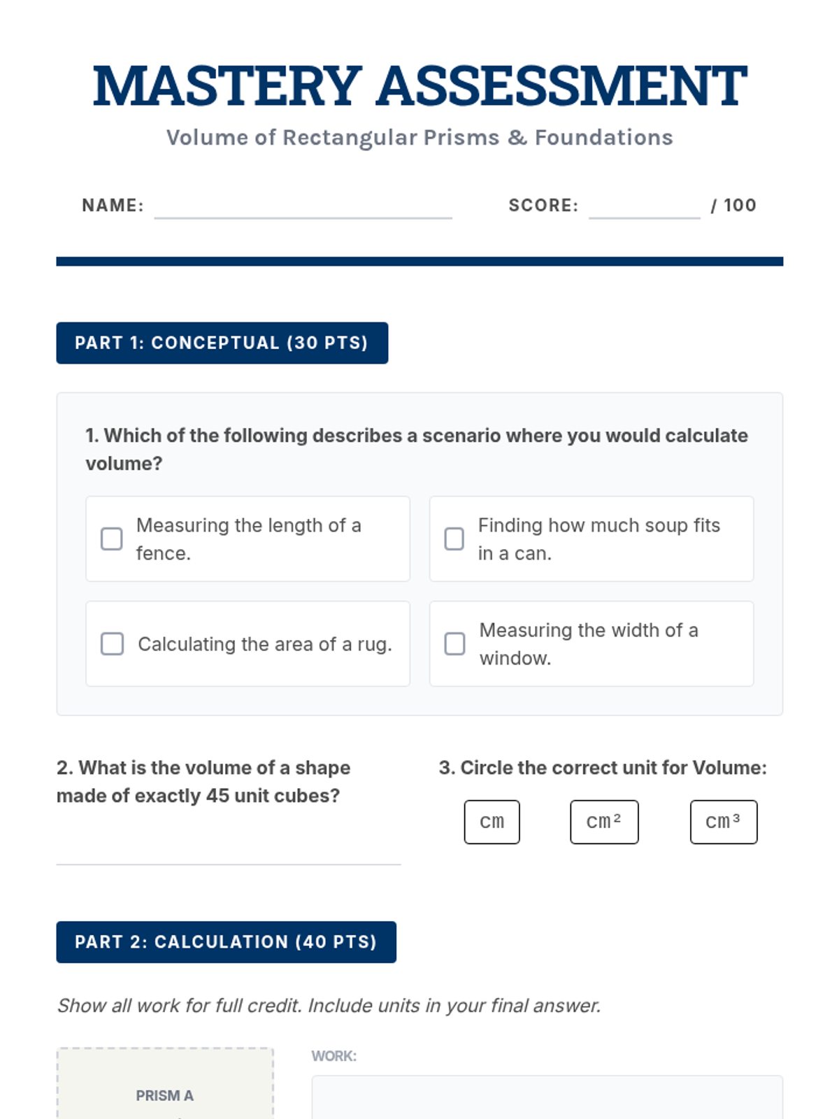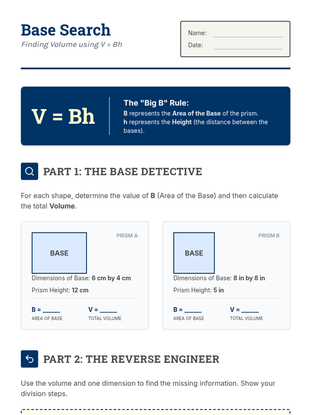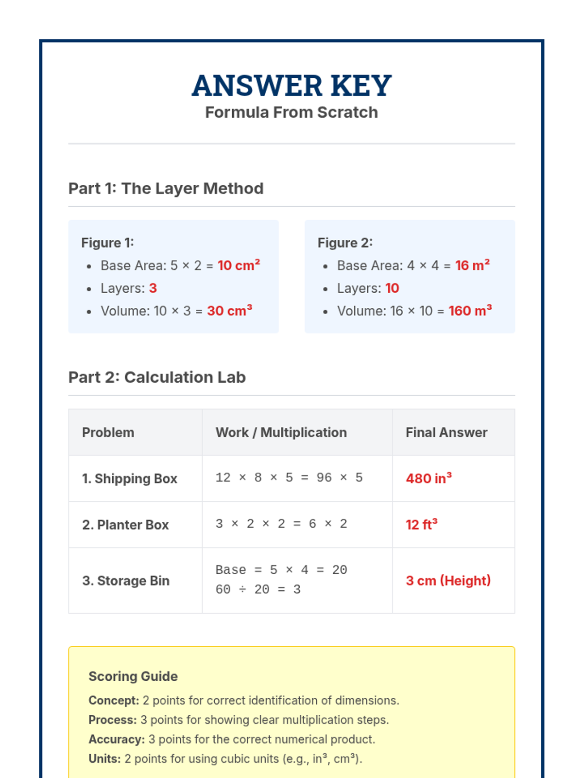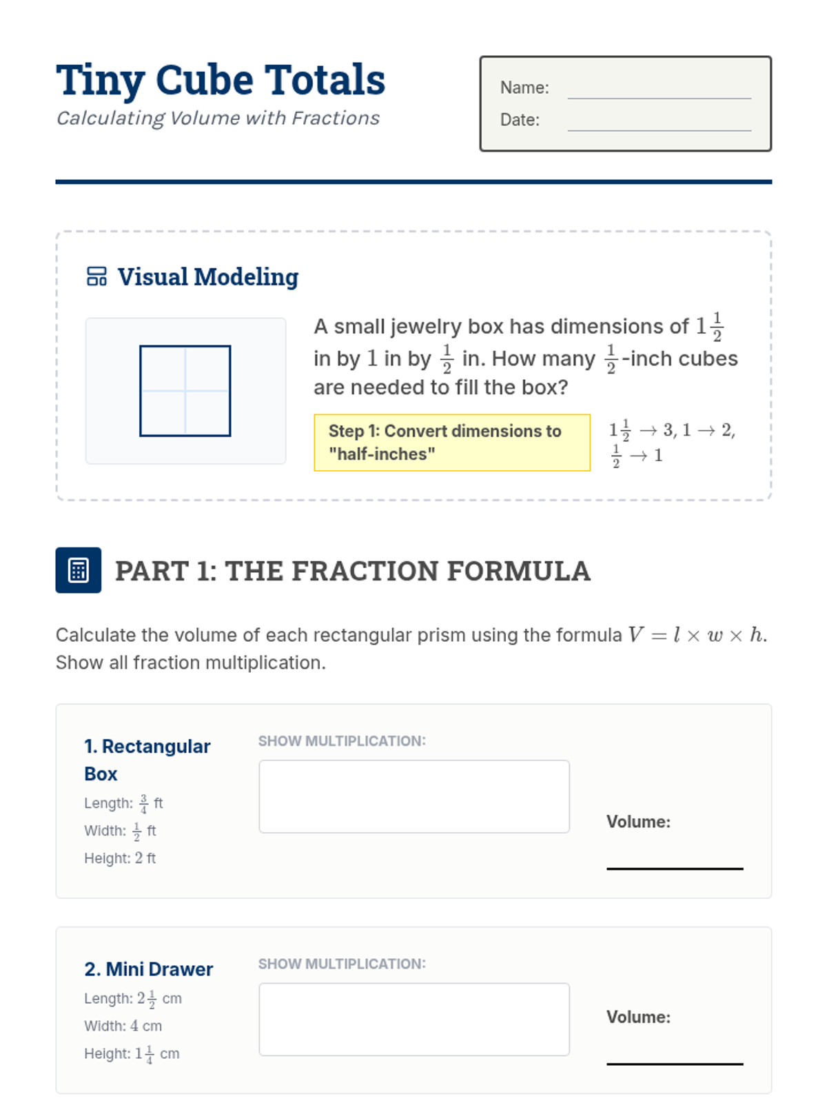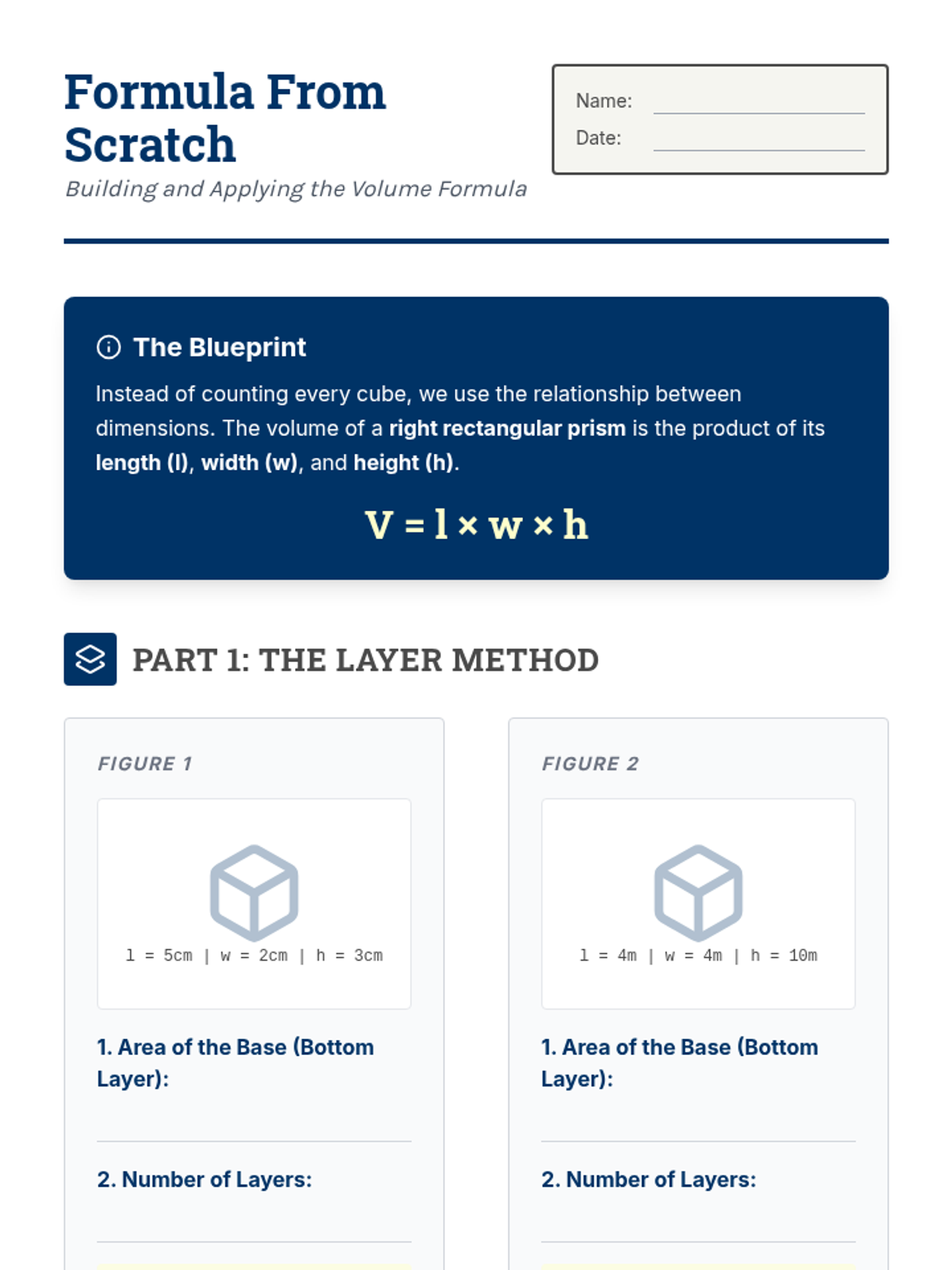 This sequence introduces 7th-grade students to the concept of volume through the lens of rectangular prisms. Starting with concrete unit cube packing and moving toward abstract formulas including fractional edge lengths and the 'Base Area' method, students build a deep conceptual understanding of 3D space measurement.