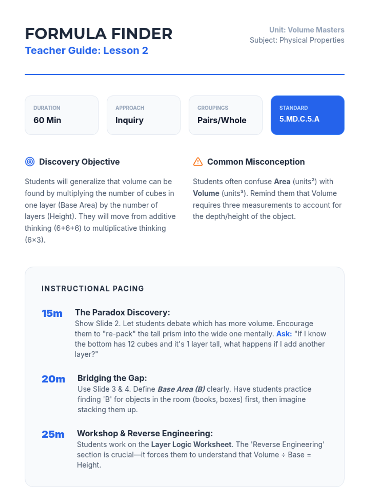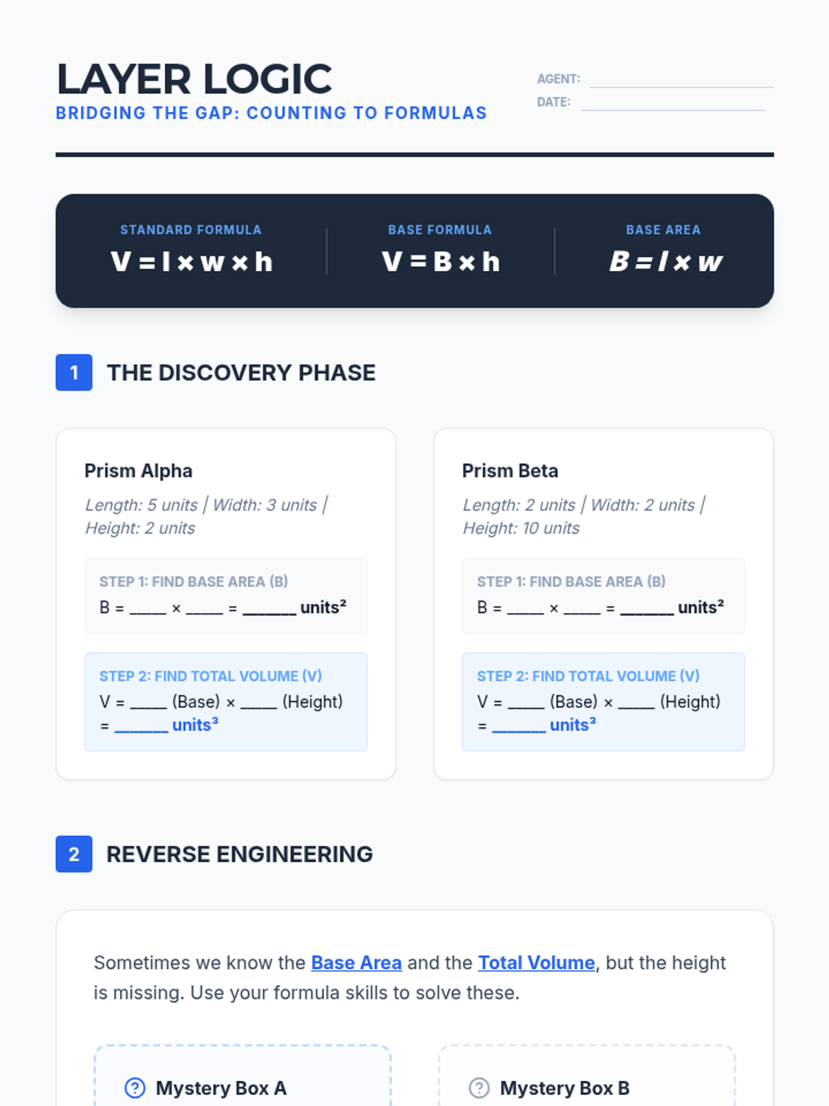This sequence connects geometry to physical space by exploring volume and the attributes of solid figures. Students progress from packing unit cubes to deriving and applying the standard volume formulas (V = l x w x h and V = B x h) to real-world engineering challenges.