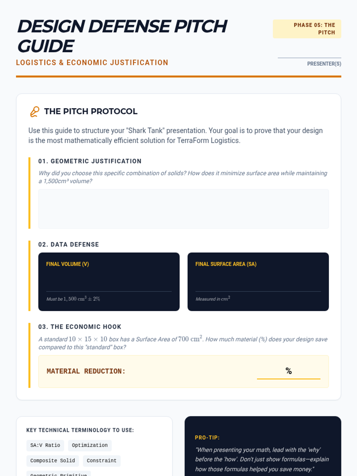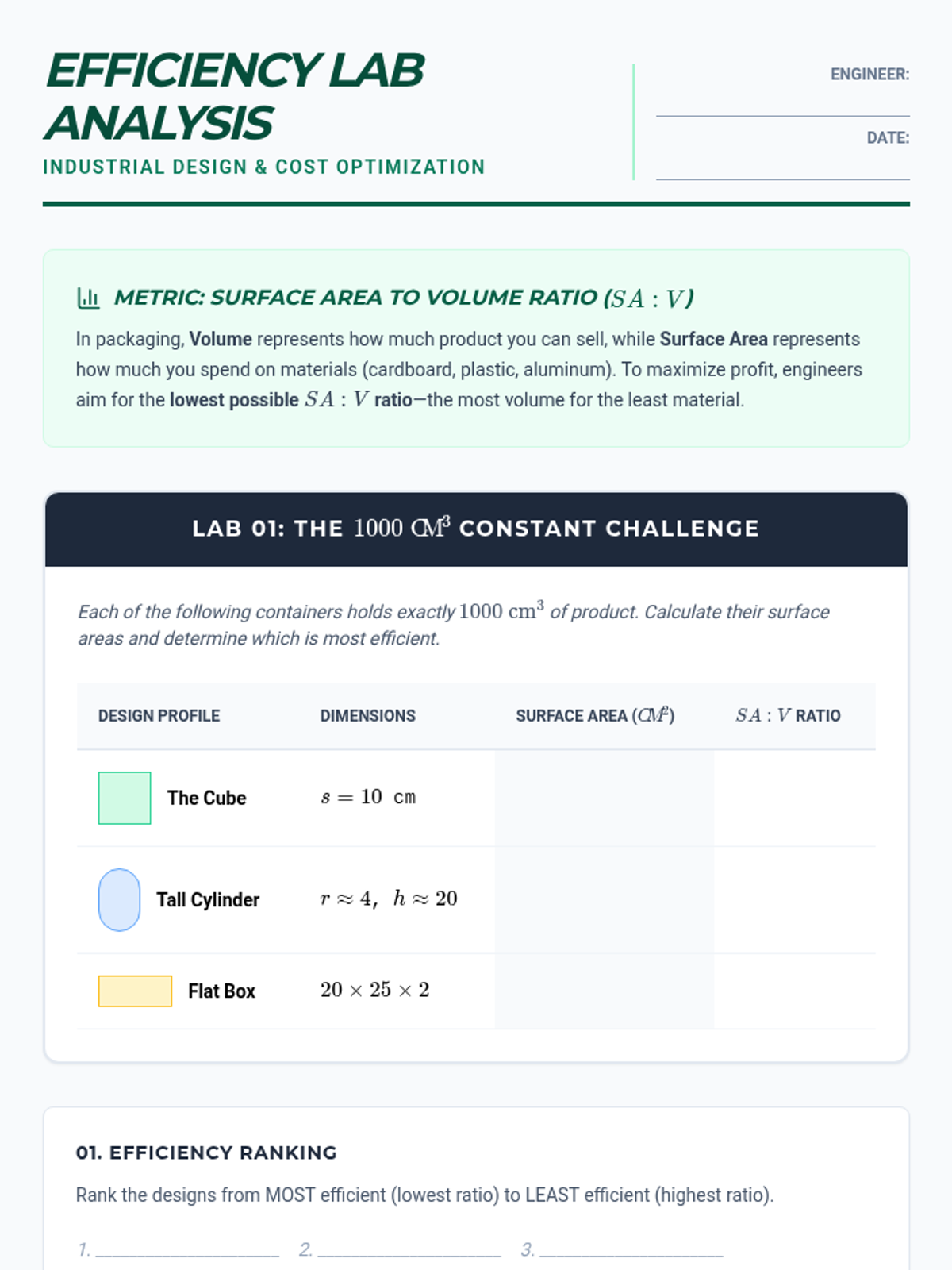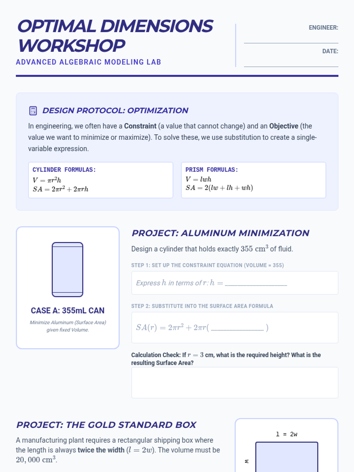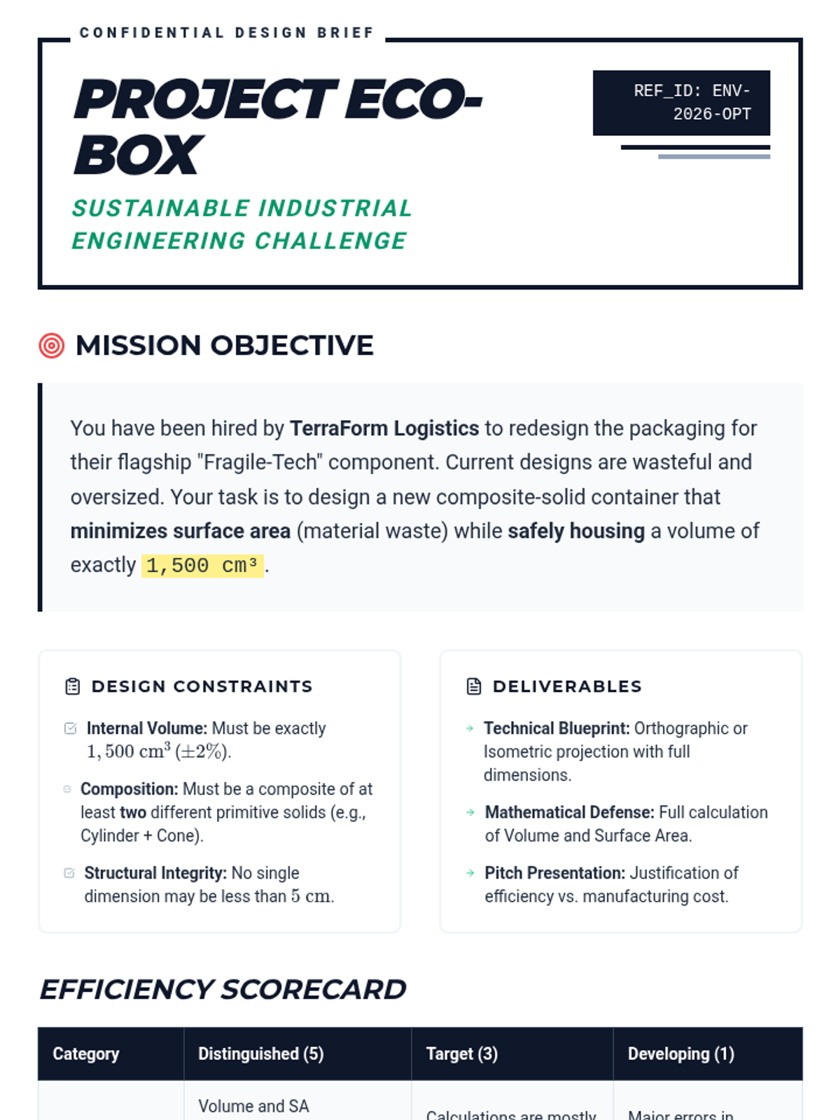 Students act as industrial engineers to optimize packaging by exploring the relationship between surface area and volume. They master composite solids, algebraic modeling of geometric constraints, and sustainable design principles through a project-based approach.