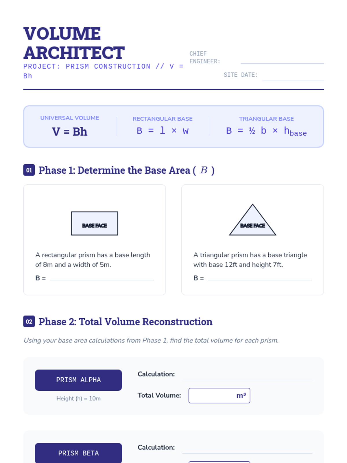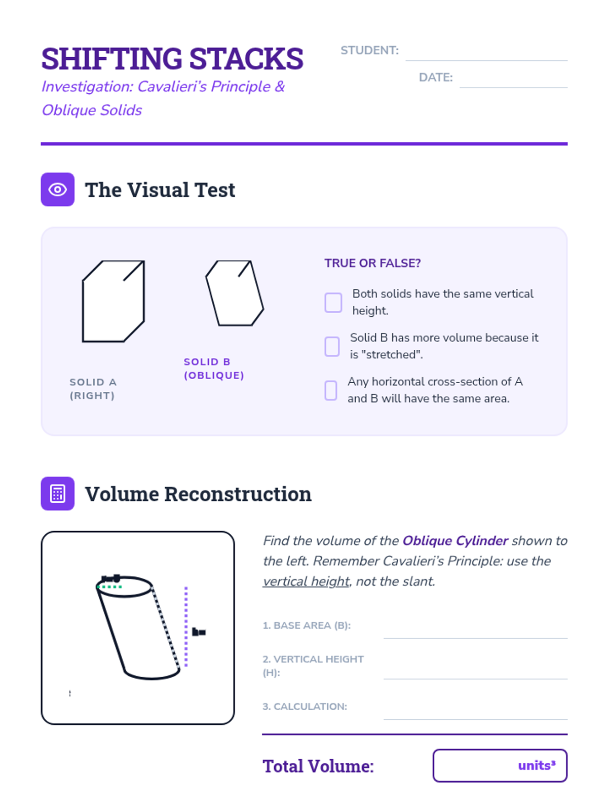 This geometry sequence explores the transition from 2D area to 3D volume, focusing on prisms and cylinders. Students investigate spatial visualization through nets, derive volume formulas by conceptualizing 'stacked' bases, apply Cavalieri's Principle to oblique solids, and solve real-world density problems.
