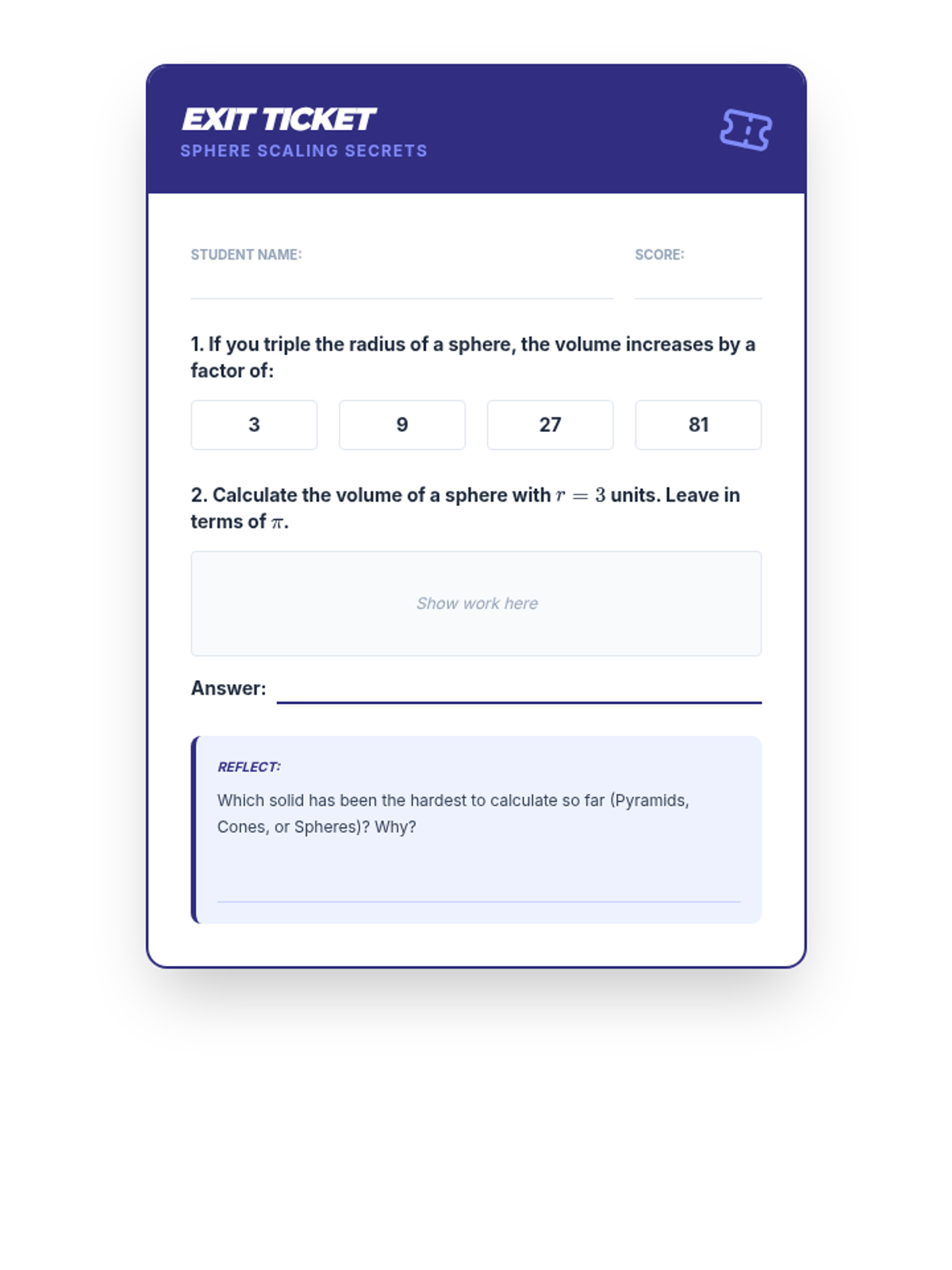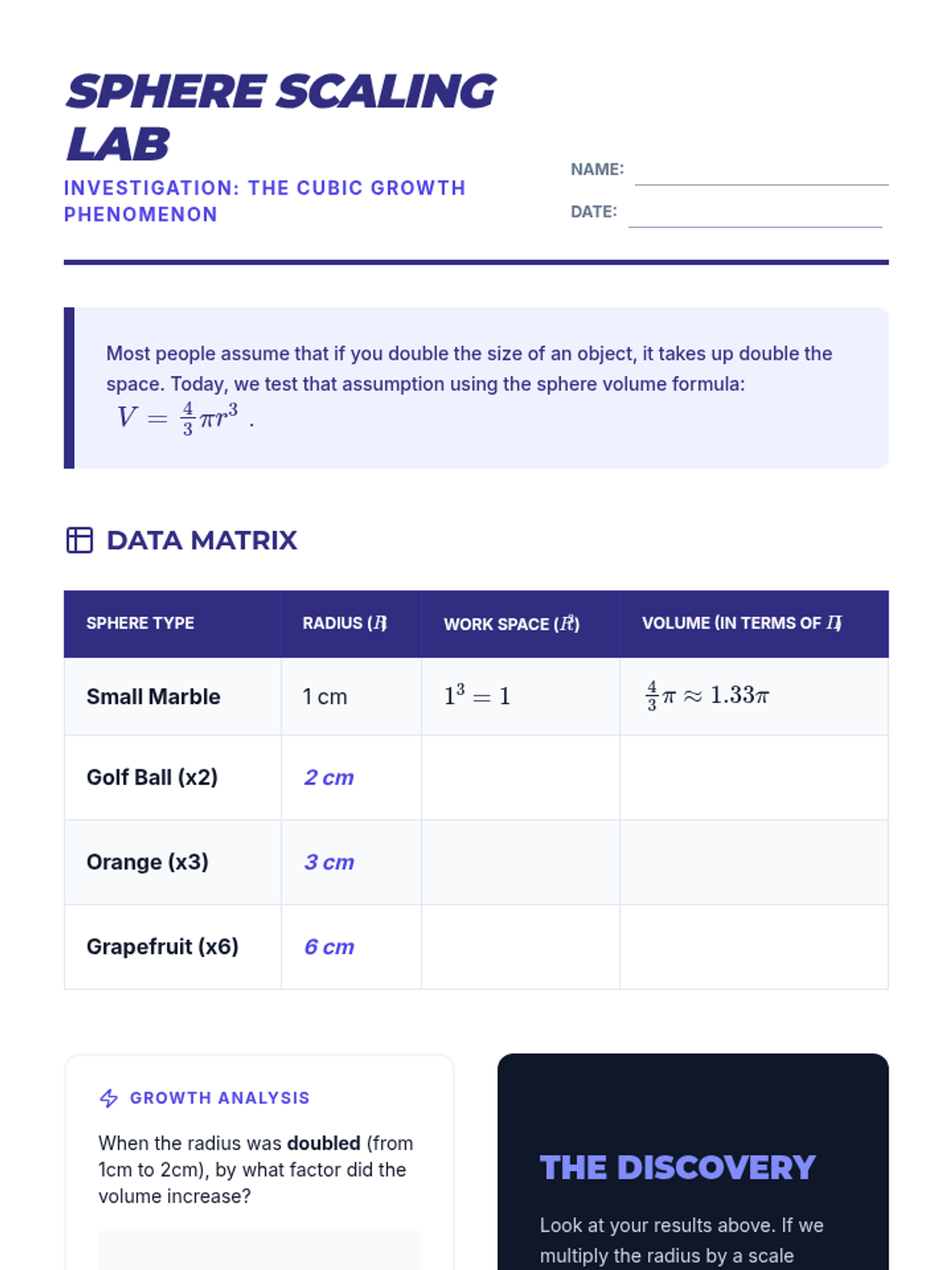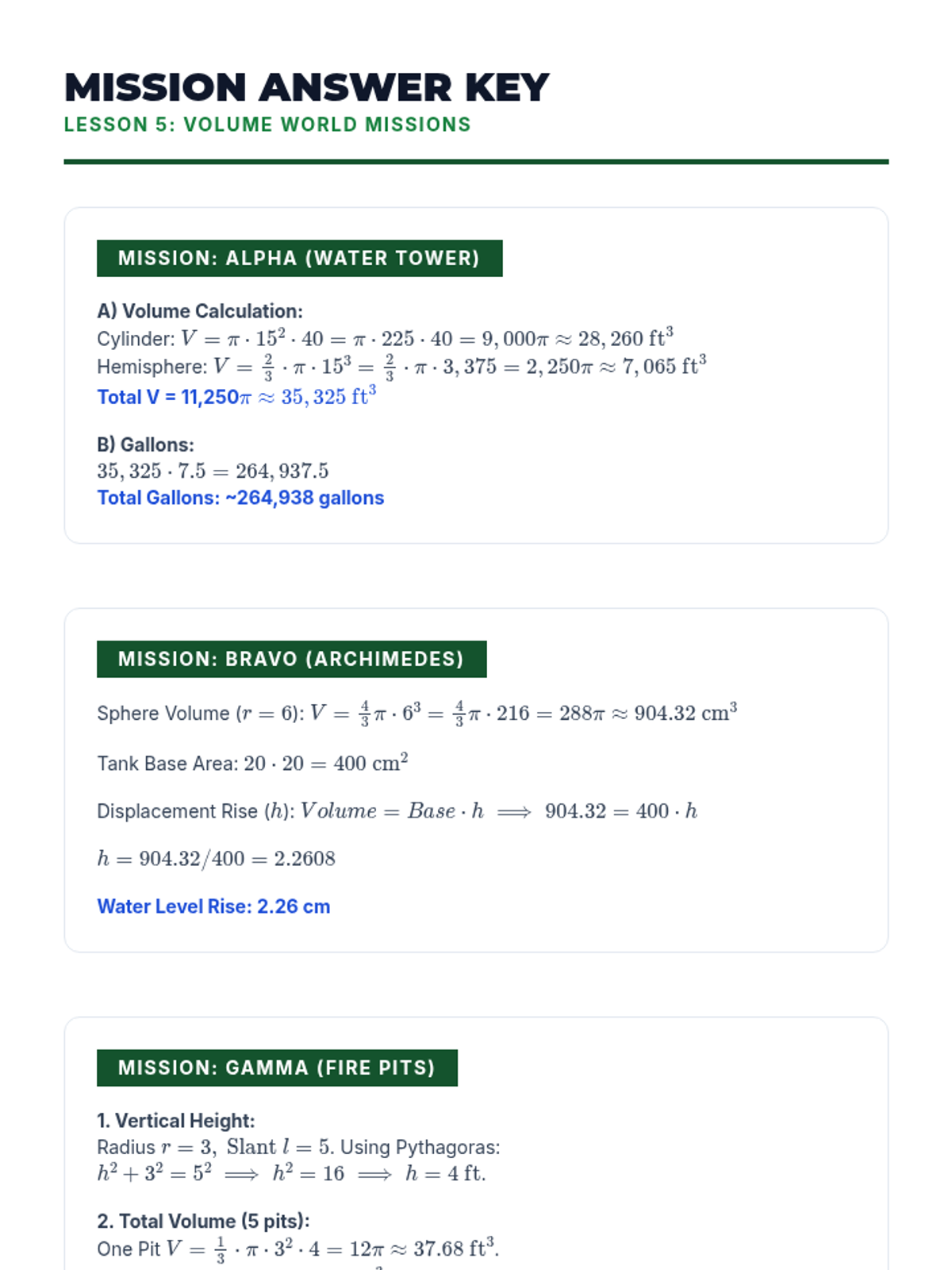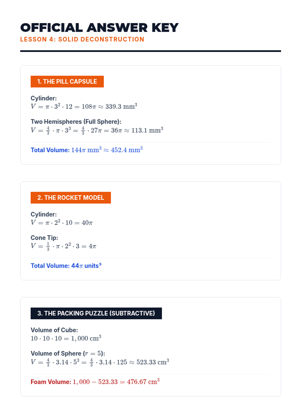 A comprehensive geometry sequence for 9th grade students exploring the volume of pyramids, cones, and spheres. Students use inquiry, experimentation, and mathematical modeling to understand fractional relationships and solve complex real-world problems involving composite solids.