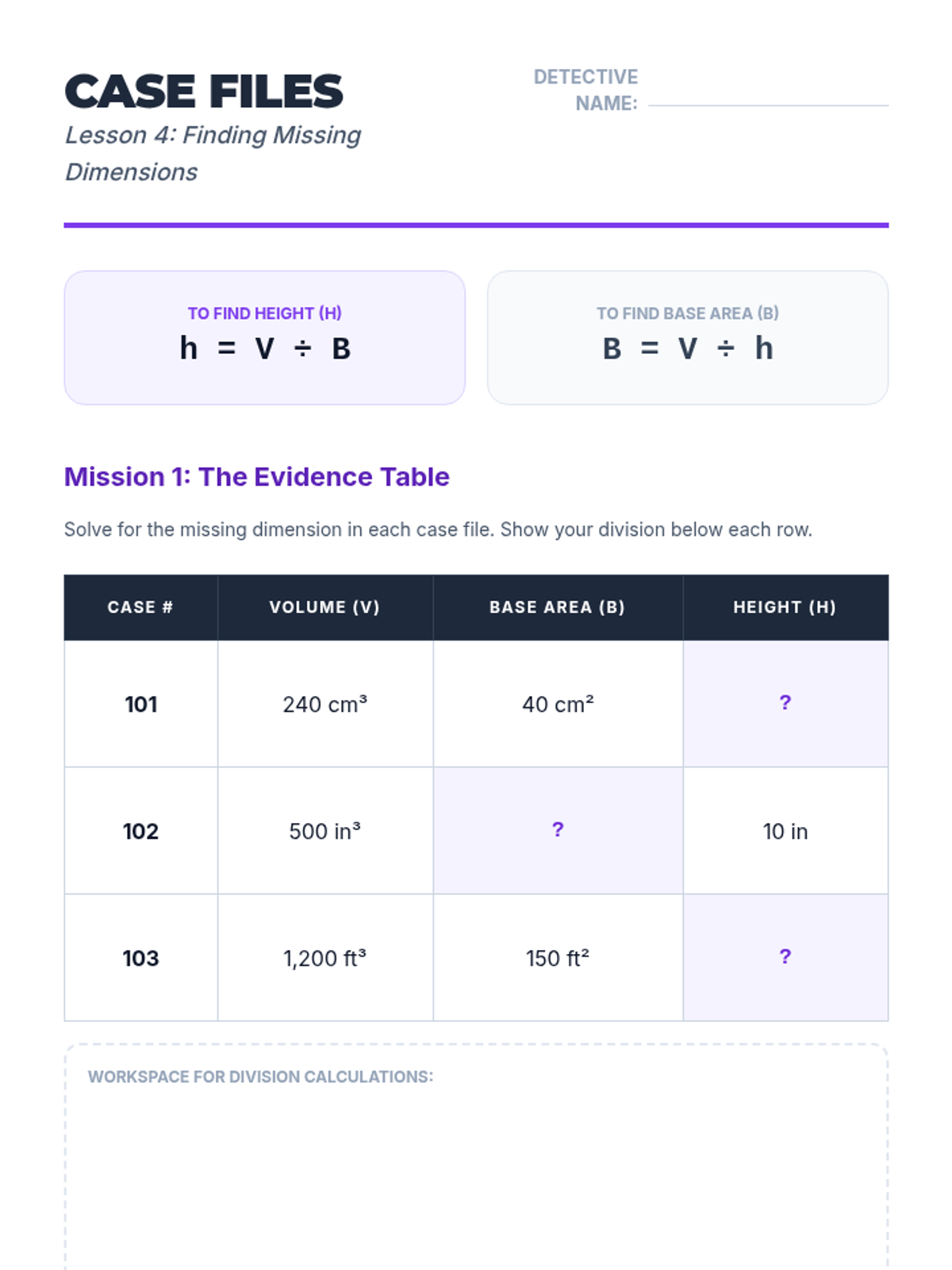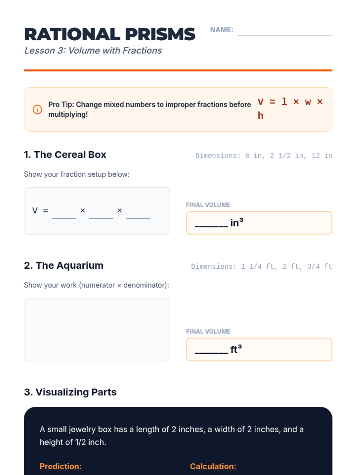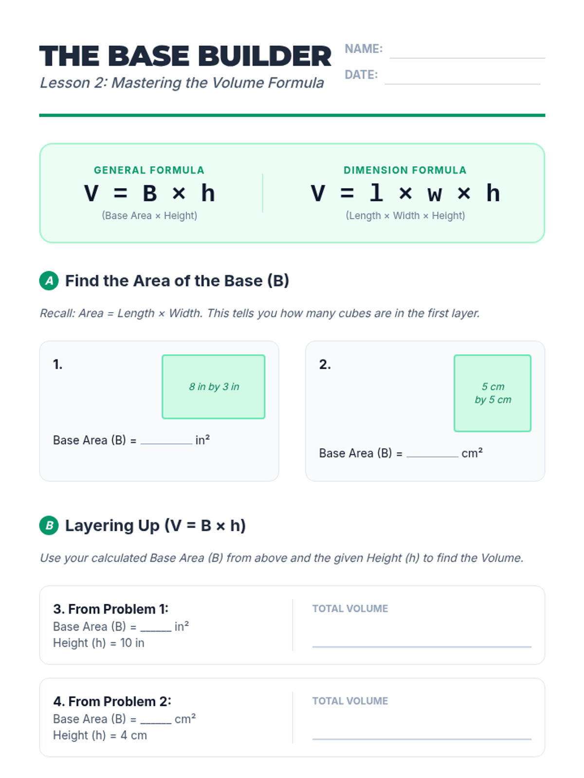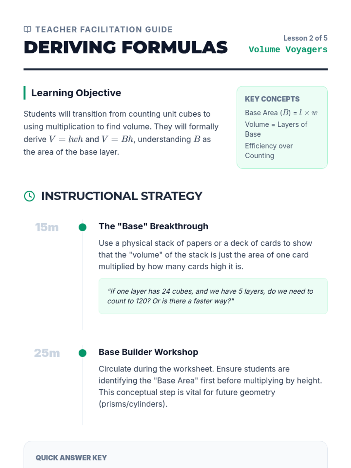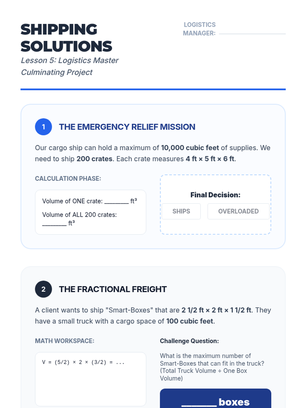 This sequence guides 6th-grade students from conceptualizing volume as counting unit cubes to deriving and applying volume formulas (V=lwh and V=Bh) with whole and fractional edge lengths. Students explore volume through inquiry, formalize their understanding, and solve real-world logistics challenges.