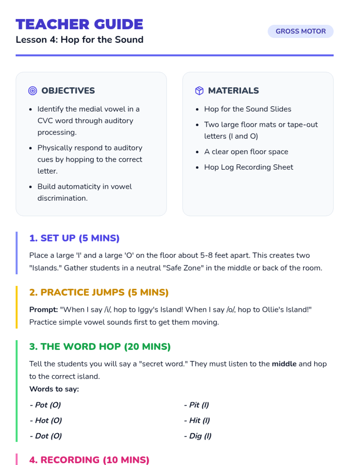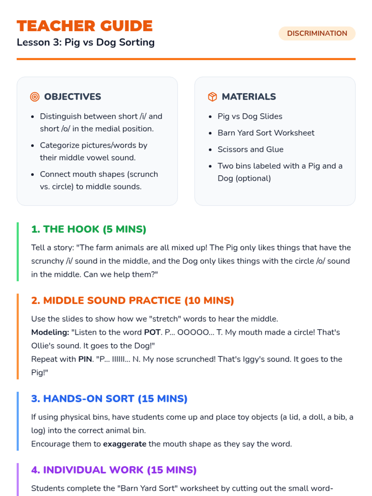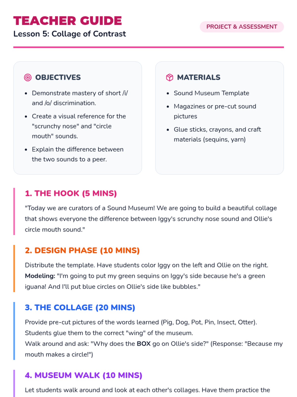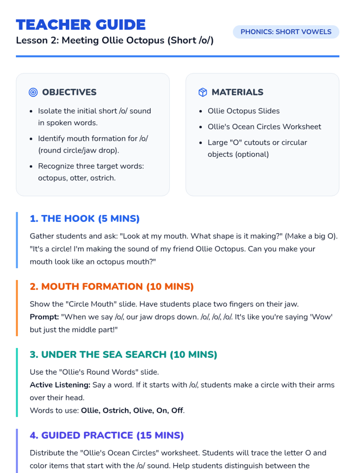 This phonics sequence for Pre-K students focuses on discriminating between the short 'i' and short 'o' sounds through multi-sensory and game-based activities. It uses animal mascots (Iggy Iguana and Ollie Octopus) and mouth formation cues to help students distinguish these frequently confused vowel sounds.