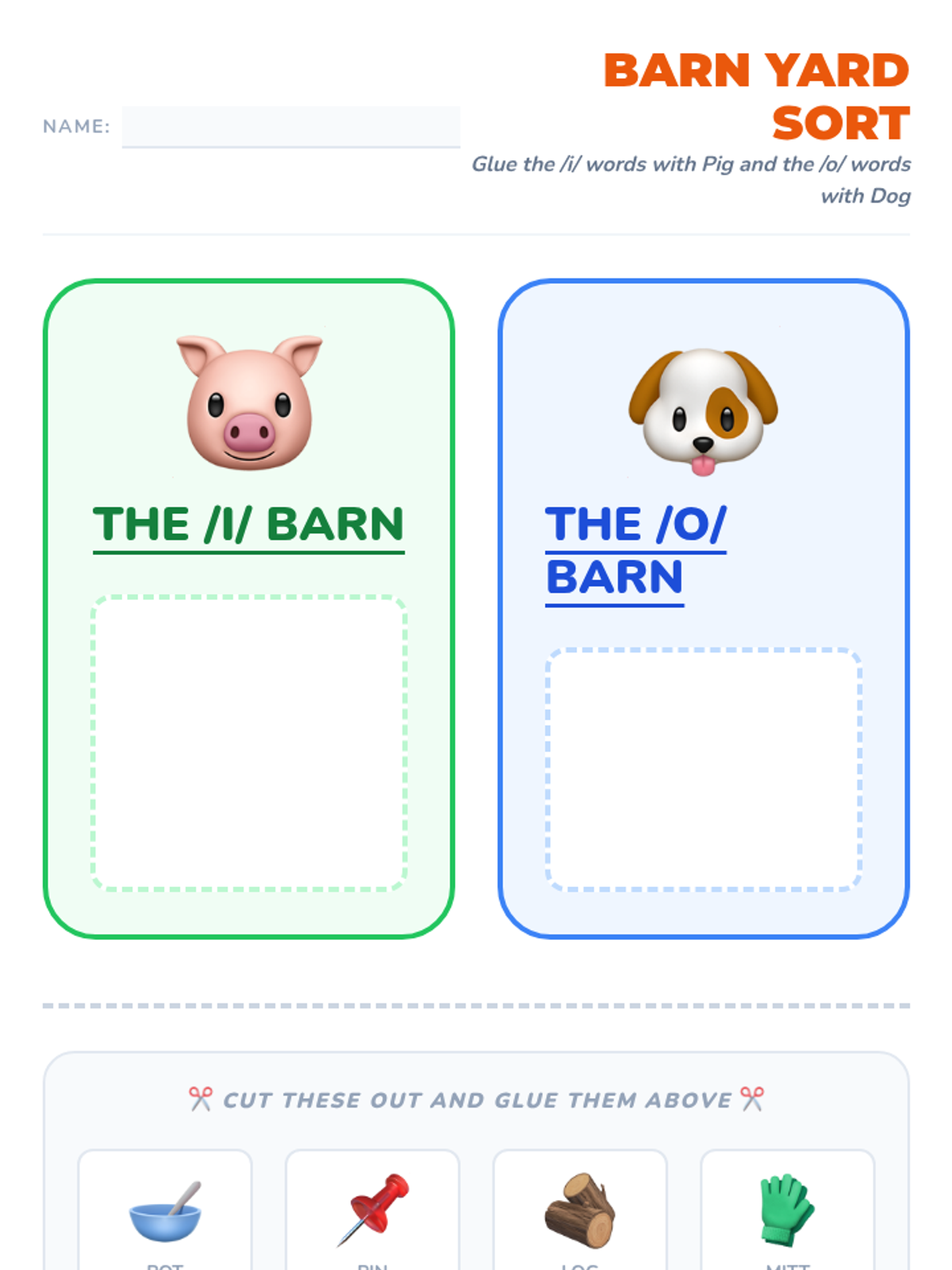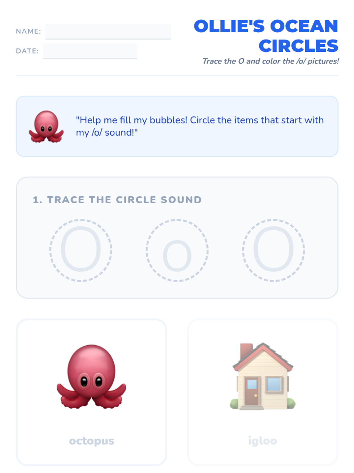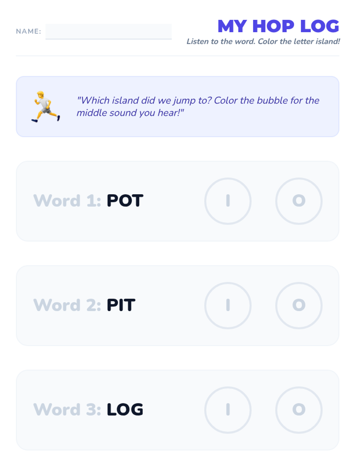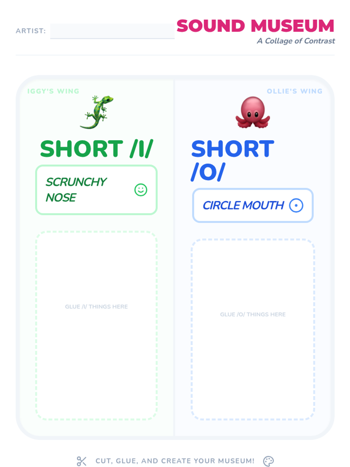 This phonics sequence for Pre-K students focuses on discriminating between the short 'i' and short 'o' sounds through multi-sensory and game-based activities. It uses animal mascots (Iggy Iguana and Ollie Octopus) and mouth formation cues to help students distinguish these frequently confused vowel sounds.