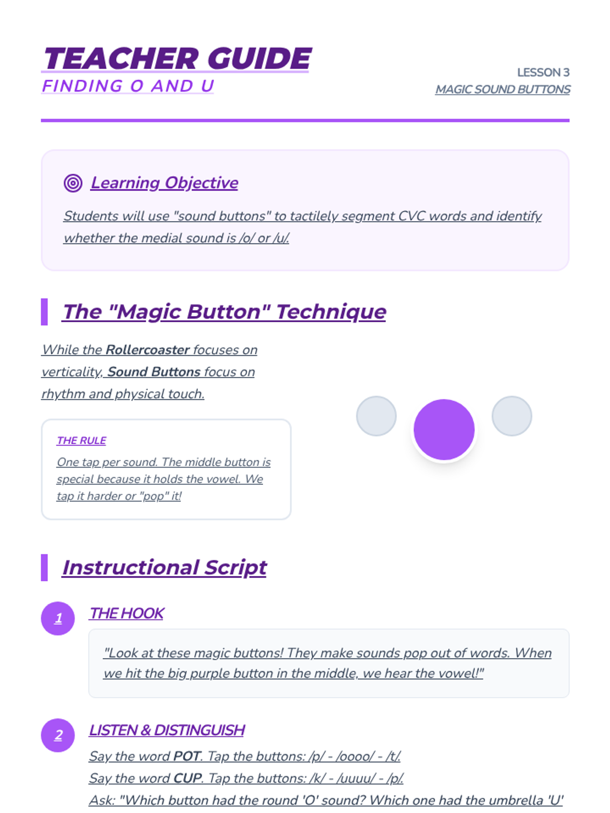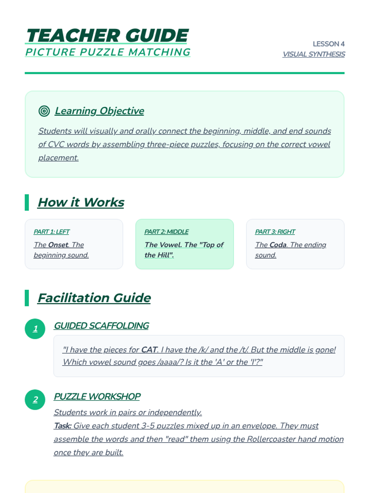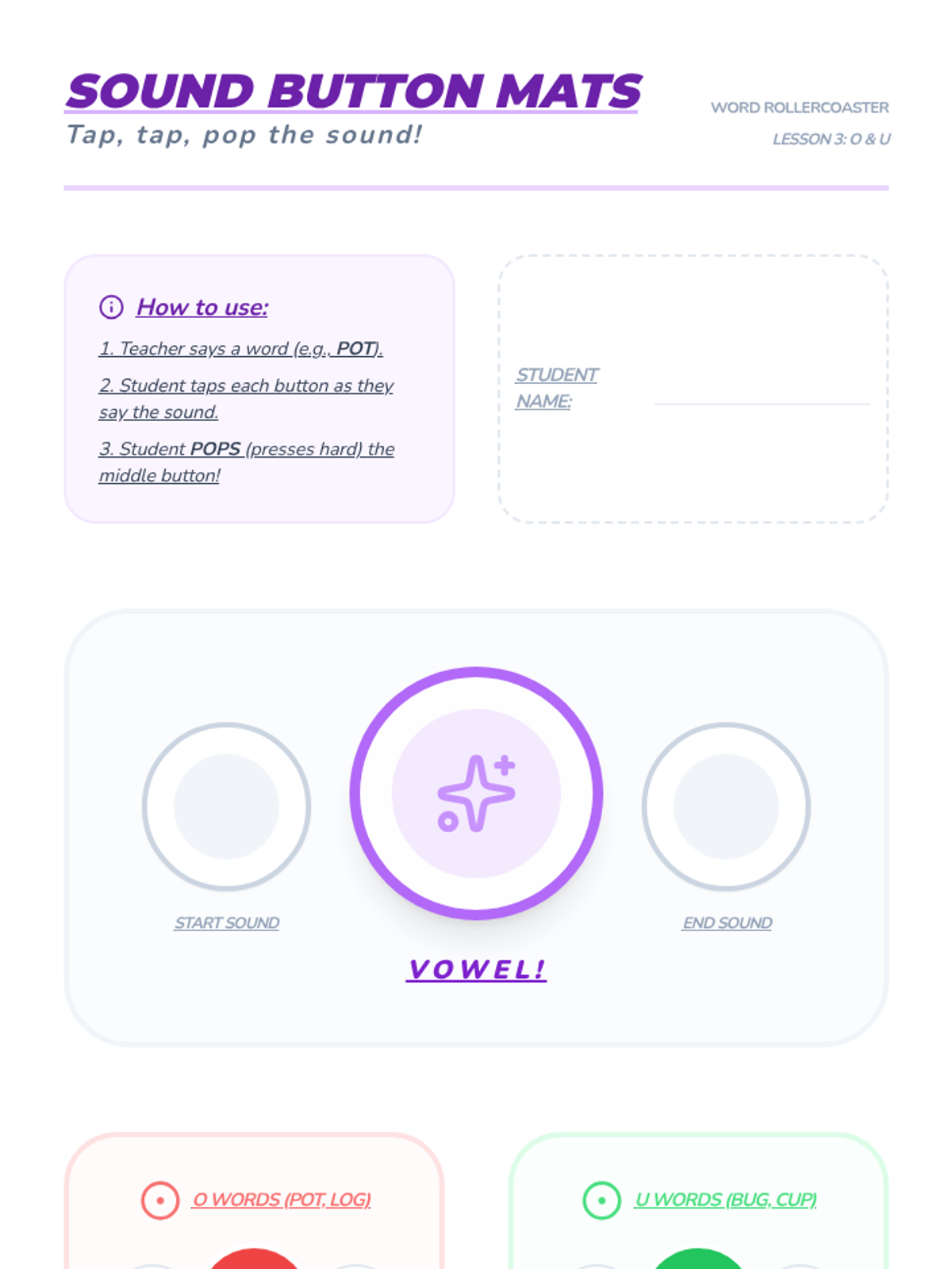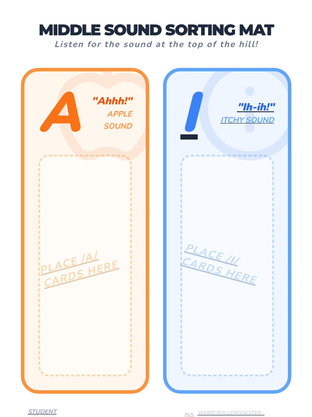 This sequence introduces Pre-K students to identifying medial vowel sounds in CVC words using the kinesthetic 'rollercoaster' strategy. Students progress from learning the basic hand motion to discriminating between different vowel sounds (a/i, o/u) and finally blending sounds to form whole words.