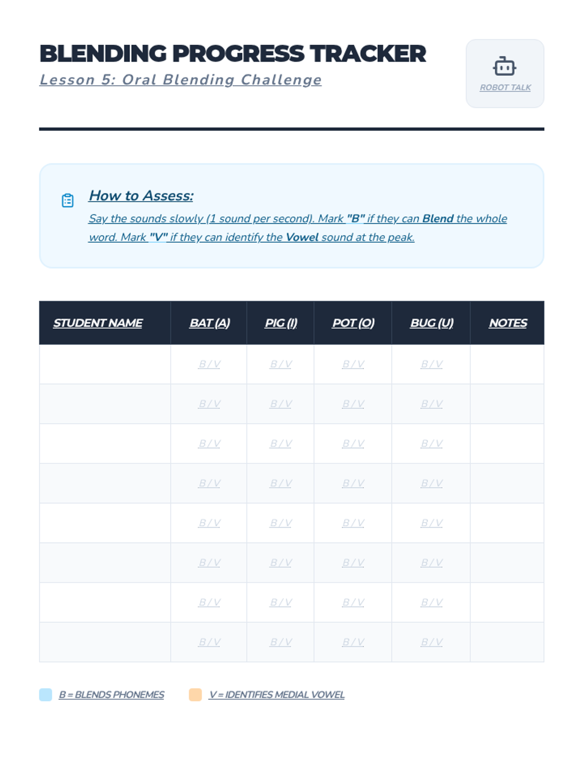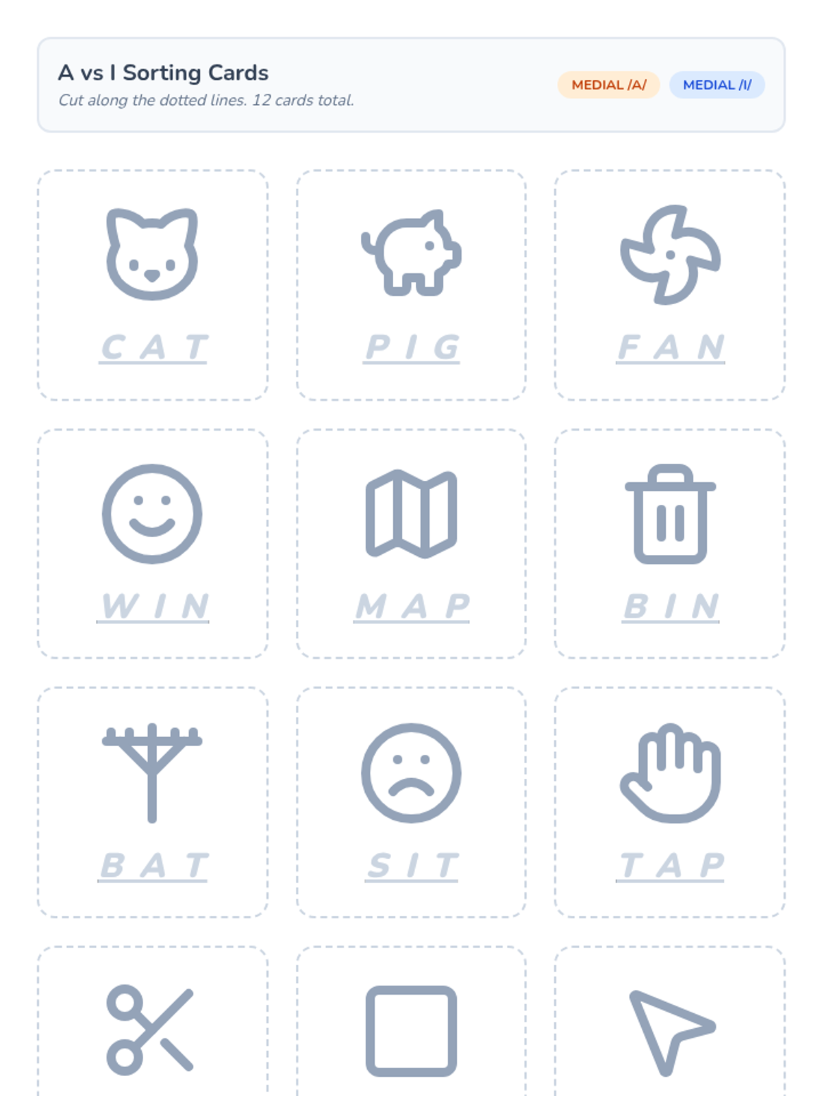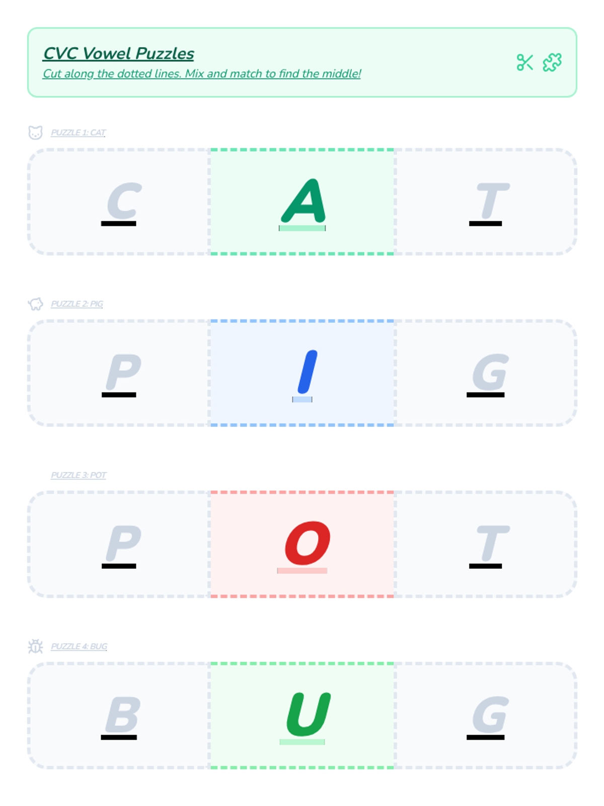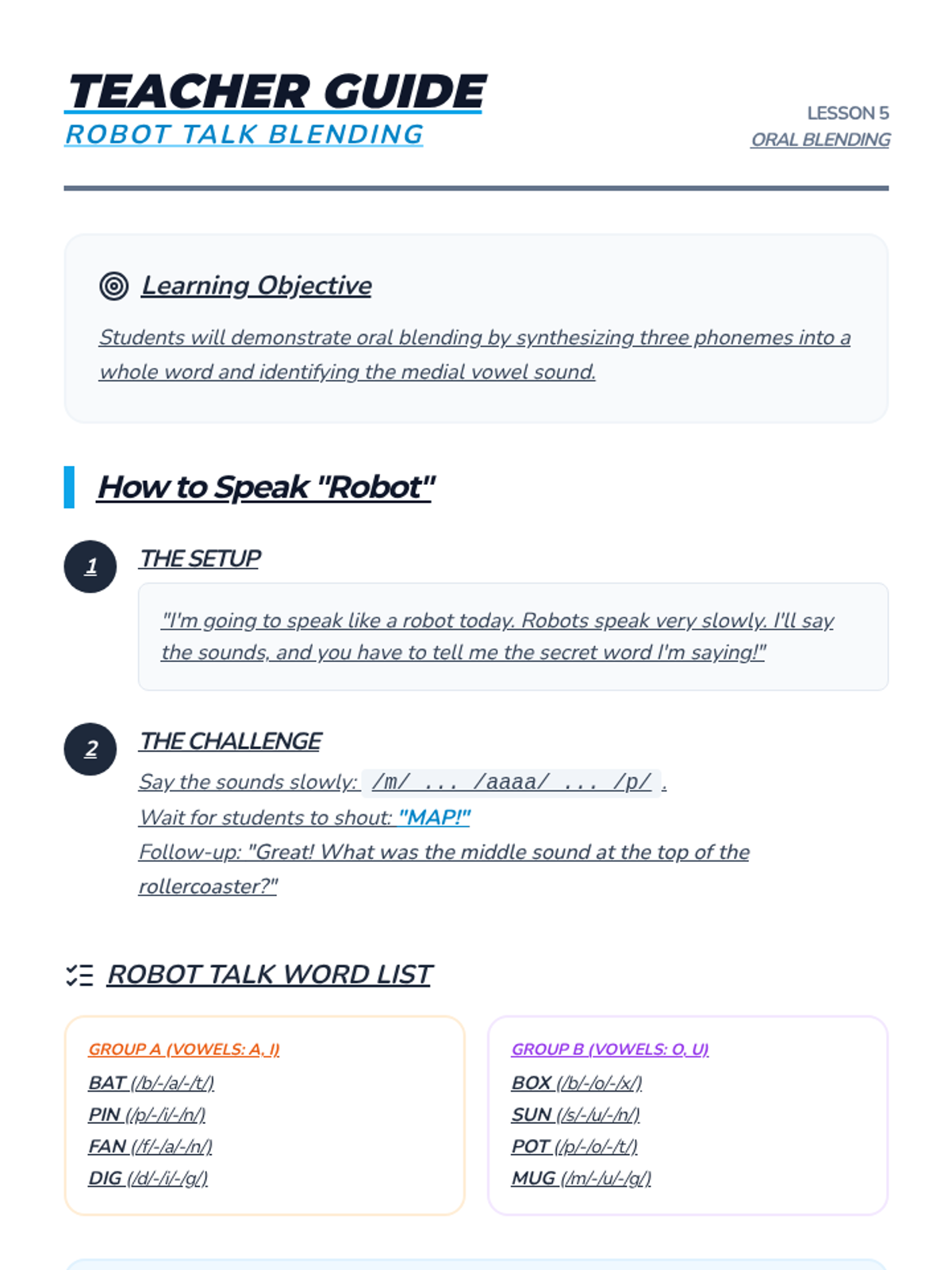 This sequence introduces Pre-K students to identifying medial vowel sounds in CVC words using the kinesthetic 'rollercoaster' strategy. Students progress from learning the basic hand motion to discriminating between different vowel sounds (a/i, o/u) and finally blending sounds to form whole words.