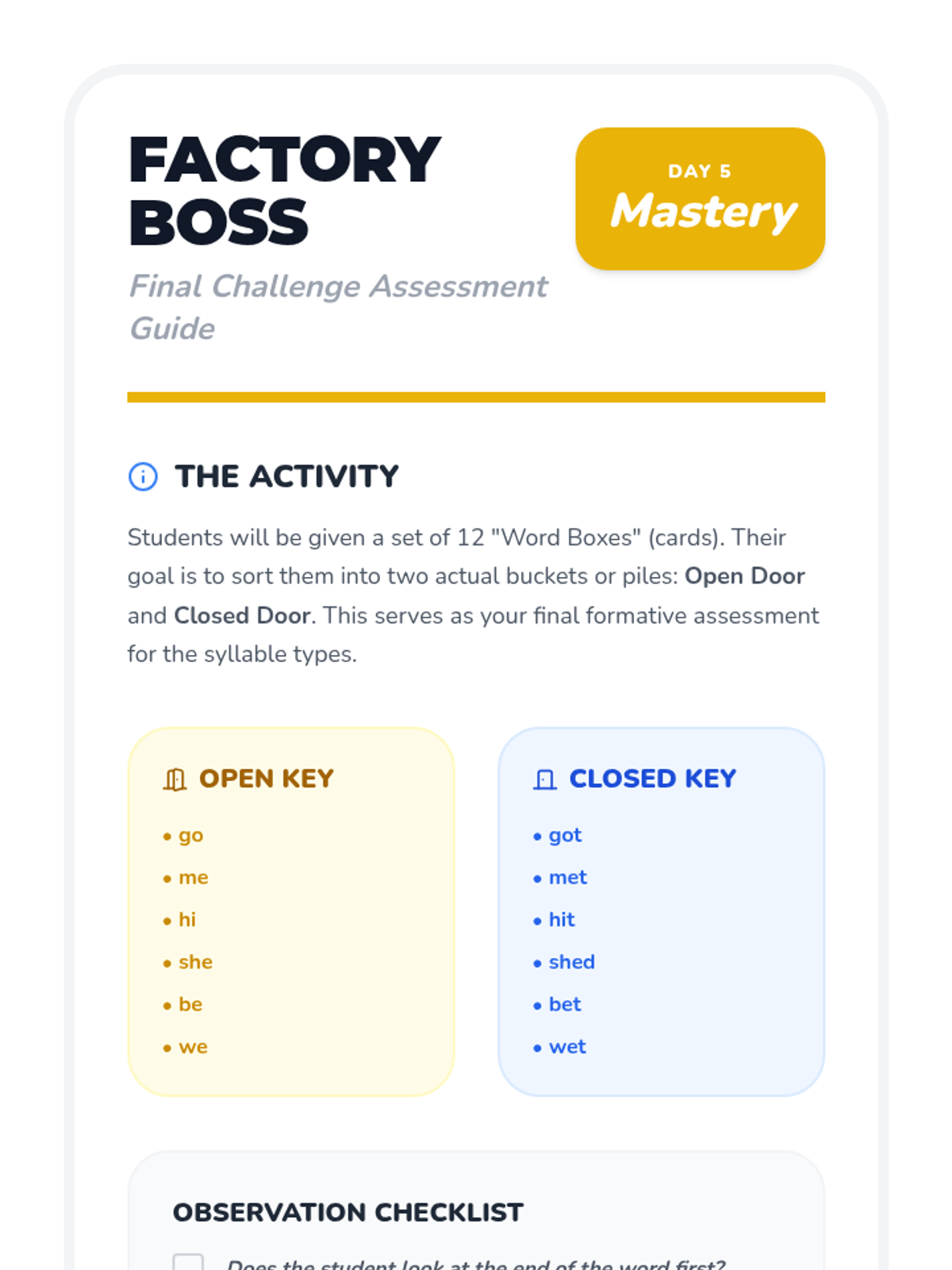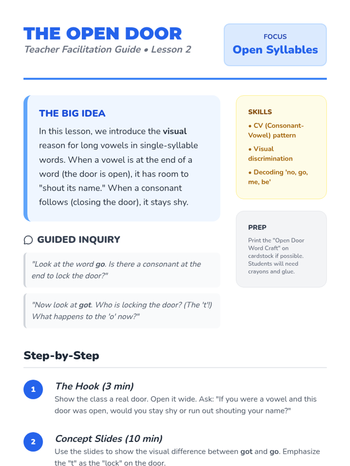 A Kindergarten phonics sequence focusing on the difference between open and closed syllables. Students learn the 'Open Door' metaphor to understand why vowels sometimes shout their own names (long sounds) versus making their short sounds.