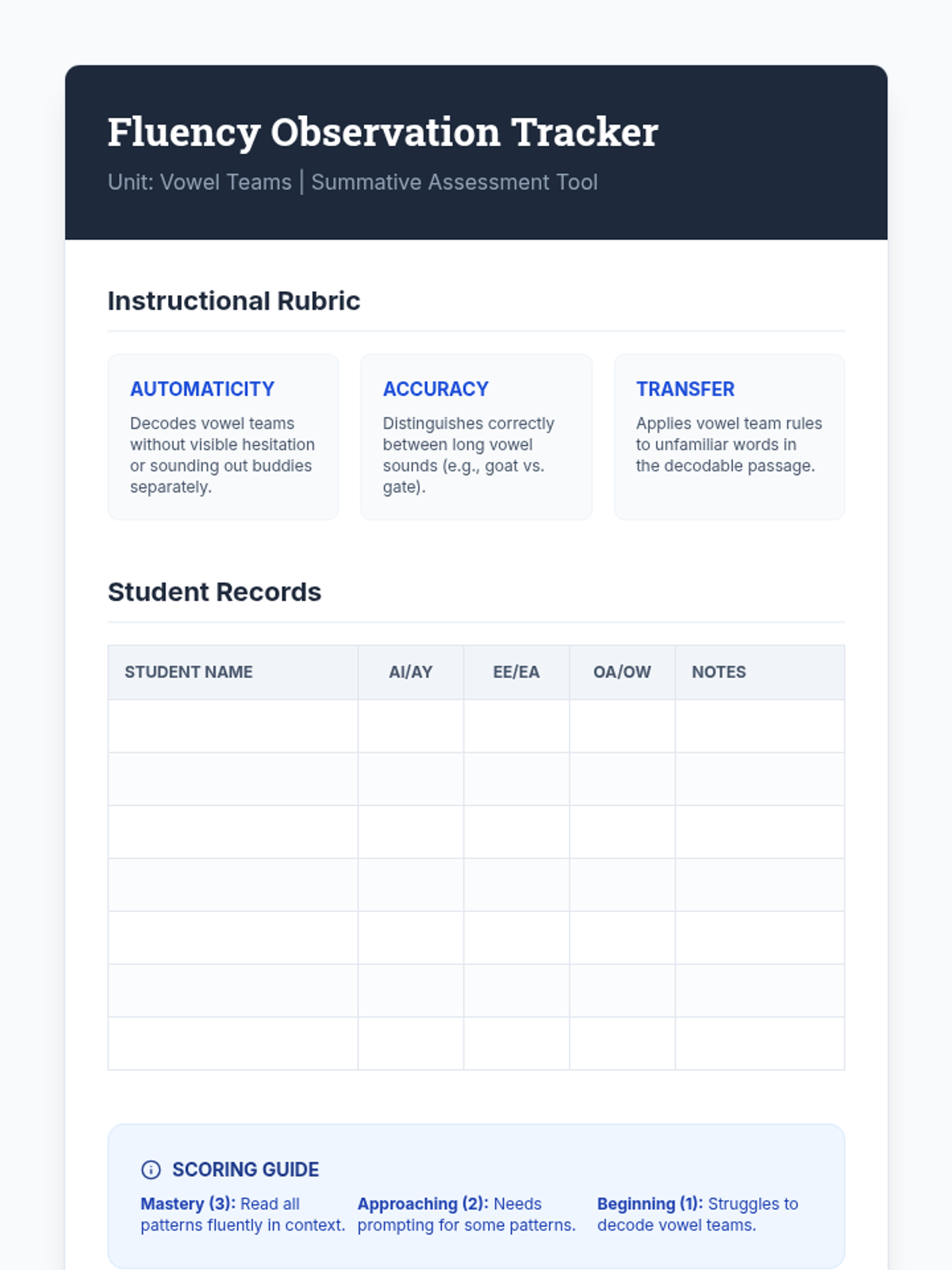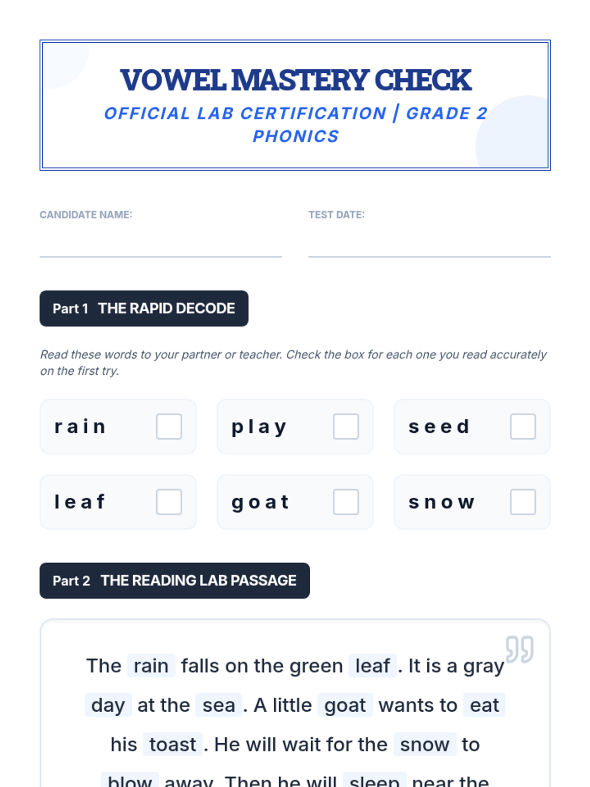 A comprehensive 2nd-grade phonics unit focusing on common long vowel teams (ai, ay, ee, ea, oa, ow). Students transition from simple CVC words to decoding more complex vowel combinations through inquiry-based lab experiments and detective-themed activities.