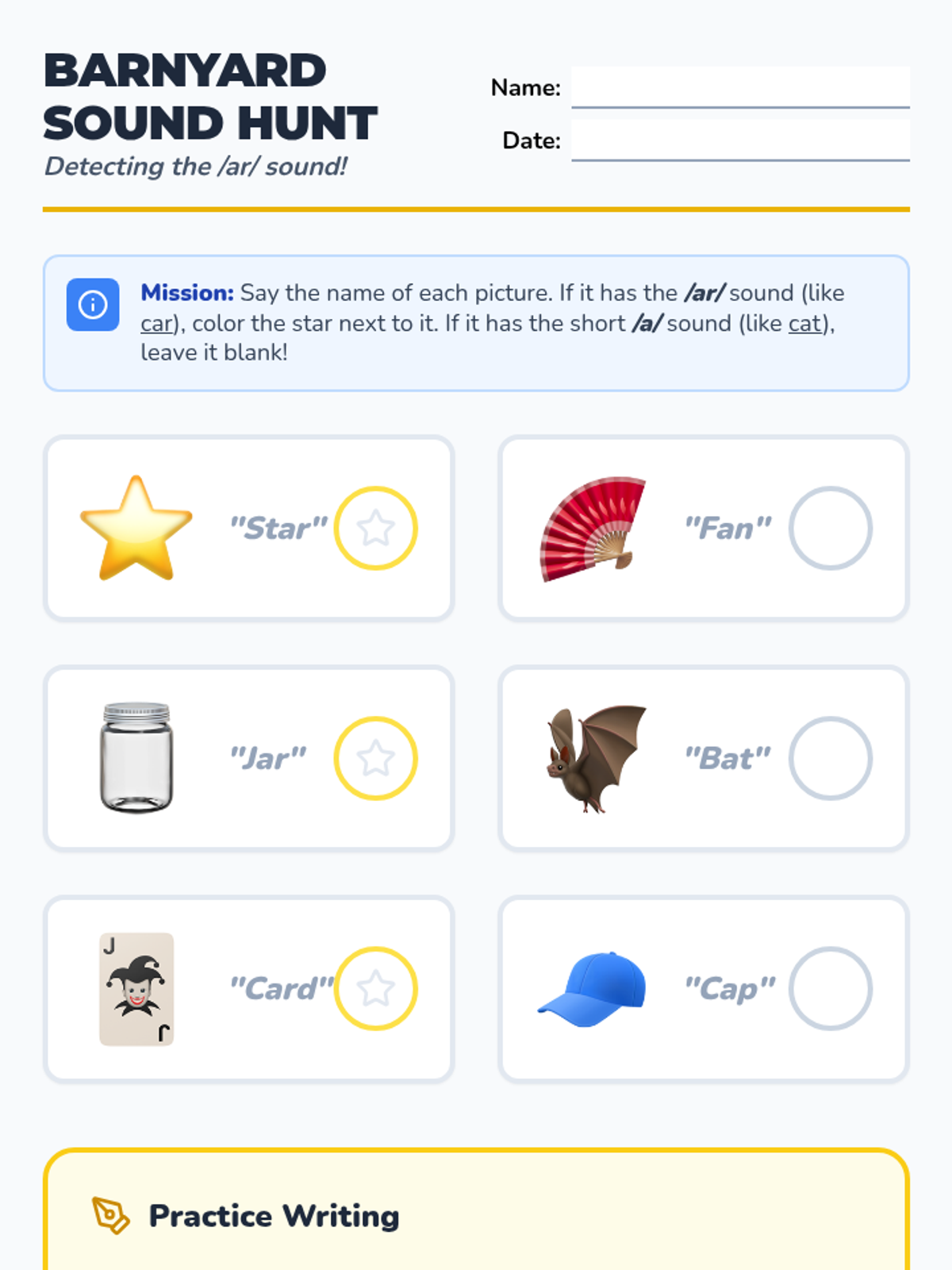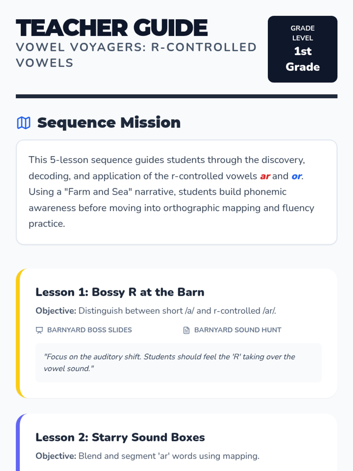 This sequence introduces 1st Grade students to r-controlled vowels 'ar' and 'or'. Through a 'Farm and Sea' theme, students explore how the letter 'r' changes vowel sounds, moving from phonemic awareness to decoding and reading fluency.