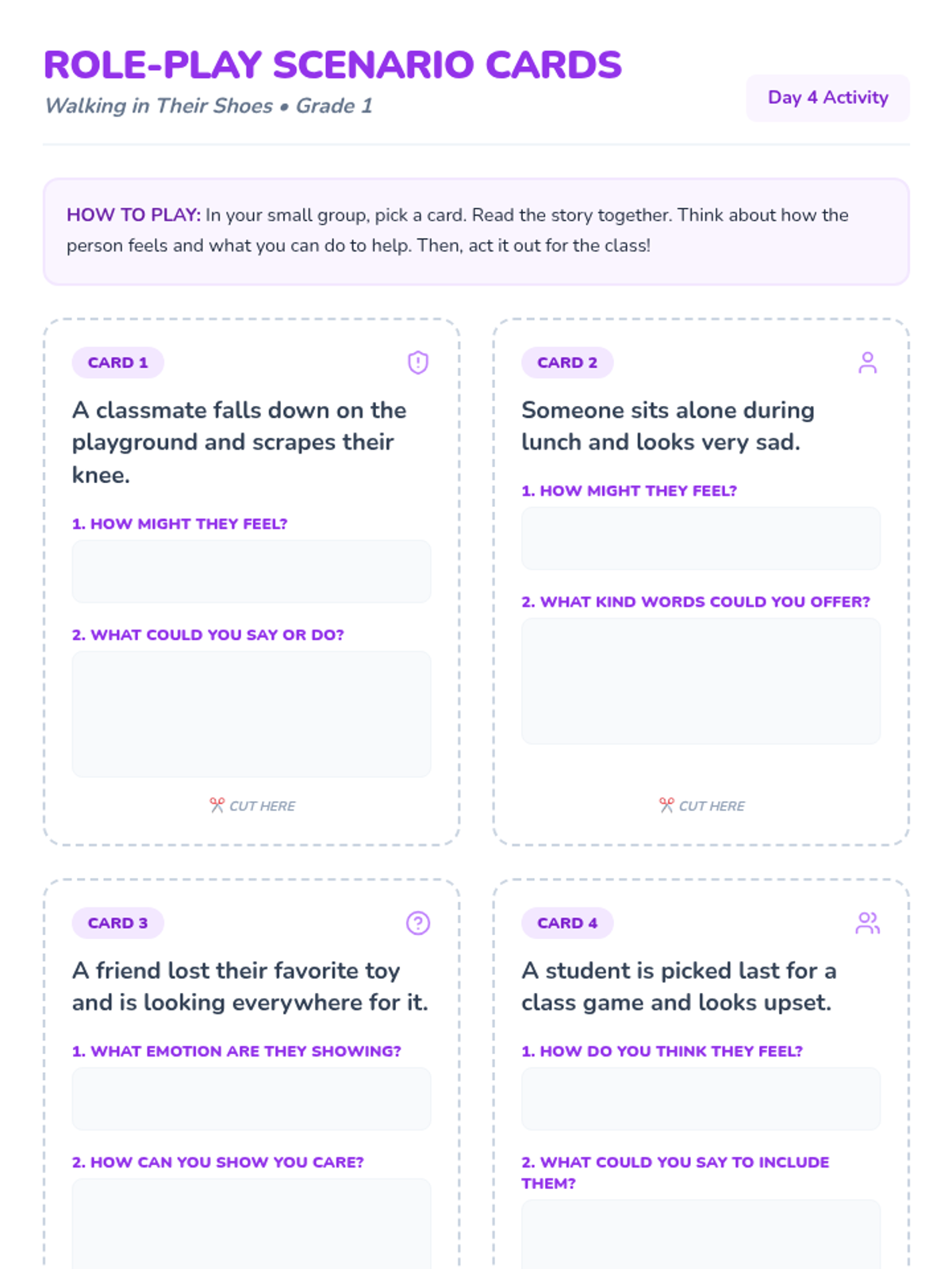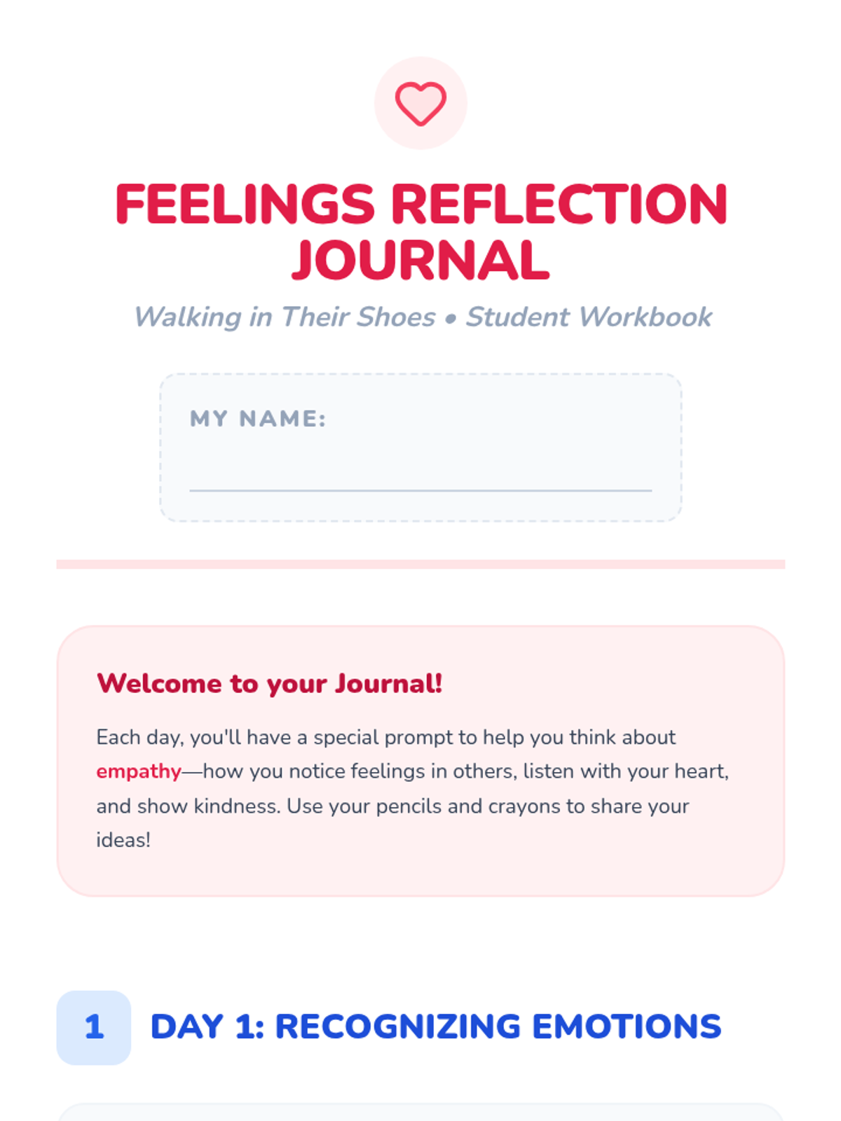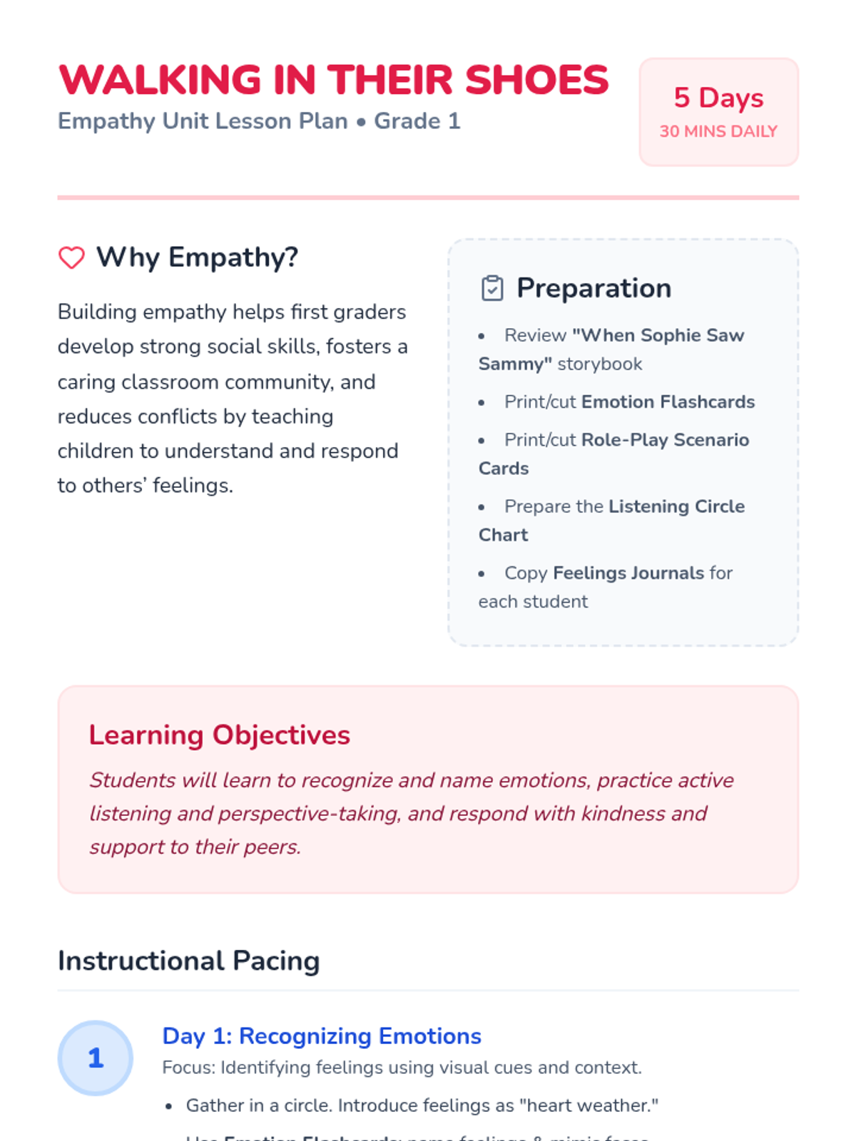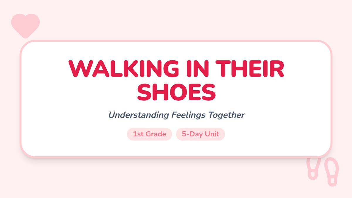 A 5-day empathy unit for 1st graders designed to build skills in recognizing, understanding, and responding to others' feelings through stories, active listening, and role-play.
