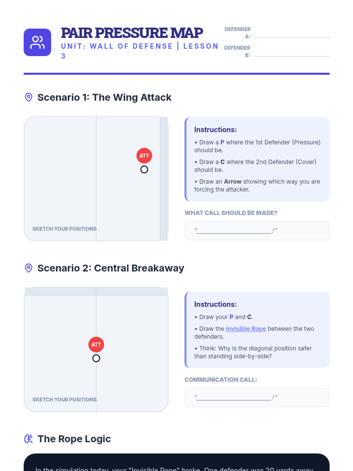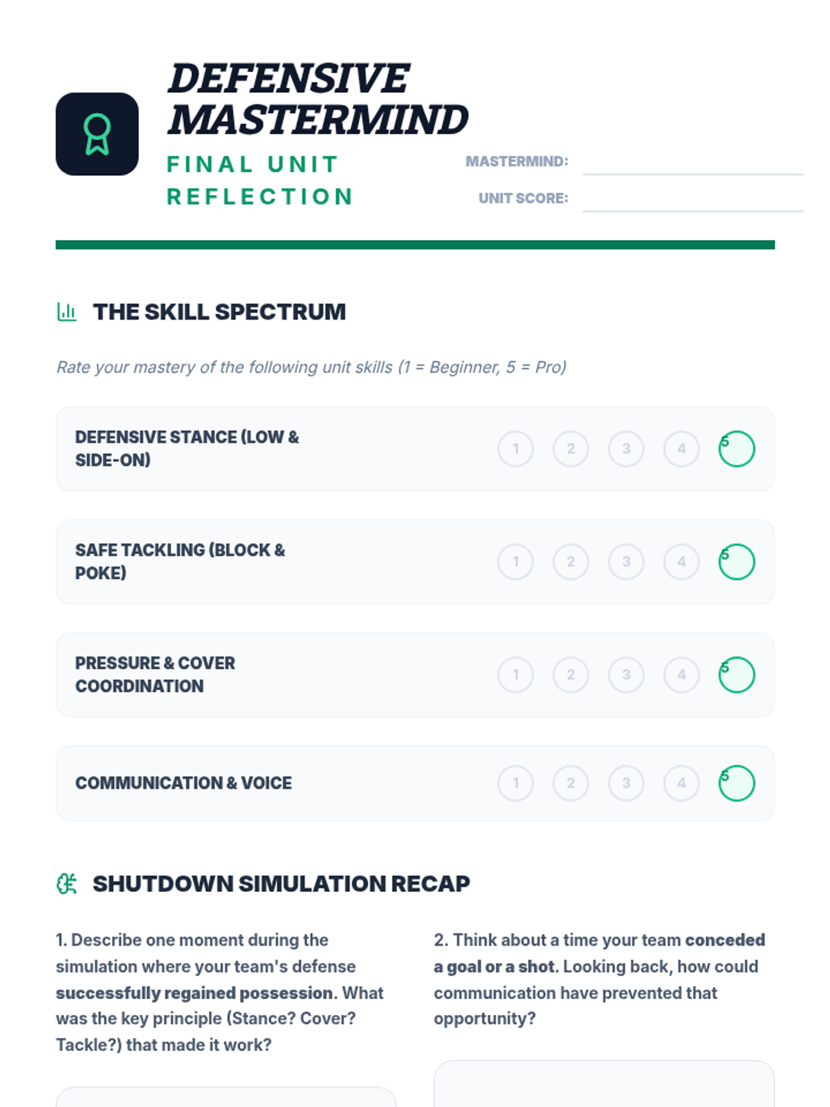 A comprehensive 6th-grade Physical Education unit focusing on defensive football (soccer) skills. Students progress from individual body mechanics to complex team coordination and set-piece organization.