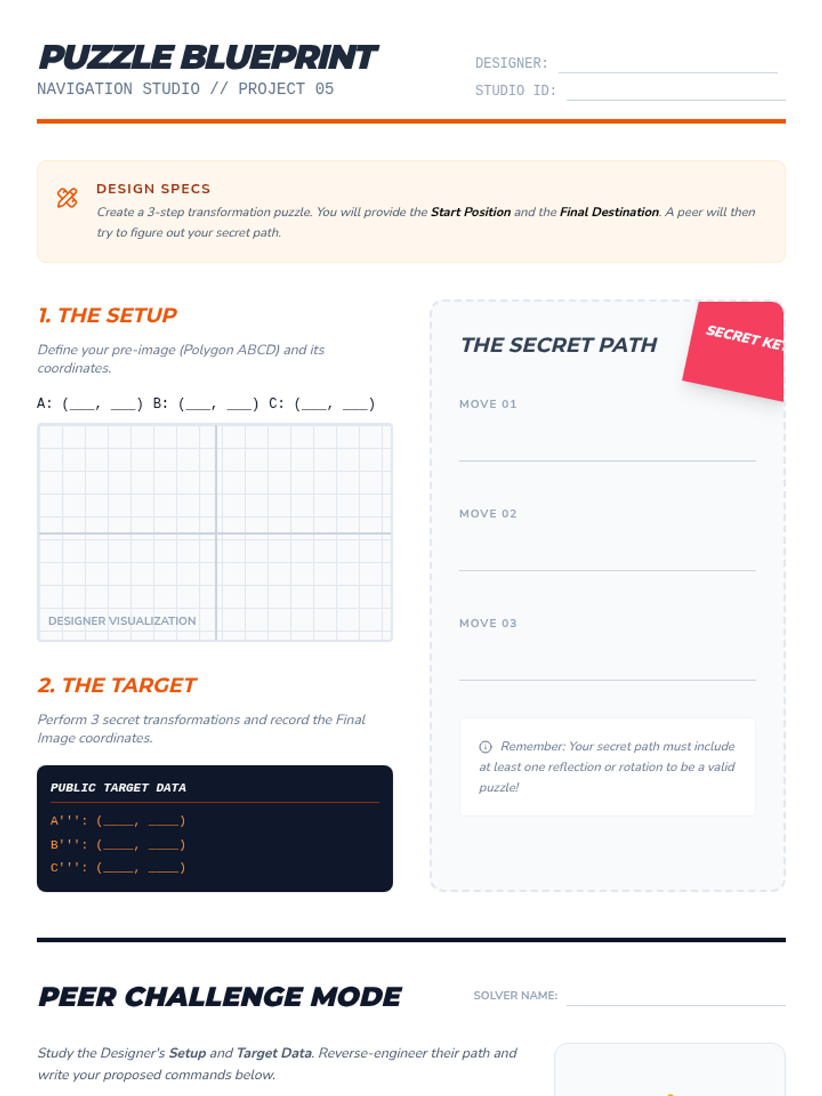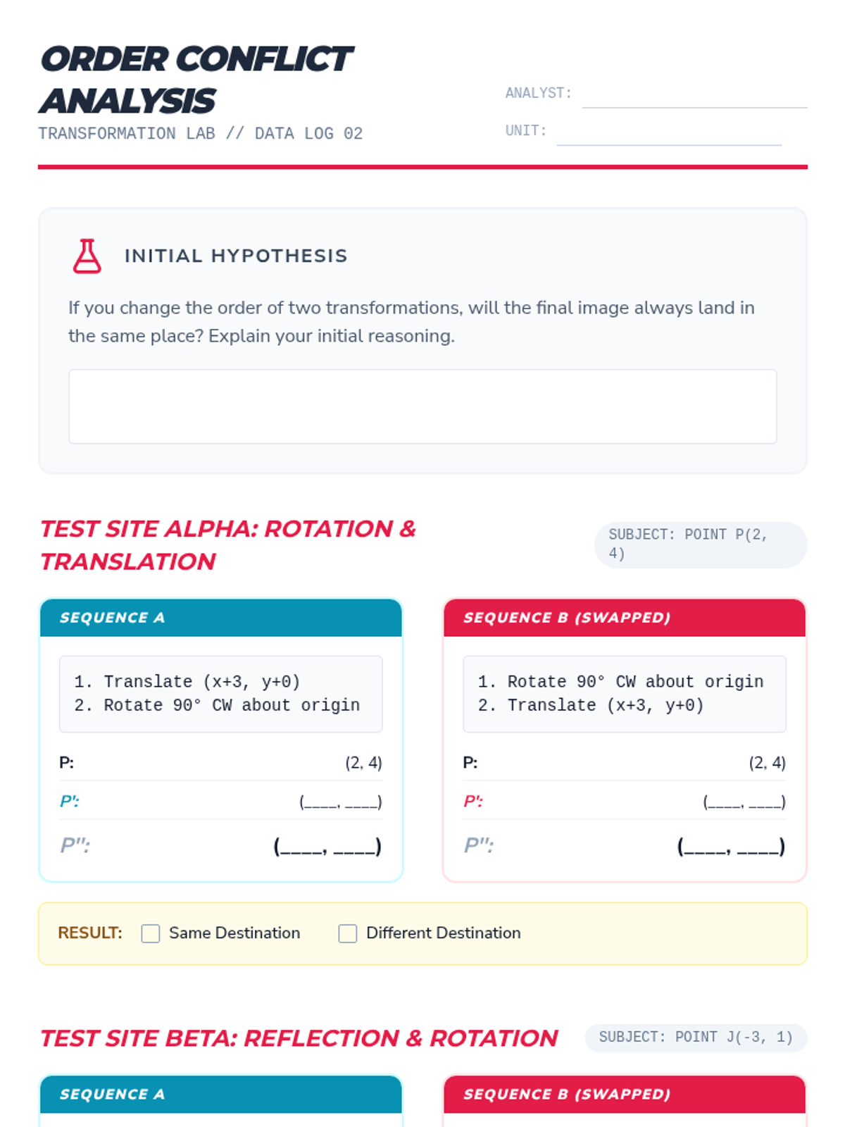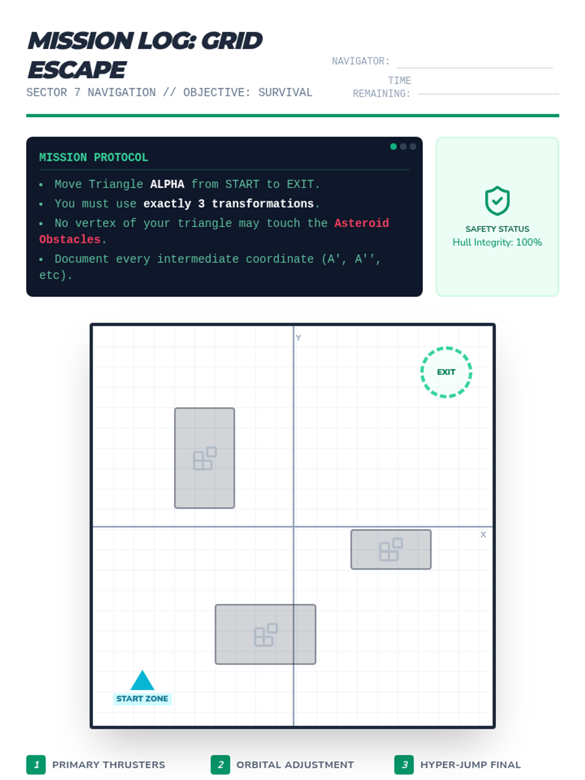 A game-based exploration of composite geometric transformations where students act as navigators, programming shapes through coordinate mazes and investigating how the order of transformations affects final positions.