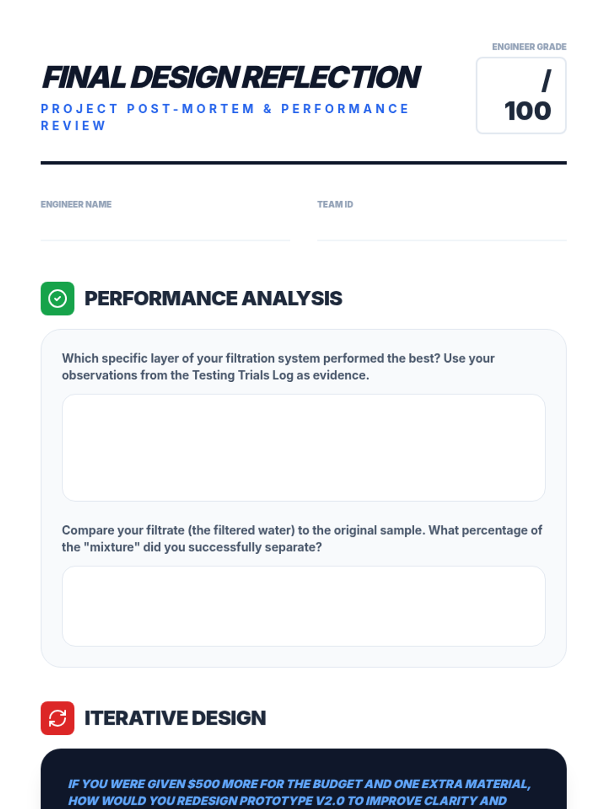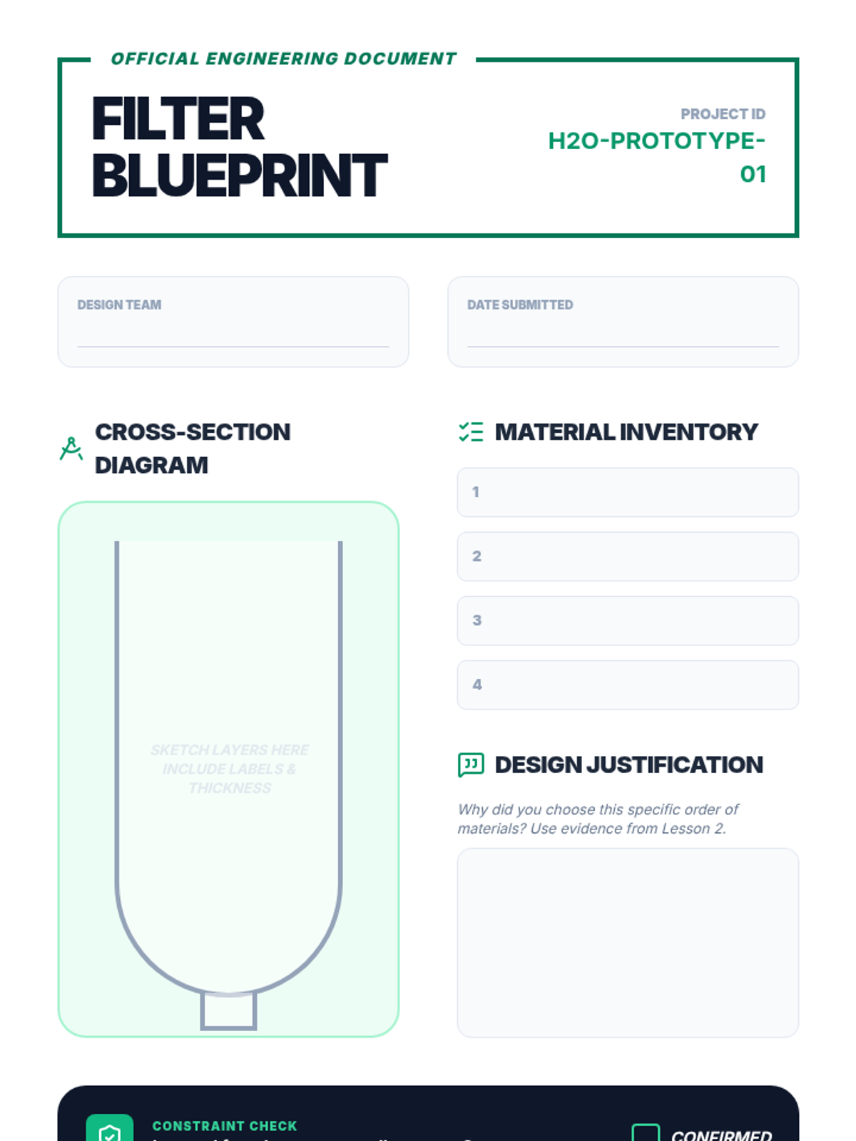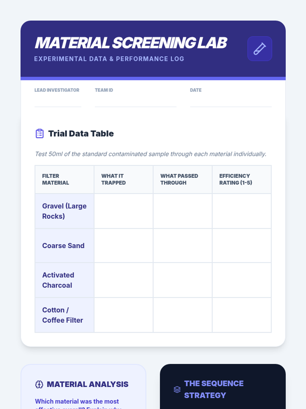 A 5-lesson engineering sequence where 7th-grade students analyze contaminated water, investigate filtration materials, and design, build, and test multi-stage filtration systems to explore separation science.