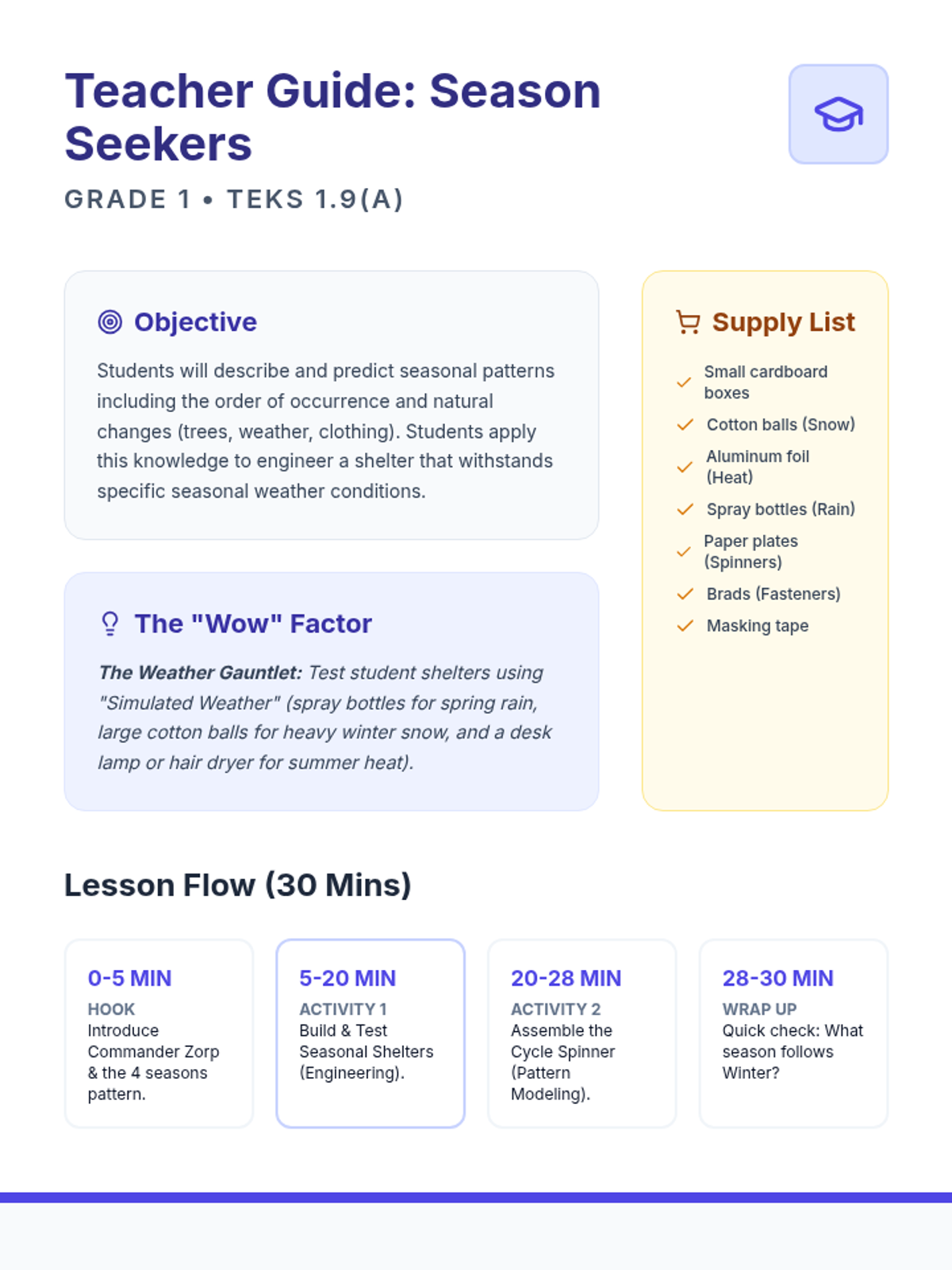 A comprehensive STEM and engineering unit focused on weather and climate TEKS for 1st through 5th grade. Each grade features two 30-minute hands-on activities, engineering challenges, and STAAR-aligned review questions designed to solve real-world weather problems.