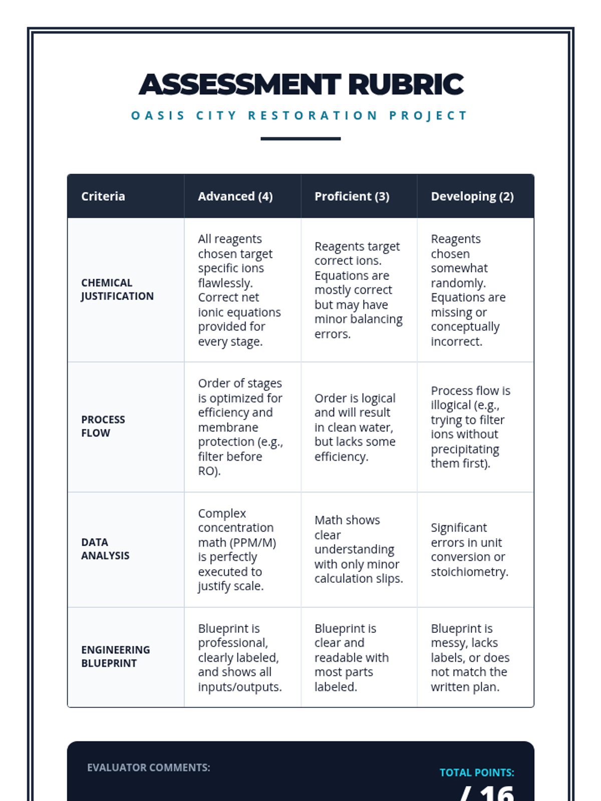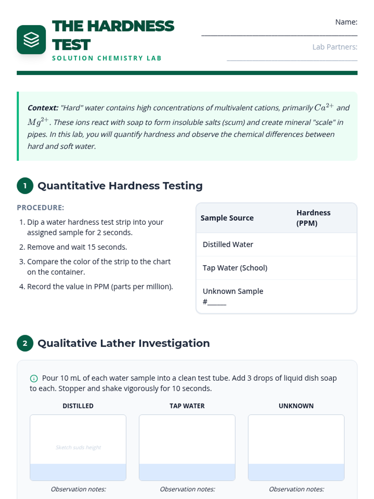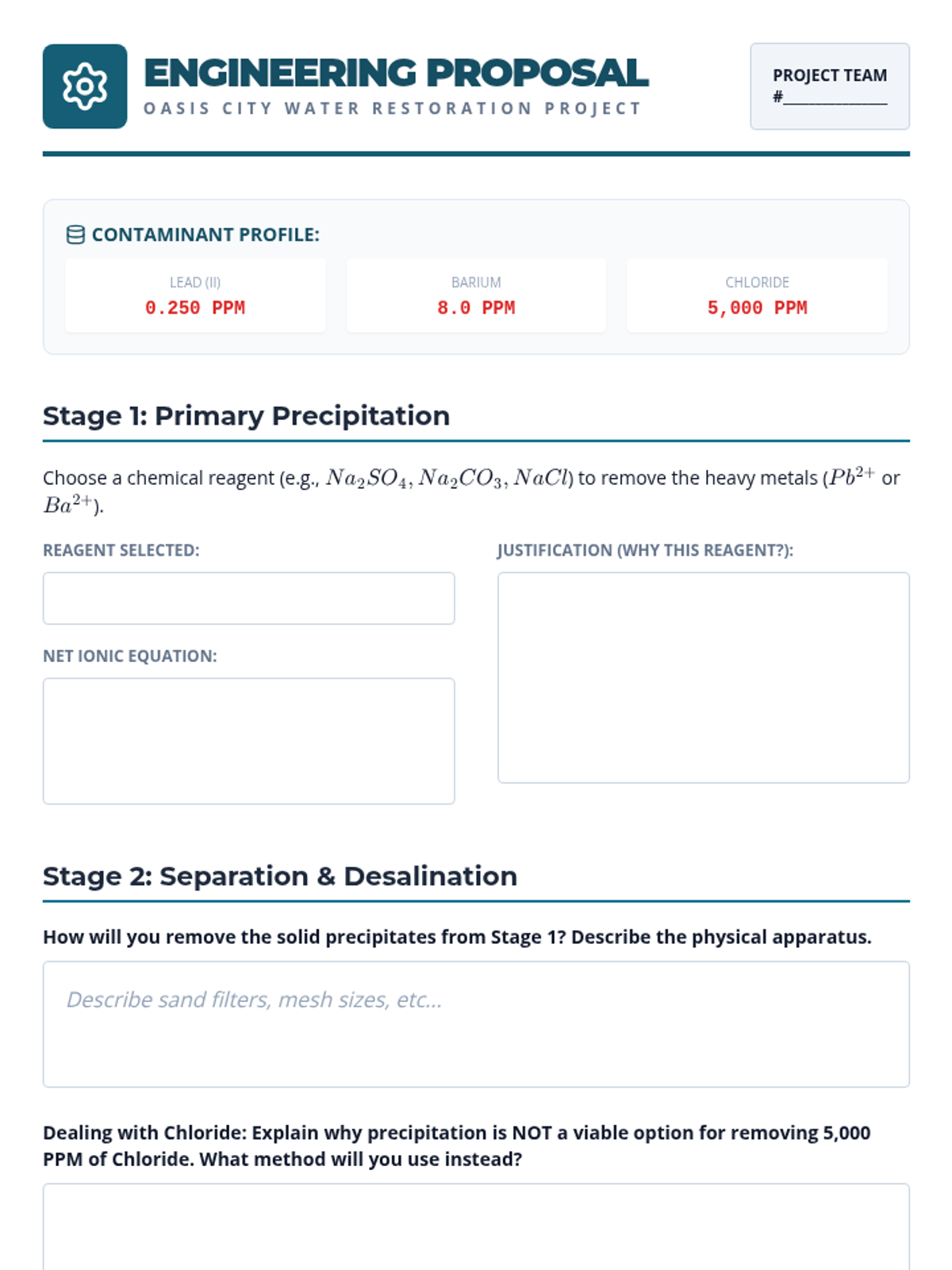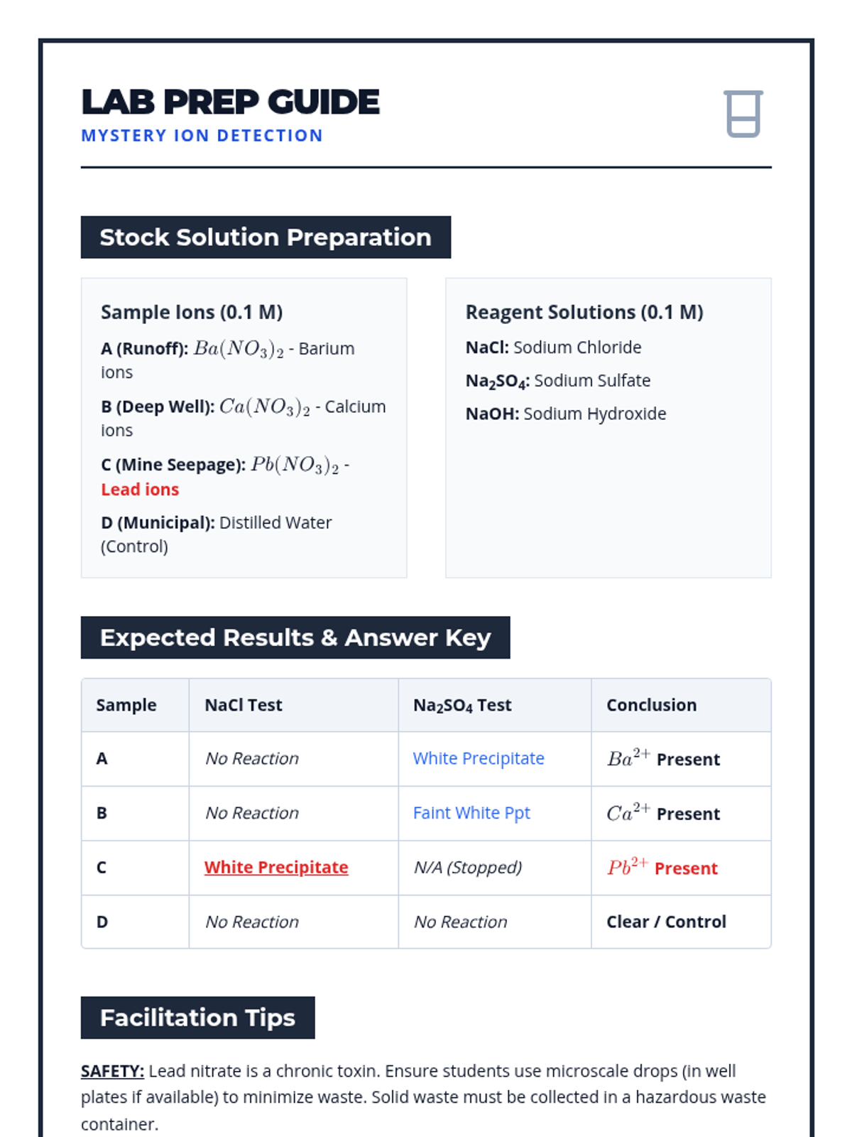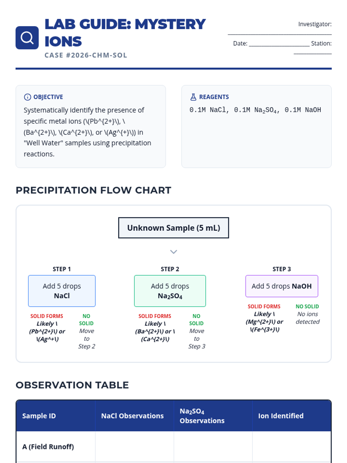 A project-based chemistry sequence exploring solutions through the lens of water quality. Students learn to quantify contaminants using PPM and Molarity, identify ions via precipitation, understand hard water chemistry, and design treatment systems.